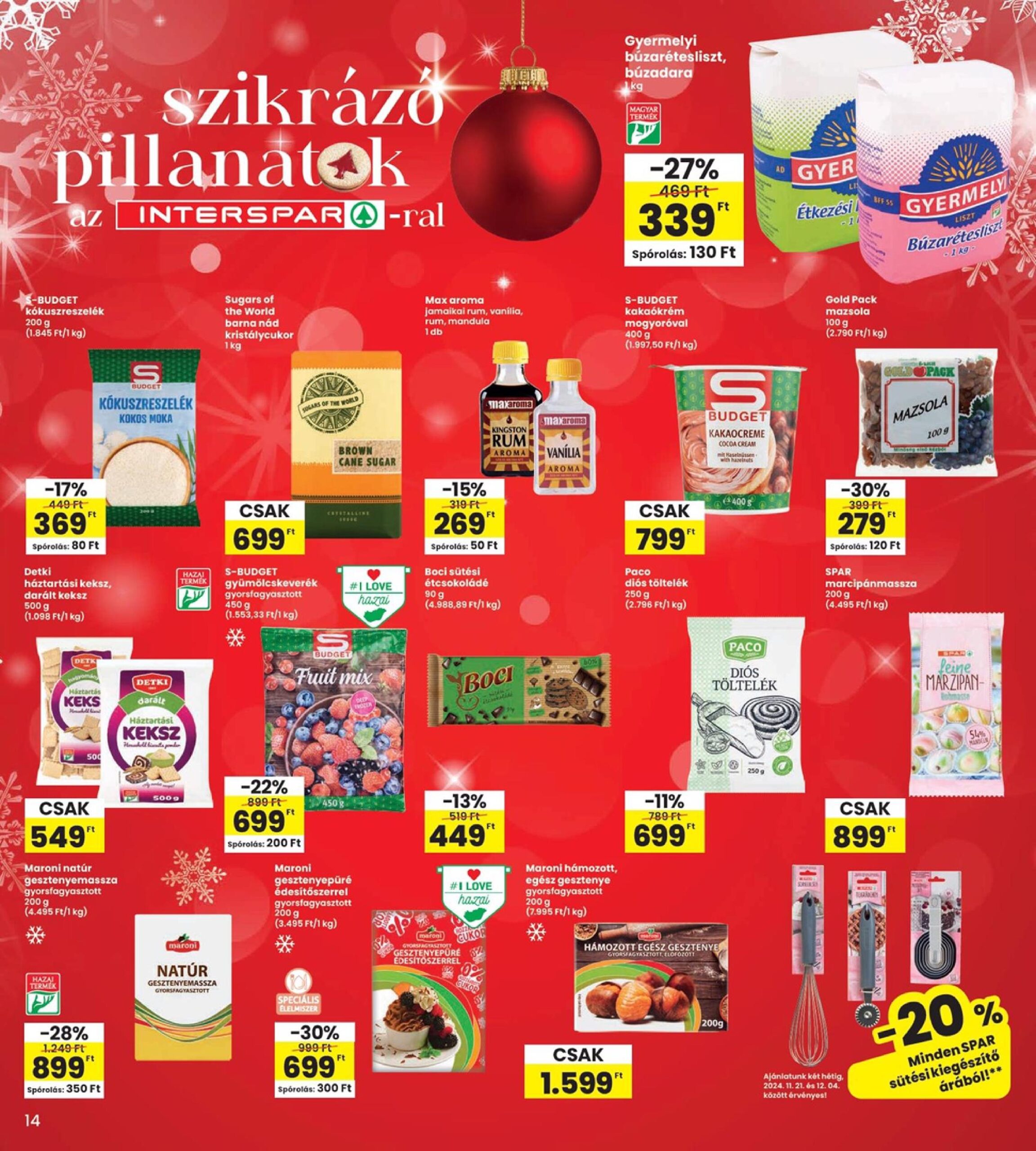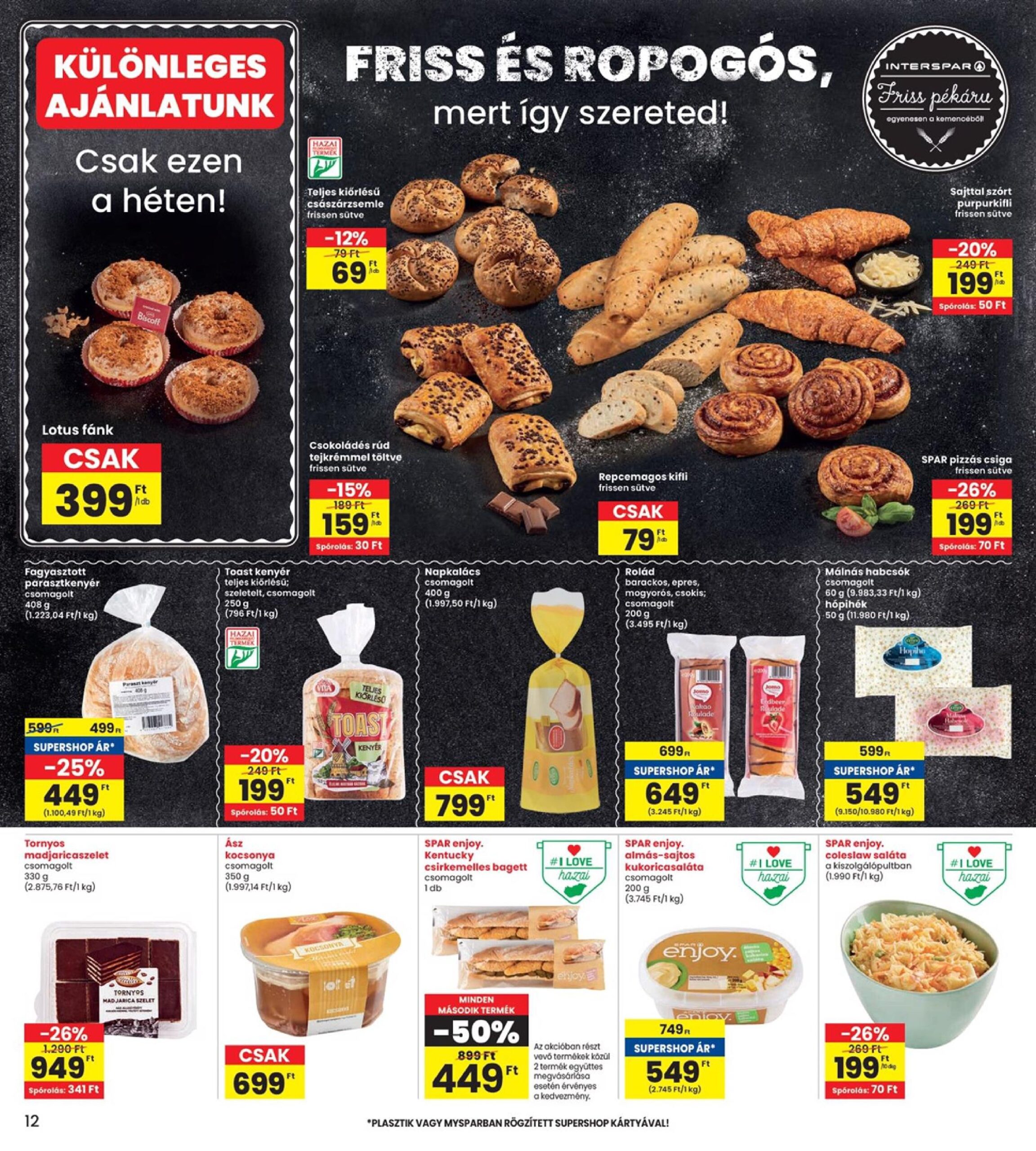 FRISS ÉS ROPOGÓS, mert így szereted! INTERSPAR✪ Friss pékáru egyenesen a kemencéből! KÜLÖNLEGES AJÁNLATUNK Csak ezen a héten! HAZAI TERMEK Teljes kiőrlésű császárzsemle frissen sütve -12% _79 Ft 699 G Biscoff Lotus fánk CSAK 3999 Fagyasztott parasztkenyér csomagolt 408 g (1.223,04 Ft/1 kg) Toast kenyér teljes kiőrlésű; Csokoládés rúd tejkrémmel töltve frissen sütve szeletelt, csomagolt 250 g (796 Ft/1 kg) HAZAI TERMEK -15% 189 Ft 159 Ft db Spórolás: 30 Ft 599 499Ft SUPERSHOP ÁR -25% 449 Ft (1.100,49 Ft/1 kg) Tornyos madjaricaszelet csomagolt 330 g (2.875,76 Ft/1kg) Paraszt kanye -20% 199* 249 Ft Spórolás: 50 Ft Ász kocsonya csomagolt 350 g (1.997,14 Ft/1 kg) VITA TELJES KIŐRLÉSÜ TOAST KENYÉR KOCSONYA Sajttal szórt purpurkifli frissen sütve -20% 249 Ft 199 Ft Ndo Spórolás: 50 Ft SPAR pizzás csiga frissen sütve -26% 269 Ft 1999 Spórolás: 70 Ft Napkalács csomagolt 400 g (1.997,50 Ft/1 kg) Repcemagos kifli frissen sütve CSAK Ft 799 Rolád barackos, epres, mogyorós, csokis; csomagolt 200 g (3.495 Ft/1 kg) Málnás habcsók csomagolt 60 g (9.983,33 Ft/1 kg) hópihék 50 g (11.980 Ft/1 kg) Hopiha CSAK Ft 799** SPAR enjoy. Kentucky #I LOVE csirkemelles bagett csomagolt hazai 1db Jomo Jomo Kakao Roulade Erdbeer Roulade Mal 699Ft SUPERSHOP ÁR⭑ Ft 649** (3.245 Ft/1kg) SPAR enjoy. almás-sajtos kukoricasaláta csomagolt 200 g (3.745 Ft/1kg) #I LOVE hazai 599Ft SUPERSHOP ÁR* 549″ (9.150/10.980 Ft/1kg) SPAR enjoy. coleslaw saláta a kiszolgálópultban (1.990 Ft/1 kg) #1 LOVE hazai enjoy. -26% 1.290 Ft 949″ Spórolás: 341 Ft 12 TORNYOS HADJARICA SZELET CSAK 699* of t MINDEN MÁSODIK TERMÉK -50% 899 Ft Ft 449Ft enjoy Az akcióban részt vevő termékek közül 2 termék együttes megvásárlása esetén érvényes a kedvezmény. enlov 749R SUPERSHOP ÁR⭑ 549″ (2.745 Ft/1kg) *PLASZTIK VAGY MYSPARBAN RÖGZÍTETT SUPERSHOP KÁRTYÁVAL! -26% 269 Ft 199 Ft Nodig Spórolás: 70 Ft