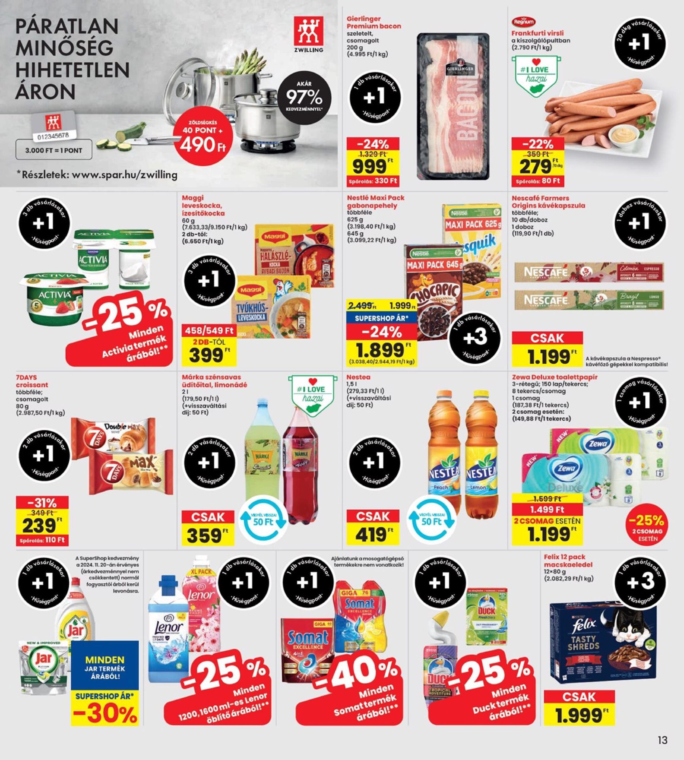 PÁRATLAN MINŐSÉG HIHETETLEN ÁRON ☑ ZWILLING AKÁR 97% KEDVEZMÉNNYEL He Gierlinger Premium bacon szeletelt, csomagolt 200 g (4.995 Ft/1 kg) 9P asárlásakor +1 Hűségpont -24% 1.329 Ft 999″ Spórolás: 330 Ft Nestlé Maxi Pack gabonapehely többféle 625 g (3.198,40 Ft/1 kg) 645 g (3.099,22 Ft/1 kg) Nestle GIERLINGER BACON Nestle MAXI PACK 625 g MAXI PACK 645g squik Regnum Frankfurti virsli a kiszolgálópultban (2.790 Ft/1 kg) #I LOVE hazai -22% 359 Ft 279 Ft ho dig Spórolás: 80 Ft Nescafé Farmers Origins kávékapszula többféle; 10 db/doboz 1 doboz (119,90 Ft/1 db) 012345678 3.000 FT = 1 PONT *Részletek: www.spar.hu/zwilling seb vásárlásáh 3 db sárlásakor +1 Hüségpont ACTIVA ACTIVIA ZÖLDSÉGKÉS 40 PONT + 490 Ft Maggi leveskocka, Ízesítőkocka 60 g (7.633,33/9.150 Ft/1 kg) 2 db-tól: (6.650 Ft/1kg) 3 db vás sárlásakor Maggi Magyarks HALÁSZLÓ- KOCKA vásárlásakor 20 dkg v +1 Hűségpont I doboz Vásárlásaka +1 Hűségport BIG #I LOVE hazai 2.499 FL 1.999 SUPERSHOP ÁR* -24% 1.899** (3.038,40/2.944,19 Ft/1 kg) Nestea 1,51 (279,33 Ft/11) (+visszaváltási dij: 50 Ft) 7DAYS croissant többféle; csomagolt 80 g ACTIVIA (2.987,50 Ft/1kg) 2 db vásárlásakor +1 Hüségpont -31% 349 Ft Ft 239″ Spórolás: 110 Ft 1 db v ásárlásakor +1 Hűségpont NEW & IMPROVED -25% Minden Activia termék árából!** Double max 7 DAYS A SuperShop kedvezmény a 2024. 11. 20-án érvényes (árkedvezménnyel nem csökkentett) normál fogyasztói árból kerül Jar levonásra. Max +1 Hiségport 458/549 Ft 2DB-TÓL 399″ Márka szénsavas Maggi EVBACI BUJON TVÚKHÚS- LEVESKOCKA üdítőital, limonádé 21 (179,50 Ft/11) (+visszaváltási dij: 50 Ft) 2 db lb vásárlásáé +1 Hüségpont XL PACK FACE Lenor CLUME CRAPE db vo MARKA MARKA 14-464 db CSAK 359** lenor VIGYEL VISSZAI 50 Ft vásárlásakor +1 Hüségpont Jar MINDEN JAR TERMÉK ÁRÁBÓL! SUPERSHOP ÁR* -30% -25% Minden 1200,1600 ml-es Lenor öblítő árából!** ab vásárlásoka +1 Hűségpont GIGA Somat EXCELLENCE 401 2 db vá Vásárlásakor NESCAFE Colombia ESPRESSO HOCAPIC NESCAFE. Brazil O vásárlásokon +3 Hűségpont +1 Hüségpont NESTE NESTEA Peacht temon CSAK 419** Ajánlatunk a mosogatógépsó termékekre nem vonatkozik! GIGA 76 Somat EXCELLENCE 40% Minden Somat termék árából!** VICYEL VISSZA 50 Ft 1 db eb vásárlásoka +1 Hűségpont DUC ELEANING & TROPICAL ADVENTURE CSAK 1.199Ft A kávékapszula a Nespresso” kávéfőző gépekkel kompatibilis! Zewa Deluxe toalettpapír 3-rétegű; 150 lap/tekercs; 8 tekercs/csomag 1 csomag (187,38 Ft/1 tekercs) 2 csomag esetén: (149,88 Ft/1 tekercs) csomag vásárlásakor +1 Hűségpont NEW NEW Zewa DUCK Fresh Docs Zewa Deluxe 1.599 Ft 1.499 Ft 2 CSOMAG ESETÉN 1.199*t Felix 12 pack macskaeledel 12×80 g (2.082,29 Ft/1 kg) felix TASTY SHREDS db -> -25% 2 CSOMAG ESETÉN Vásárlásakor +3 Hüségpont 25% Minden Duck termék árából!** CSAK 1.999* 13