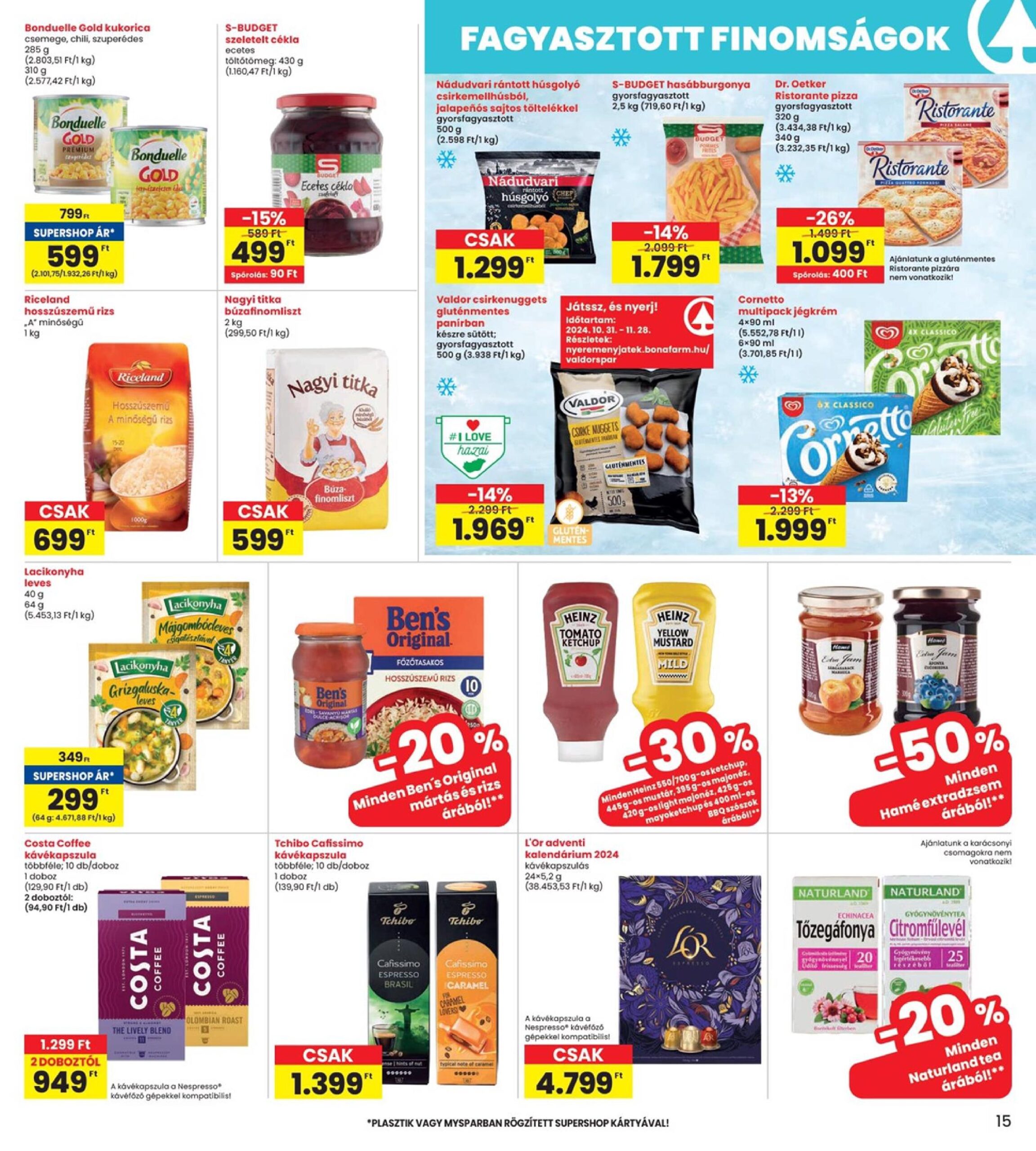 Bonduelle Gold kukorica csemege, chili, szuperédes 285 g (2.803,51 Ft/1 kg) 310 g (2.577,42 Ft/1 kg) S-BUDGET szeletelt cékla ecetes töltötömeg: 430 g (1.160,47 Ft/1 kg) FAGYASZTOTT FINOMSÁGOK Nádudvari rántott húsgolyó csirkemellhúsból, jalapeñós sajtos töltelékkel gyorsfagyasztott 500 g (2.598 Ft/1 kg) S-BUDGET hasábburgonya gyorsfagyasztott 2,5 kg (719,60 Ft/1 kg) BUDGET POMMES PRITES Dr. Oetker Ristorante pizza gyorsfagyasztott 320 g (3.434,38 Ft/1 kg) 340 g (3.232,35 Ft/1 kg) Ox Opther A Ristorante Ristorante Bonduelle GOLD PREMIUM comperider 799Ft SUPERSHOP ÁR⭑ 599″ (2.101,75/1.932,26 Ft/1kg) Riceland hosszúszemű rizs *A* minőségű 1 kg CSAK 699 Lacikonyha leves 40 g Ft Bonduelle GOLD fanétaejeten éde Riceland Hosszúszemű A minőségű rizs 15-20 DOL 1000g -15% 589 Ft 499* Spórolás: 90 Ft Nagyi titka búzafinomliszt 2 kg (299,50 Ft/1 kg) S BUDGET Ecetes cékla Nagyi titka Nádudvari rintott CHEF húsgolyó CSAK 1.299″ Valdor csirkenuggets gluténmentes panírban készre sütött; gyorsfagyasztott 500 g (3.938 Ft/1 kg) -14% 2.099 Ft 1.799** Játssz, és nyerj! Időtartam: 2024. 10. 31. – 11.28. Részletek: nyeremenyjatek.bonafarm.hu/ valdorspar -26% 1.499 Ft 1.099″ Spórolás: 400 Ft Cornetto multipack jégkrém 4×90 ml (5.552,78 Ft/11) 6×90 ml (3.701,85 Ft/11) Ajánlatunk a gluténmentes Ristorante pizzára nem vonatkozik! CSAK 599* Búza- finomliszt #I LOVE hazai -14% 2,299 Ft 1.969** VALDOR CSIRKE NUGGETS SAMENTES PARA GLUTEN- MENTES GLUTÉNMENTES 500, X CLASSICO AX CLASSICO Greatty Corretto -13% -2.299 Ft 1.999* 64g (5.453,13 Ft/1 kg) Lacikonyha Majgombóceves Lacikonyha Grizgaluska leves csigalésztával 349 Ft SUPERSHOP ÁR* 299** (64 g: 4.671,88 Ft/1kg) Costa Coffee kávékapszula többféle; 10 db/doboz 1 doboz (129,90 Ft/1 db) 2 doboztól: (94,90 Ft/1 db) COSTA COFFEE COSTA COFFEE Ben’s Original DES-SAVANT MAR DULCE ACRIS Ben’s Original FÖZÖTASAKOS HOSSZÚSZEMŰ RIZS 10 +20% Minden Ben’s Original Tchibo Cafissimo kávékapszula többféle; 10 db/doboz mártás és rizs árából!** 1 doboz (139,90 Ft/1 db) HEINZ TOMATO KETCHUP HEINZ YELLOW MUSTARD MILD Named Edra Jam MARICA Hom Edra Jam APONTA COCOA న -30% Minden Heinz 550/700g-os ketchup, 445g-os mustár, 395g-os majonéz, 420g-os light majonéz, 425g-os BBQ szószok mayoketchupés 400 ml-es árából!** L’Or adventi kalendárium 2024 kávékapszulás 24×5,2 g (38.453,53 Ft/1 kg) -50% Minden Hamé extradzsem árából!** Ajánlatunk a karácsonyi csomagokra nem vonatkozik! Tchibo Tchibo Cafissimo ESPRESSO BRASIL Cafissimo ESPRESSO CARAMEL FOR CARAMEL LOVERS 1.299 Ft 2 DOBOZTÓL 949″ THE LIVELY BLEND OLOMBIAN ROAST A kávékapszula a Nespresso® kávéfőző gépekkel kompatibilis! CSAK 1.399″ se hints of mut typical note of caramel A kávékapszula a Nespresso® kávéfőző gépekkel kompatibilis! CSAK 4.799″ *PLASZTIK VAGY MYSPARBAN RÖGZÍTETT SUPERSHOP KÁRTYÁVAL! LOR NATURLAND ECHINACEA NATURLAND GYÓGYNÖVÉNYTEA Tőzegáfonya Citromfűlevél Cimkény gygynövénnyel 20 EXPATISO Uditó frissesség eller Gyógynoveny Irgértékesebb részéből 25 -20% Minden Naturland tea árából!** 15