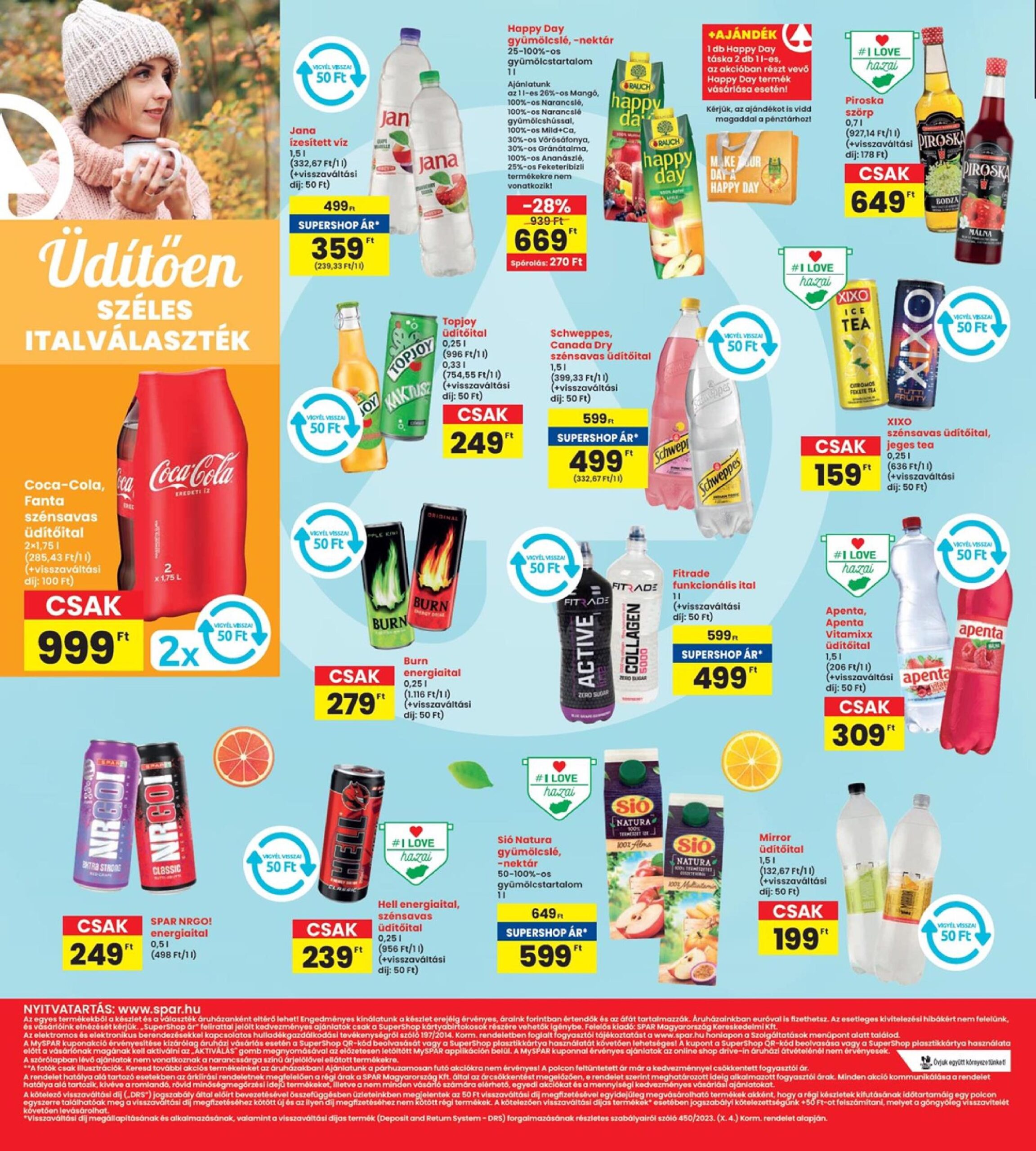Jana VIGYÉL VISSZA 50 Ft ízesített víz 1,51 (332,67 Ft/11) (+visszaváltási dij: 50 Ft) 499RL SUPERSHOP ÁR* 359″ (239,33 Ft/11) Jan Jana Happy Day gyümölcslé, -nektár 25-100%-os gyümölcstartalom 11 Ajánlatunk az 11-es 26%-os Mangó, 100%-os Narancslé, 100%-os Narancslé gyümölcshússal, 100%-os Mild+Ca, 30%-os Vörösáfonya, 30%-os Gránátalma, 100%-os Ananászlé, 25%-os Feketeribizli termékekre nem vonatkozik! -28% 939 Ft 669″ Spórolás: 270 Ft RAUCH happy da RALICH +AJÁNDÉK 1 db Happy Day táska 2 db 11-es, az akcióban részt vevő Happy Day termék vásárlása esetén! Kérjük, az ajándékot is vidd magaddal a pénztárhoz! happy MAKEUR day 100% Apher DAY A HAPPY DAY #I LOVE hazai Piroska szörp 0,71 (927,14 Ft/11) (+visszaváltási PIROSKA dij: 178 Ft) CSAK 649″ BODZA PIROSKA Üdítően SZÉLES ITALVÁLASZTÉK Coca-Cola, ca Fanta szénsavas üdítőital 2×1,75 (285,43 Ft/11) (+visszaváltási dij: 100 Ft) CSAK Ft Coca-Cola 2 KREDETI 12 x 1,75 L 999 2x VIGYEL VISSZA! 50 Ft JOY TOPJOY KAKTUS VIGYEL VISSZAL 50 Ft PPLE KIW ORIGINAL Topjoy üdítőital 0,251 (996 Ft/11) 0,331 (754,55 Ft/11) (+visszaváltási díj: 50 Ft) CSAK 249″ Schweppes, Canada Dry szénsavas üdítőital VIGYEL VISSZA 50 Ft 1,51 (399,33 Ft/11) (+visszaváltási dij: 50 Ft) 599 Ft SUPERSHOP ÁR⭑ 499Ft (332,67 Ft/11) Schwep Schweppes VIGYEL VISSZA 50 Ft BURN BURN CSAK 279ft Burn energiaital 0,251 (1.116 Ft/11) (+visszaváltási díj: 50 Ft) VIGYEL VISSZA 50 Ft FITRADE ACTIVE COLLAGEN 5000 ZERO SUGAR #I LOVE hazai XIXO ICE TEA XIXO CITROMOS FEKETE TEA TUTTI FRUITY MALNA VIGYÉL VISSZAI 50 Ft CSAK Ft XIXO szénsavas üdítőital, jeges tea 0,251 (636 Ft/11) 159 (+visszaváltási díj: 50 Ft) #I LOVE hazai VIGYEL VISSZA 50 Ft Fitrade FITRADE funkcionális ital ZERO SUGAR 11 (+visszaváltási díj: 50 Ft) 599R SUPERSHOP ÁR⭑ 499** Apenta, Apenta Vitamixx üdítőital 1,51 (206 Ft/11) (+visszaváltási apenta díj: 50 Ft) CSAK 309** apenta MALNA PAL SPAR NRGOI NRGO EXTRA STRONG CLASSIC CSAK SPAR NRGO! energiaital Ft 0,51 249 ft (498 Ft/11) VIGYEL VISSZA 50 Ft HE #I LOVE hazai CSAK 239Ft Hell energiaital, szénsavas Üdítőital 0,251 (956 Ft/11) (+visszaváltási dij: 50 Ft) #I LOVE hazai Sió Natura gyümölcslé, -nektár 50-100%-os gyümölcstartalom 11 649Ft SUPERSHOP ÁR* 599** Sió NATURA 100% TERMESZET IDE 100% Alma Sió NATURA 100% Malistamin Mirror Üdítőital 1,51 (132,67 Ft/11) (+visszaváltási díj: 50 Ft) CSAK 199** VIGYEL VISSZAI 50 Ft NYITVATARTÁS: www.spar.hu Az egyes termékekből a készlet és a választék áruházanként eltérő lehet! Engedményes kínálatunk a készlet erejéig érvényes, áraink forintban értendők és az áfát tartalmazzák. Áruházainkban euróval is fizethetsz. Az esetleges kivitelezési hibákért nem felelünk, és vásárlóink elnézését kérjük. „SuperShop ár felirattal jelölt kedvezményes ajánlatok csak a SuperShop kártyabirtokosok részére vehetők igénybe. Felelős kiadó: SPAR Magyarország Kereskedelmi Kft. Az elektromos és elektronikus berendezésekkel kapcsolatos hulladékgazdálkodási tevékenységről szóló 197/2014. Korm. rendeletben foglalt fogyasztói tájékoztatást a www.spar.hu honlapon a Szolgáltatások menüpont alatt találod. A MySPAR kuponakció érvényesítése kizárólag áruház vásárlás esetén a SuperShop QR-kód beolvasását vagy a SuperShop plasztikkártya használatát követően lehetséges! A kupont a SuperShop QR-kód beolvasása vagy a SuperShop plasztikkártya használata előtt a vásárlónak magának kell aktiválni az „AKTIVÁLÁS” gomb megnyomásával az előzetesen letöltött MySPAR applikáción belül. A MySPAR kuponnal érvényes ajánlatok az online shop drive-in áruházi átvételénél nem érvényesek. A szórólapban lévő ajánlatok nem vonatkoznak a narancssárga színű árjelölővel ellátott termékekre. **A fotók csak illusztrációk. Keresd további akciós termékeinket az áruházakban! Ajánlatunk a párhuzamosan futó akciókra nem érvényes! A polcon feltüntetett ár már a kedvezménnyel csökkentett fogyasztói ár. Ovjuk együtt környezetünket! A rendelet hatálya alá tartozó esetekben az árkiírási rendeletnek megfelelően a régi árak a SPAR Magyarország Kft. által az árcsökkentést megelőzően, e rendelet szerint meghatározott ideig alkalmazott fogyasztói árak. Minden akció kommunikálása a rendelet hatálya alá tartozik, kivéve a romlandó, rövid minőségmegőrzési idejú termékeket, illetve a nem minden vásárló számára elérhető, egyedi akciókat és a mennyiségi kedvezményes vásárlási ajánlatokat. A kötelező visszaváltási díj (DRS) jogszabály által elóirt bevezetésével összefüggésben üzleteinkben megjelentek az 50 Ft visszaváltási díj megfizetésével egyidejüleg megvásárolható termékek akként, hogy a régi készletek kifutásának időtartamáig egy polcon egyszerre találhatóak meg a visszaváltási díj megfizetéséhez kötött új és az ilyen dij megfizetéséhez nem kötött régi termékek. A kötelezően visszaváltási díjas termékek esetében jogszabályi kötelezettségünk +50 Ft-ot felszámítani, melyet a göngyöleg visszavitelét követően levásárolhat. *Visszaváltási díj megállapításának és alkalmazásának, valamint a visszaváltási díjas termék (Deposit and Return System – DRS) forgalmazásának részletes szabályairól szóló 450/2023. (x. 4.) Korm. rendelet alapján.