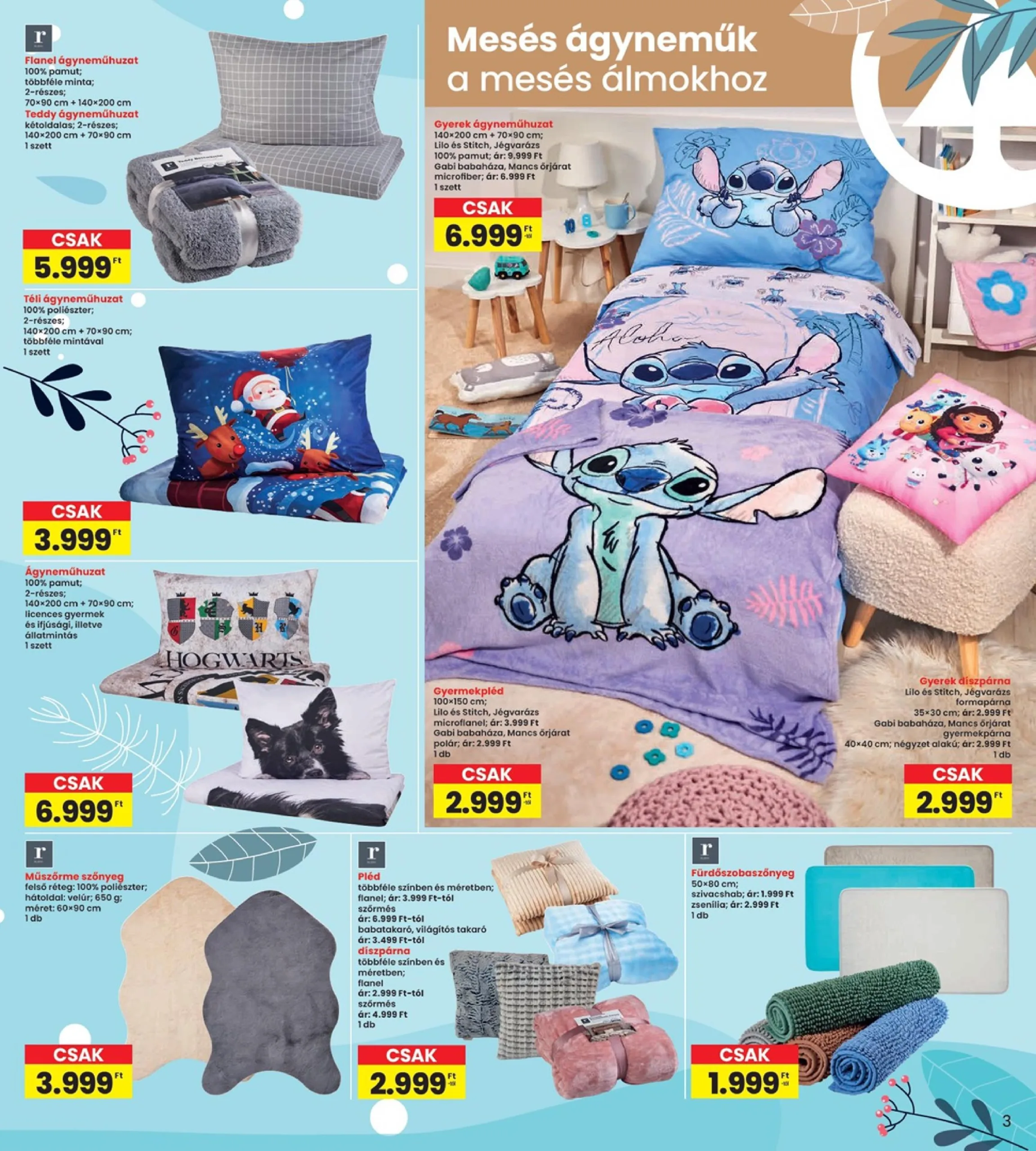 - Téli ágyneműhuzat: 100% poliészter; 2-részes; 140×200 cm + 70×90 cm; többféle mintával; ár: 3.999 Ft