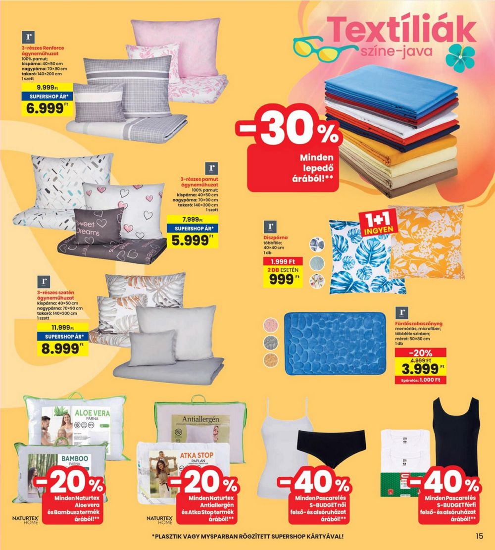 r 3-részes Renforce ágyneműhuzat 100% pamut; kispárna: 40×50 cm nagypárna: 70×90 cm takaró: 140×200 cm 1 szett 9.999 SUPERSHOP AR 6.999″ NATURTEX Textíliák színe-java Sweet Dreams r 3-részes pamut ágyneműhuzat 100% p 40mut kispárna: 40-50 cm nagypárna: 70×90 cm takaró: 140×200 cm 1 szett 7.999Ft SUPERSHOP AR* 5.999″ -30% r Díszpárna többféle; Minden lepedő árából!** r 3-részes szatén ágyneműhuzat kispárna: 40×50 cm nagypárna: 70×90 cm takaró: 140-200 cm 1szott 11.999Ft SUPERSHOP ÁR⭑ 8.999″ HOME ALOE VERA PARNA Antiallergén BAMBOO PARNA 20% Minden Naturtex Aloevera és Bambusz termék árából!** 40x40cm 1db 1.999 Ft 2DB ESETÉN 999 1+1 INGYEN I Fürdőszobaszőnyeg memóriás, microfiber, többféle színben; méret: 50×80 cm 1db -20% 4.999 Ft 3.999 Spórolás: 1.000 Ft NATURTEX HOME ATKA STOP PAPLAN 20% Minden Naturtex Antiallergén és Atka Stop termék árából!** -40% Minden Pascarelés S-BUDGET nöi felső-és alsóruházat árából!** *PLASZTIK VAGY MYSPARBAN RÖGZÍTETT SUPERSHOP KÁRTYÁVAL! -40% Minden Pascarelés S-BUDGETférfi felső-és alsóruházat árából!** 15