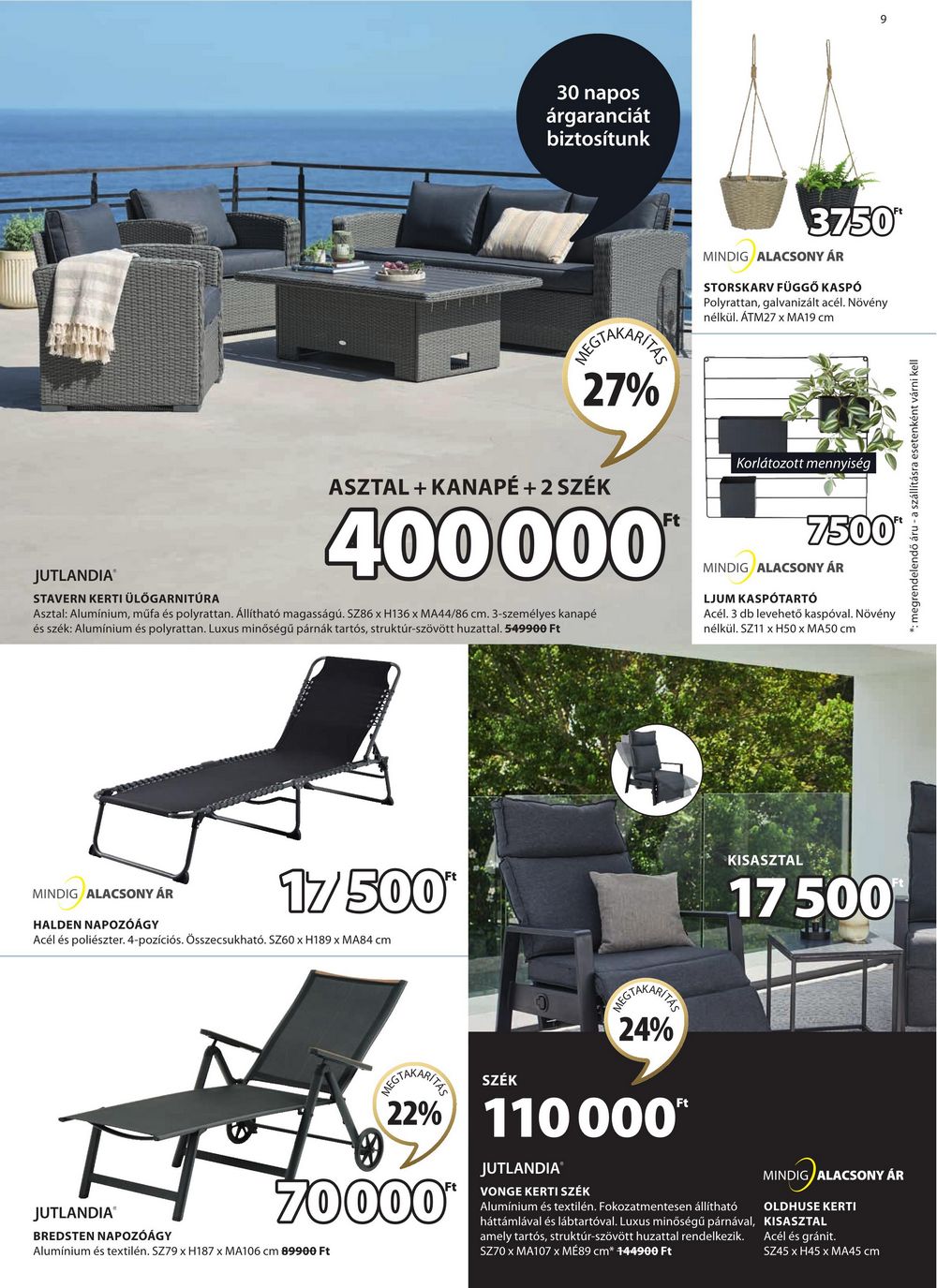 30 napos árgaranciát biztosítunk HEGTAKARITES 27% 3750 MINDIG ALACSONY ÁR STORSKARV FÜGGŐ KASPÓ Polyrattan, galvanizált acél. Növény nélkül. ÁTM27 x MA19 cm JUTLANDIA STAVERN KERTI ÜLŐGARNITÚRA ASZTAL + KANAPÉ + 2 SZÉK 400000* Asztal: Alumínium, műfa és polyrattan. Állítható magasságú. SZ86 x H136 x MA44/86 cm. 3-személyes kanapé és szék: Alumínium és polyrattan. Luxus minőségű párnák tartós, struktúr-szövött huzattal. 549900 Ft Korlátozott mennyiség 7500 MINDIG ALACSONY ÁR LJUM KASPÓTARTÓ Acél. 3 db levehető kaspóval. Növény nélkül. SZ11 x H50 x MA50 cm MINDIG ALACSONY ÁR HALDEN NAPOZÓÁGY 17500″ Acél és poliészter. 4-pozíciós. Összecsukható. SZ60 x H189 x MA84 cm JUTLANDIA BREDSTEN NAPOZÓÁGY REGTAKARITZE 24% MEGTAKARITZA SZÉK 22% 110 000 70000** Alumínium és textilén. SZ79 x H187 x MA106 cm 89900 Ft JUTLANDIA VONGE KERTI SZÉK Ft KISASZTAL 17 500 Alumínium és textilén. Fokozatmentesen állítható háttámlával és lábtartóval. Luxus minőségű párnával, amely tartós, struktúr-szövött huzattal rendelkezik. SZ70 x MA107 x MÉ89 cm* 144900 Ft MINDIG ALACSONY ÁR OLDHUSE KERTI KISASZTAL Acél és gránit. SZ45 x H45 x MA45 cm megrendelendő áru – a szállításra esetenként várni kell 9