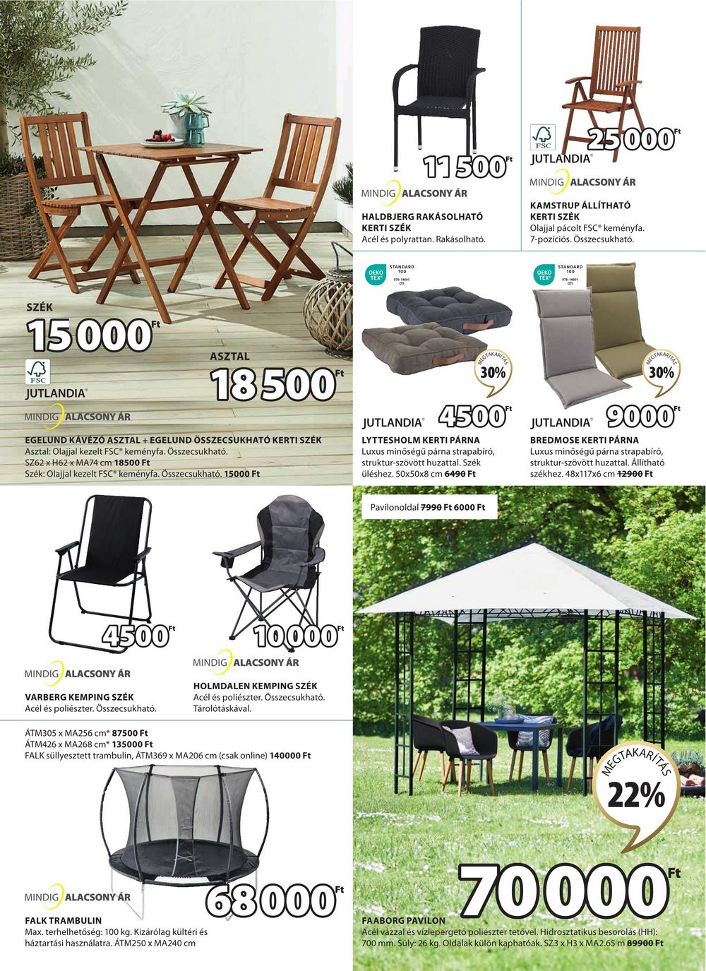 11500* MINDIG ALACSONY ÁR HALDBJERG RAKÁSOLHATÓ KERTI SZÉK Acél és polyrattan. Rakásolható. FSC JUTLANDIA 7000 MINDIG ALACSONY ÁR KAMSTRUP ÁLLÍTHATÓ KERTI SZÉK Olajjal pácolt FSC® keményfa. 7-pozíciós. Összecsukható. OEKO TEX STANDARD OEKO TEX STANDARD SZÉK 15000™ ASZTAL 18500 FSC JUTLANDIA MINDIG ALACSONY ÁR EGELUND KÁVÉZÓ ASZTAL + EGELUND ÖSSZECSUKHATÓ KERTI SZÉK Asztal: Olajjal kezelt FSC keményfa. Összecsukható. SZ62 x H62 x MA74 cm 18500 Ft Szék: Olajjal kezelt FSC® keményfa. Összecsukható. 15000 Ft EGTAKANIZE 30% 4500″ JUTLANDIA LYTTESHOLM KERTI PÁRNA Luxus minőségű párna strapabíró, struktur-szövött huzattal. Szék üléshez. 50x50x8 cm 6490 Ft JUTLANDIA 30% 9000* BREDMOSE KERTI PÁRNA Luxus minőségű párna strapabíró, struktur-szövött huzattal. Állítható székhez. 48x117x6 cm 12900 Ft 4500″ MINDIG ALACSONY ÁR VARBERG KEMPING SZÉK Acél és poliészter. Összecsukható. ÁTM305 x MA256 cm* 87500 Ft ÁTM426 x MA268 cm* 135000 Ft 10,000* MINDIG ALACSONY ÁR HOLMDALEN KEMPING SZÉK Acél és poliészter. Összecsukható. Tárolótáskával. FALK süllyesztett trambulin, ÁTM369 x MA206 cm (csak online) 140000 Ft Pavilonoldal 7990 Ft 6000 Ft MINDIG ALACSONY ÁR FALK TRAMBULIN Max. terhelhetőség: 100 kg. Kizárólag kültéri és háztartási használatra. ÁTM250 x MA240 cm 68000* FAABORG PAVILON EGTAKARITA 22% 70000* Acél vázzal és vízlepergető poliészter tetővel. Hidrosztatikus besorolás (HH): 700 mm. Súly: 26 kg. Oldalak külön kaphatóak. SZ3 x H3 x MA2.65 m 89900 Ft