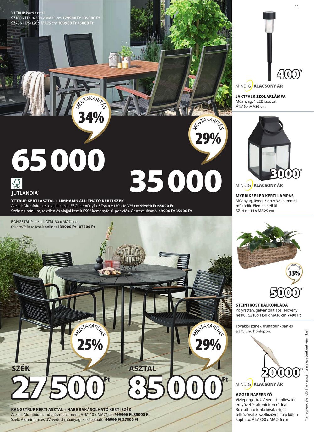YTTRUP kerti asztal SZ100 x H210/300 x MA75 cm 179900 Ft 135000 Ft SZ70 x H75/126 x MA75 cm 109900 Ft 75000 Ft EGTAKARITAS 34% 65000 REGTAKARIT 29% 35000 400* MINDIG ALACSONY ÁR JAKTFALK SZOLÁRLÁMPA Műanyag. 1 LED izzóval. ÁTM6 x MA36 cm FSC JUTLANDIA YTTRUP KERTI ASZTAL + LIMHAMN ÁLLÍTHATÓ KERTI SZÉK Asztal: Alumínium és olajjal kezelt FSC® keményfa. SZ90 x H150 x MA75 cm 99900 Ft 65000 Ft Szék: Alumínium, textilén és olajjal kezelt FSC® keményfa. 6-pozíciós. Összecsukható. 49900 Ft 35000 Ft RANGSTRUP asztal, ÁTM130 x MA74 cm, fekete/fekete (csak online) 139900 Ft 107500 Ft 3000 MINDIG ALACSONY ÁR MYRRIKSE LED KERTI LÁMPÁS Műanyag, üveg. 3 db AAA elemmel működik. Elemek nélkül. SZ14 x H14 x MA25 cm SZÉK EGTAKARITAS 25% ASZTAL EGTAKARITE 29% 27500 85000 RANGSTRUP KERTI ASZTAL + NABE RAKÁSOLHATÓ KERTI SZÉK Asztal: Aluminium, műfa és rostcement. ÁTM110 x MA74 cm 119900 Ft 85000 Ft Szék: Alumínium és UV-védett műanyag. Rakásolható. 36900 Ft 27500 Ft 33% 5000** STEINTROST BALKONLÁDA Polyrattan, galvanizált acél. Növény nélkül. SZ18 x H50 x MA16 cm 7490 Ft További színek áruházainkban és a JYSK.hu honlapon. 20000** MINDIG ALACSONY ÁR AGGER NAPERNYŐ Vízlepergető, UV-védett poliészter ernyővel és alumínium rúddal. Buktatható funkcióval, csigás felhúzóval és szellőzővel. Talp külön kapható. ÁTM300 x MA246 cm *: megrendelendő áru – a szállításra esetenként várni kell 11