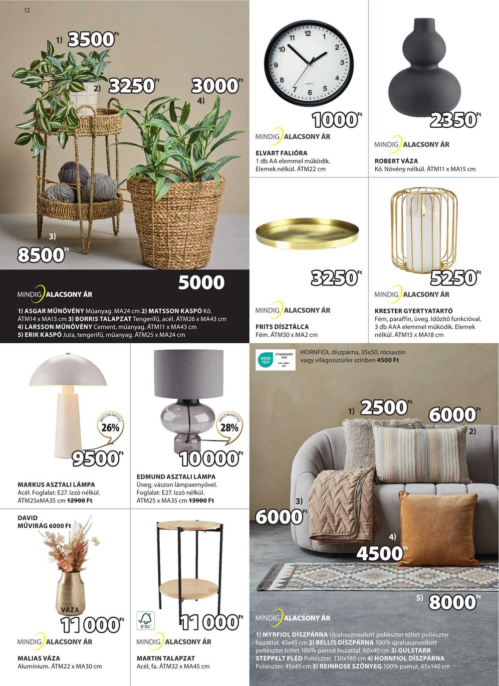 12 1) 3500″ 2) 3250 3000* 4) 10 11 12 3) 8500″ 1000* MINDIG ALACSONY ÁR ELVART FALIÓRA 1 db AA elemmel működik. Elemek nélkül. ÁTM22 cm 2350* MINDIG ALACSONY ÁR ROBERT VÁZA Kö. Növény nélkül. ÁTM11 x MA15 cm MINDIG ALACSONY ÁR ALACSONY 5000 1) ASGAR MŰNÖVÉNY Műanyag. MA24 cm 2) MATSSON KASPÓ Kō. ÁTM14 x MA13 cm 3) BORRIS TALAPZAT Tengerifű, acél. ÁTM26 x MA43 cm 4) LARSSON MŰNÖVÉNY Cement, műanyag. ÁTM11 x MA43 cm 5) ERIK KASPÓ Juta, tengerifű, műanyag. ÁTM25 x MA24 cm 3250″ MINDIG ALACSONY ÁR FRITS DÍSZTÁLCA Fém. ÁTM30 x MA2 cm OEKO TEX 5250″ MINDIG ALACSONY ÁR KRESTER GYERTYATARTÓ Fém, paraffin, üveg. Időzítő funkcióval. 3 db AAA elemmel működik. Elemek nélkül. ÁTM15 x MA18 cm STANDARD HORNFIOL díszpárna, 35×50, rózsaszín vagy világosszürke színben 4500 Ft REGTAKARITE 26% 9500* MARKUS ASZTALI LÁMPA Acél. Foglalat: E27. Izzó nélkül. ÁTM25xMA35 cm +2900 Ft DAVID MŰVIRÁG 6000 Ft REGTAKARITE 28% 10000* EDMUND ASZTALI LÁMPA Üveg, vászon lámpaernyővel. Foglalat: E27. Izzó nélkül. ÁTM25 x MA35 cm 13900 Ft 3) 6000* 1) 2500 6000™ 2) 4) 4500™ 5) 8000™ VÁZA 11000″ MINDIG ALACSONY ÁR MALIAS VÁZA Alumínium. ÁTM22x MA30 cm FSC 11000 MINDIG ALACSONY AR MINDIG ALACSONY ÁR MARTIN TALAPZAT Acél, fa. ÁTM32 x MA45 cm 1) MYRFIOL DÍSZPÁRNA Újrahasznosított poliészter töltet poliészter huzattal. 45×45 cm 2) BELLIS DÍSZPÁRNA 100% újrahasznosított poliészter töltet 100% pamut huzattal. 60×40 cm 3) GULSTARR STEPPELT PLÉD Poliészter. 130×180 cm 4) HORNFIOL DÍSZPÁRNA Poliészter. 45×45 cm 5) REINROSE SZŐNYEG 100% pamut. 65×140 cm