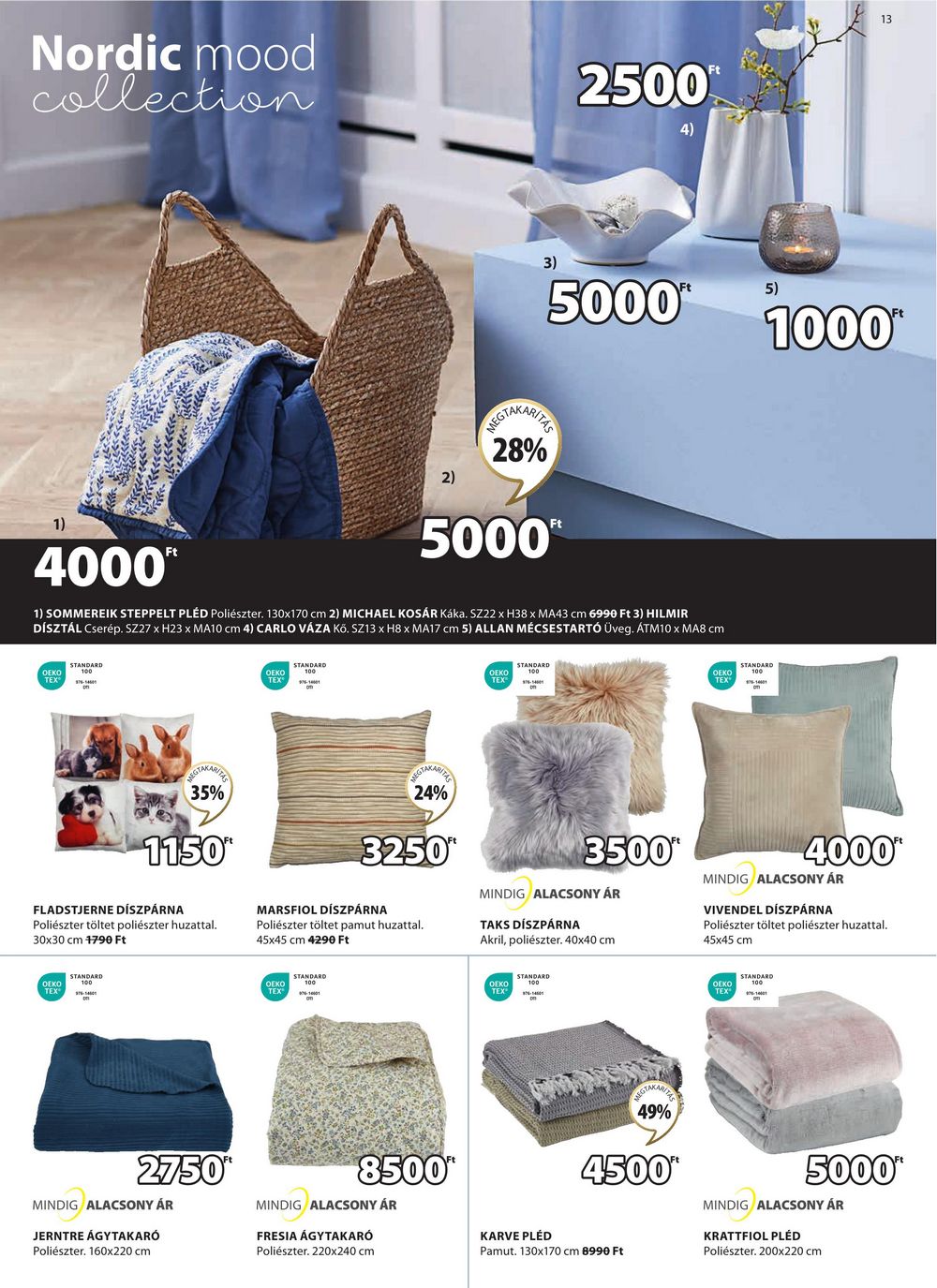 Nordic mood collection 2500* 4) 1) 4000** 13 2) 3) REGTAKARITIE 28% 5000** 5000** 5) 1000* 1) SOMMEREIK STEPPELT PLÉD Poliészter. 130×170 cm 2) MICHAEL KOSÁR Káka. SZ22 x H38 x MA43 cm 6990 Ft 3) HILMIR DÍSZTÁL Cserép. SZ27 x H23 x MA10 cm 4) CARLO VÁZA KŐ. SZ13 x H8 x MA17 cm 5) ALLAN MÉCSESTARTÓ Üveg. ÁTM10 x MA8 cm STANDARD OEKO TEX STANDARD OEKO 37-14001 STANDARD OEKO 100 TEX STANDARD TEX 7-14601 TAKAR RITAS 35% 1150* FLADSTJERNE DÍSZPÁRNA Poliészter töltet poliészter huzattal. 30×30 cm 1790 Ft 24% 3250 MARSFIOL DÍSZPÁRNA Poliészter töltet pamut huzattal. 45×45 cm 4290 Ft 3500 MINDIG ALACSONY ÁR TAKS DÍSZPÁRNA Akril, poliészter. 40×40 cm 4000 MINDIG ALACSONY ÁR VIVENDEL DÍSZPÁRNA Poliészter töltet poliészter huzattal. 45×45 cm OEKO STANDARD 100 STANDARD OEKO TEX -10001 OEKO STANDARD OEKO TEX STANDARD 2750* MINDIG ALACSONY ÁR JERNTRE ÁGYTAKARÓ Poliészter. 160×220 cm 8500 MINDIG ALACSONY ÁR FRESIA ÁGYTAKARÓ Poliészter. 220×240 cm KARVE PLÉD GTAKAR 49% 4500* Pamut. 130×170 cm 8990 Ft 5000** MINDIG ALACSONY ÁR KRATTFIOL PLÉD Poliészter. 200×220 cm