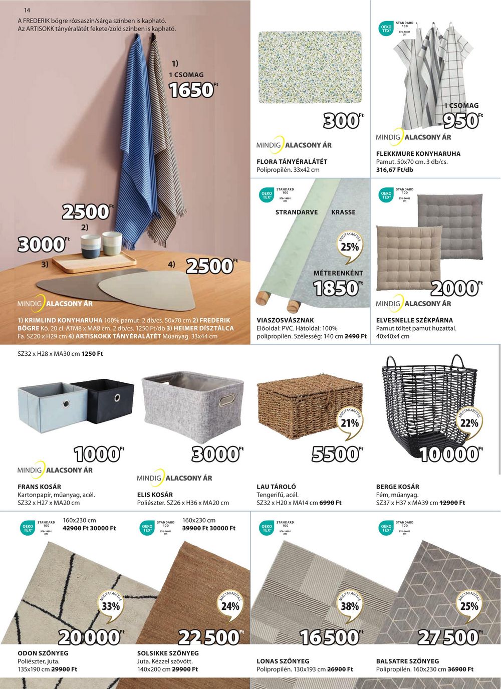 14 A FREDERIK bögre rózsaszín/sárga színben is kapható. Az ARTISOKK tányéralátét fekete/zöld színben is kapható. 1) 1 CSOMAG 1650 OEKO TEX STANDARD 100 01 300* MINDIG ALACSONY ÁR FLORA TÁNYÉRALÁTÉT Polipropilén. 33×42 cm 1 CSOMAG -950 MINDIG ALACSONY ÁR FLEKKMURE KONYHARUHA Pamut. 50×70 cm. 3 db/cs. 316,67 Ft/db OEKO TEX STANDARD OEKO TEX STANDARD 3000 2500 2) 3) MINDIG ALACSONY ÁR 4) 2500″ 1) KRIMLIND KONYHARUHA 100% pamut. 2 db/cs. 50×70 cm 2) FREDERIK BÖGRE Kō. 20 cl. ÁTM8 x MA8 cm. 2 db/cs. 1250 Ft/db 3) HEIMER DÍSZTÁLCA Fa. SZ20 x H29 cm 4) ARTISKOKK TÁNYÉRALÁTÉT Műanyag. 33x44cm SZ32 x H28 x MA30 cm 1250 Ft STRANDARVE KRASSE VIASZOSVÁSZNAK REGTAKARITIE 25% MÉTERENKÉNT 1850″ Előoldal: PVC. Hátoldal: 100% 2000″ MINDIG ALACSONY ÁR ELVESNELLE SZÉKPÁRNA Pamut töltet pamut huzattal. polipropilén. Szélesség: 140 cm 2490 Ft 40x40x4cm EGTAKARIZ 21% 22% 1000* MINDIG ALACSONY ÁR FRANS KOSÁR Kartonpapír, műanyag, acél. SZ32 x H27 x MA20 cm 3000 MINDIG ALACSONY ÁR ELIS KOSÁR Poliészter. SZ26 x H36 x MA20 cm LAU TÁROLÓ Tengerifű, acél. 5500** SZ32 x H20 x MA14 cm 6990 Ft BERGE KOSÁR Fém, műanyag. 10,000* SZ37 x H37 x MA39 cm 12900 Ft STANDARD OEKO TEX® 100 160×230 cm 42900 Ft 30000 Ft STANDARD 160×230 cm ОЕКО TEX 39900 Ft 30000 Ft STANDARD 100 OEKO TEX® OEKO TEX STANDARD 100 GTAKARITA 33% 20,000″ ODON SZŐNYEG Poliészter, juta. 135×190 cm 29900 Ft 24% 22500 SOLSIKKE SZŐNYEG Juta. Kézzel szövött. 140×200 cm 29900 Ft 38% 16500 LONAS SZŐNYEG Polipropilén. 130×193 cm 26900 Ft GTAKARITE 25% 27.500 BALSATRE SZŐNYEG Polipropilén. 160×230 cm 36900 Ft