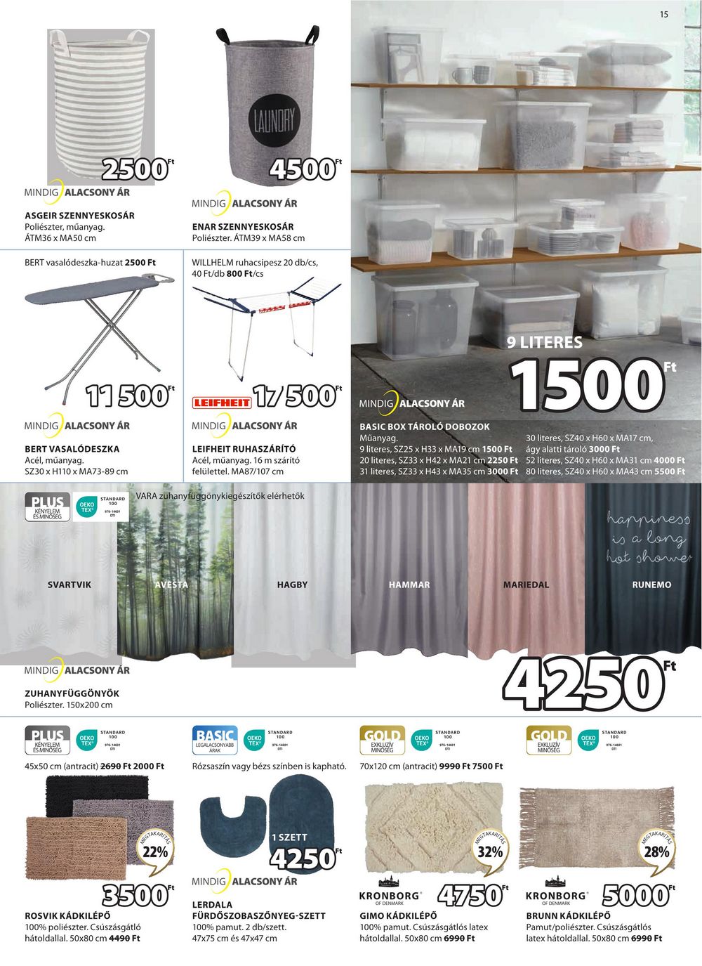 15 2500* MINDIG ALACSONY ÁR ASGEIR SZENNYESKOSÁR Poliészter, műanyag. ÁTM36 x MA50 cm BERT vasalódeszka-huzat 2500 Ft X 11500″ MINDIG ALACSONY ÁR BERT VASALÓDESZKA Acél, műanyag. SZ30 x H110 x MA73-89 cm PLUS KÉNYELEM ÉS MINŐSÉG OEKO TEX LAUNDRY 4500″ MINDIG ALACSONY ÁR ENAR SZENNYESKOSÁR Poliészter. ÁTM39 x MA58 cm WILLHELM ruhacsipesz 20 db/cs, 40 Ft/db 800 Ft/cs LEIFHEIT 17/500 MINDIG ALACSONY ÁR LEIFHEIT RUHASZÁRÍTÓ Acél, műanyag. 16 m szárító felülettel. MA87/107 cm STANDARD VARA zuhanyfüggönykiegészítők elérhetők MINDIG ALACSONY ÁR LACSONY AR BASIC BOX TÁROLÓ DOBOZOK Műanyag. 9 LITERES 1500 Ft 9 literes, SZ25 x H33 x MA19 cm 1500 Ft 20 literes, SZ33 x H42 x MA21 cm 2250 Ft 31 literes, SZ33 x H43 x MA35 cm 3000 Ft 30 literes, SZ40 x H60 x MA17 cm, ágy alatti tároló 3000 Ft 52 literes, SZ40 x H60 x MA31 cm 4000 Ft 80 literes, SZ40 x H60 x MA43 cm 5500 Ft SVARTVIK AVESTA HAGBY HAMMAR MARIEDAL MINDIG ALACSONY ÁR ZUHANYFÜGGÖNYÖK Poliészter. 150×200 cm happiness is a long hot shower RUNEMO 4250* GOLD DEKO STANDARD PLUS STANDARD OEKO TEX 100 KÉNYELEM ÉS MINŐSÉG 45×50 cm (antracit) 2690 Ft 2000 Ft LEGALACSONYABB TEX® ARAK BASIC DEKO STANDARD 100 GOLD STANDARD 100 EXKLUZÍV MINŐSÉG OEKO TEX Rózsaszín vagy bézs színben is kapható. 70×120 cm (antracit) 9990 Ft 7500 Ft EXKLUZÍV MINŐSÉG TEX on GTAKARITZE 22% 3500 ROSVIK KÁDKILÉPŐ 100% poliészter. Csúszásgátló hátoldallal. 50×80 cm 4490 Ft 1 SZETT 4250″ MINDIG ALACSONY ÁR LERDALA FÜRDŐSZOBASZŐNYEG-SZETT 100% pamut. 2 db/szett. 47×75 cm és 47×47 cm REGTAKARITE 32% KRONBORG 4750* GIMO KÁDKILÉPŐ 100% pamut. Csúszásgátlós latex hátoldallal. 50×80 cm 6990 Ft KRONBORG OF DENMARK 28% 5000″ BRUNN KÁDKILÉPŐ Pamut/poliészter. Csúszásgátlós latex hátoldallal. 50×80 cm 6990 Ft