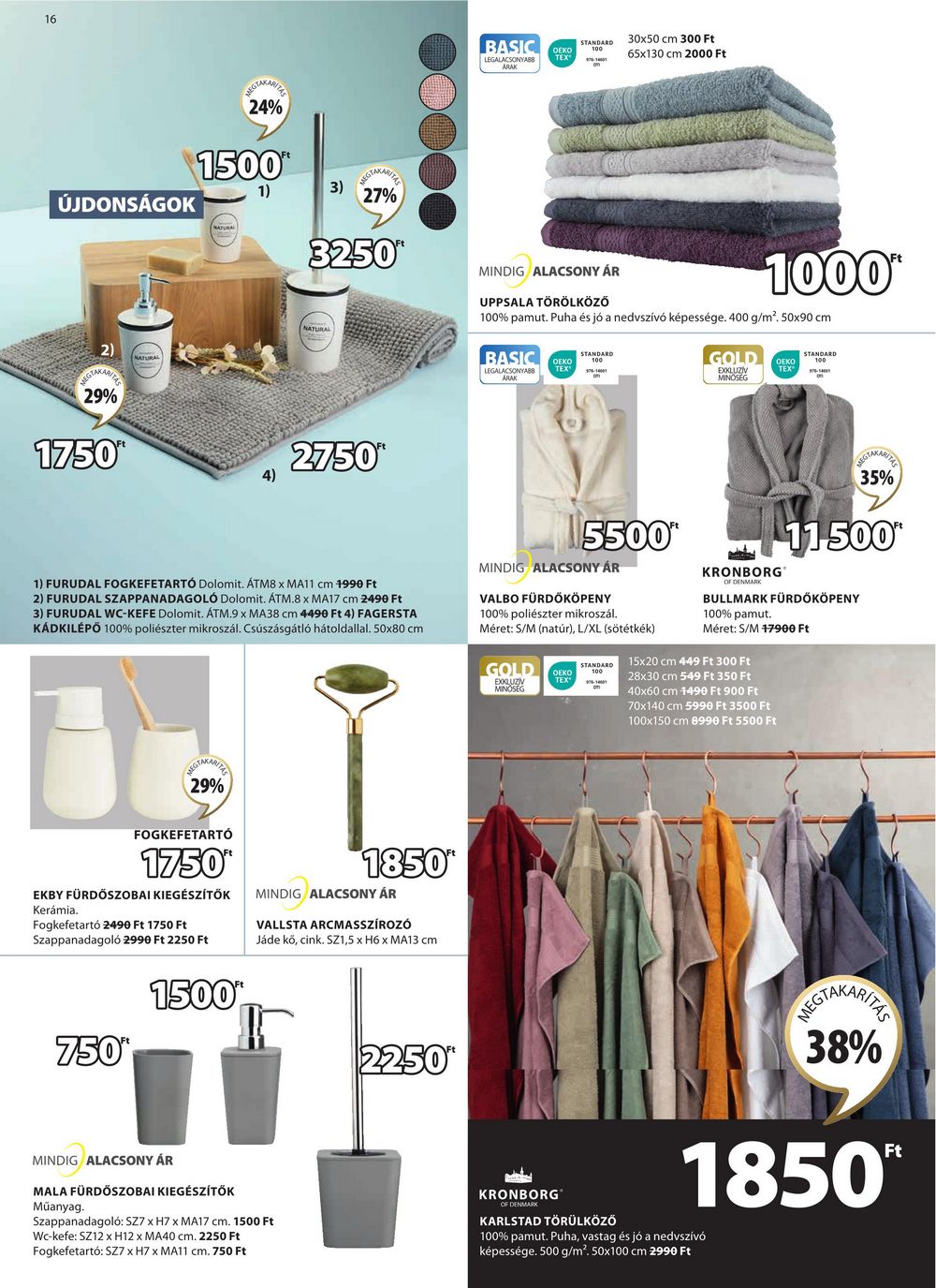 16 ÚJDONSÁGOK 2) GTAKARITZ 29% NATURAL WEGTAKARIZ 24% 1500 1) 3) REGTAKARITHE 27% 3250″ NATURAL 1750 2750* 4) BASIC OEKO TEX LEGALACSONYABB ARAK STANDARD 30×50 cm 300 Ft MINDIG ALACSONY ÁR 65×130 cm 2000 Ft 1000* UPPSALA TÖRÖLKÖZŐ 100% pamut. Puha és jó a nedvszívó képessége. 400 g/m². 50×90 cm BASIC STANDARD OEKO LEGALACSONYABB ÁRAK TEX GOLD DEKO EXKLUZÍV MINOSEG TEX® STANDARD REGTAKARITE 35% 1) FURUDAL FOGKEFETARTÓ Dolomit. ÁTM8 x MA11 cm 1990 Ft 2) FURUDAL SZAPPANADAGOLÓ Dolomit. ÁTM.8 x MA17 cm 2490 Ft 3) FURUDAL WC-KEFE Dolomit. ÁTM.9 x MA38 cm 4490 Ft 4) FAGERSTA KÁDKILÉPŐ 100% poliészter mikroszál. Csúszásgátló hátoldallal. 50×80 cm 5500 1,500 MINDIG ALACSONY ÁR VALBO FÜRDŐKÖPENY 100% poliészter mikroszál. Méret: S/M (natúr), L/XL (sötétkék) GOLD EXKLUZÍV MINOSEG OEKO TEX 100 KRONBORG OF DENMARK BULLMARK FÜRDŐKÖPENY 100% pamut. Méret: S/M 17900 Ft STANDARD 15×20 cm 449 Ft 300 Ft 28×30 cm 549 Ft 350 Ft 40×60 cm 1490 Ft 900 Ft 70×140 cm 5990 Ft 3500 Ft 100×150 cm 8990 Ft 5500 Ft REGTAKARITHE 29% FOGKEFETARTÓ 1750* EKBY FÜRDŐSZOBAI KIEGÉSZÍTŐK Kerámia. Fogkefetartó 2490 Ft 1750 Ft Szappanadagoló 2990 Ft 2250 Ft 750* 1500* 1850 MINDIG ALACSONY ÁR VALLSTA ARCMASSZÍROZÓ Jáde kö, cink. SZ1,5 x H6 x MA13 cm 2250″ MINDIG ALACSONY ÁR MALA FÜRDŐSZOBAI KIEGÉSZÍTŐK Műanyag. Szappanadagoló: SZ7 x H7 x MA17 cm. 1500 Ft Wc-kefe: SZ12 x H12 x MA40 cm. 2250 Ft Fogkefetartó: SZ7 x H7 x MA11 cm. 750 Ft KRONBORG OF DENMARK KARLSTAD TÖRÜLKÖZŐ REGTAKARIZA 38% 1850 100% pamut. Puha, vastag és jó a nedvszívó képessége. 500 g/m². 50×100 cm 2990 Ft Ft