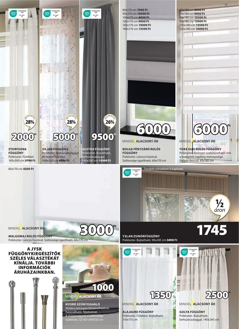 OEKO TEX* STANDARD 100 STANDARD OEKO TEX OEKO TEX STANDARD 100 80×170 cm 7000 Ft 90×210 cm 10500 Ft 100×170 cm 8000 Ft 120×170 cm 9000 Ft 140×170 cm 10000 Ft 180×170 cm 13500 Ft 60×180 em 8000 FE 70×180 cm 9000 Ft 80×180 cm 10500 Ft 90×180 cm 12000 Ft 100×180 cm 13500 Ft 120×180 cm 16000 Ft EGTAKARITZE 28% 2000* STORFOSNA FÜGGÖNY Poliészter. Fülekkel. 145×300 cm 2790 Ft 80×170 cm 4000 Ft REGTAKARITHE 28% 5000* SILJAN FÜGGÖNY Poliészter. Behúzószalaggal és rejtett fülekkel. 140×300 cm 6990 Ft 26% 9500 AUSTRA FÜGGÖNY Poliészter. Bújtatható, behúzószalaggal. 140×300 cm +2900 Ft 6000 MINDIG ALACSONY ÁR BOLGA FÉNYZÁRÓ ROLÓS FÜGGÖNY Poliészter. Láncos húzóval. Szélessége igazítható. 60×170 cm OEKO TEX 6000″ MINDIG ALACSONY ÁR TOKE DUO ROLÓS FÜGGÖNY Poliészter Könnyen szabályozható vele a beáramló napfény mennyisége. Golyós lánccal. 45×180 cm STANDARD További színekben is kapható. MINDIG ALACSONY ÁR MALGOMAJ ROLÓS FÜGGÖNY 3000 Poliészter. Láncos húzóval. Szélessége igazítható. 60×170 cm A JYSK FÜGGÖNYKIEGÉSZÍTŐK SZÉLES VÁLASZTÉKÁT KÍNÁLJA. TOVÁBBI INFORMÁCIÓK ÁRUHÁZAINKBAN. YXLAN ZSINÓRFÜGGÖNY Poliészter. Bújtatható. 90×245 cm 3490 Ft OEKO TEX® STANDARD OEKO TEX STANDARD 100 12 áron 1745 1000 MINDIG ALACSONY ÁR NYORD SZÚNYOGHÁLÓ Ablakra könnyen felszerelhető és használható. Tépőzárral. A magassága és a szélessége szabható. SZ130 x MA150 cm 1350 MINDIG ALACSONY ÁR ALAJAURE FÜGGÖNY Poliészter. Fülekkel. Bújtatható. 110×175 cm 2500 MINDIG ALACSONY ÁR GOLTA FÜGGÖNY Poliészter. Bújtatható, behúzószalaggal. 140×245 cm
