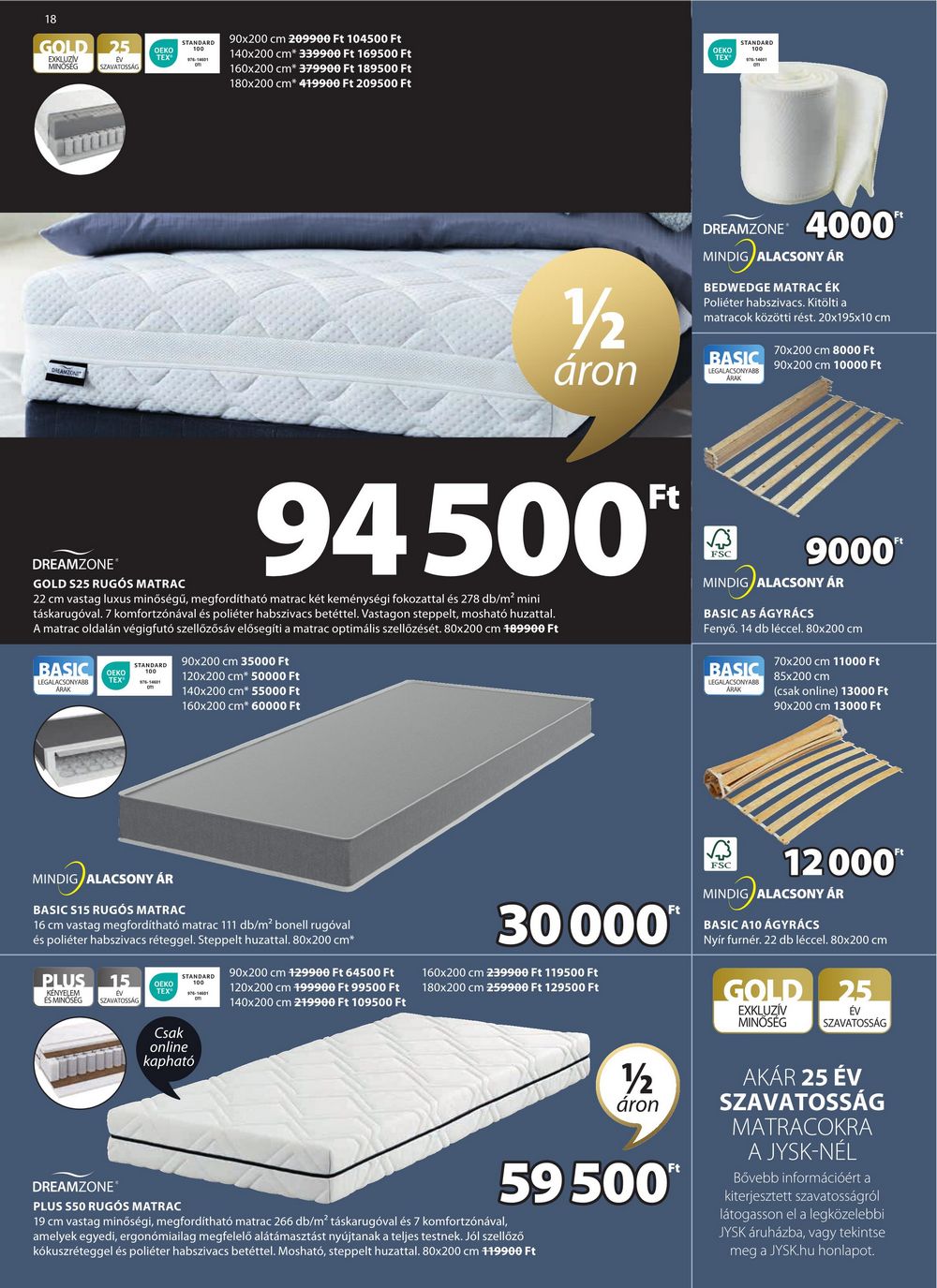 18 GOLD 25 EXKLUZÍV MINOSEG Ev OEKO TEX SZAVATOSSÁG mw STANDARD 100 90×200 cm 209900 Ft 104500 Ft 140×200 cm* 339900 Ft 169500 Ft 160×200 cm* 379900 Ft 189500 Ft 180×200 cm* 419900 Ft 209500 Ft OEKO STANDARD 100 TEX 1/2 áron DREAMZONE 4000″ MINDIG ALACSONY ÁR BEDWEDGE MATRAC ÉK Poliéter habszivacs. Kitölti a matracok közötti rést. 20x195x10 cm BASIC LEGALACSONYABB ARAK 70×200 cm 8000 Ft 90×200 cm 10000 Ft DREAMZONE GOLD S25 RUGÓS MATRAC 94 500 22 cm vastag luxus minőségű, megfordítható matrac két keménységi fokozattal és 278 db/m² mini táskarugóval. 7 komfortzónával és poliéter habszivacs betéttel. Vastagon steppelt, mosható huzattal. A matrac oldalán végigfutó szellőzősáv elősegíti a matrac optimális szellőzését. 80×200 cm 189900 Ft BASIC DEKO LEGALACSONYABB TEX ARAK STANDARD 90×200 cm 35000 Ft 120×200 cm* 50000 Ft 140×200 cm* 55000 Ft 160×200 cm* 60000 Ft Ft FSC 9000″ MINDIG ALACSONY AR BASIC A5 ÁGYRÁCS Fenyő. 14 db léccel. 80×200 cm BASIC LEGALACSONYABB ARAK 70×200 cm 11000 Ft 85×200 cm (csak online) 13000 Ft 90×200 cm 13000 Ft MINDIG ALACSONY ÁR ALACSONY A BASIC S15 RUGÓS MATRAC 16 cm vastag megfordítható matrac 111 db/m² bonell rugóval és poliéter habszivacs réteggel. Steppelt huzattal. 80×200 cm* STANDARD 90×200 cm 129900 Ft 64500 Ft PLUS 15 OEKO 100 KÉNYELEM Ev TEX® ÉS MINŐSÉG SZAVATOSSÁG 120×200 cm 199900 Ft 99500 Ft 140×200 cm 219900 Ft 109500 Ft 30000* 160×200 cm 239900 Ft 119500 Ft 180×200 cm 259900 Ft 129500 Ft FSC 12000″ MINDIG ALACSONY ÁR BASIC A10 ÁGYRÁCS Nyír furnér. 22 db léccel. 80×200 cm GOLD 25 Csak online kapható EXKLUZÍV MINŐSÉG Εν SZAVATOSSÁG 12 áron Ft AKÁR 25 ÉV SZAVATOSSÁG MATRACOKRA A JYSK-NÉL Bővebb információért a kiterjesztett szavatosságról látogasson el a legközelebbi JYSK áruházba, vagy tekintse meg a JYSK.hu honlapot. DREAMZONE PLUS S50 RUGÓS MATRAC 59 500 19 cm vastag minőségi, megfordítható matrac 266 db/m² táskarugóval és 7 komfortzónával, amelyek egyedi, ergonómiailag megfelelő alátámasztást nyújtanak a teljes testnek. Jól szellőző kókuszréteggel és poliéter habszivacs betéttel. Mosható, steppelt huzattal. 80×200 cm +19900 Ft