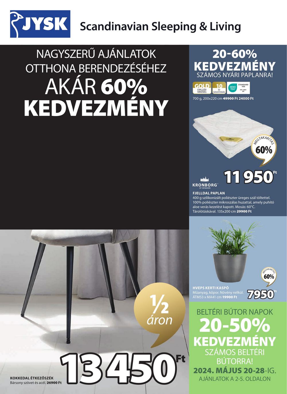 JYSK Scandinavian Sleeping & Living NAGYSZERŰ AJÁNLATOK OTTHONA BERENDEZÉSÉHEZ AKÁR 60% KEDVEZMÉNY 20-60% KEDVEZMÉNY SZÁMOS NYÁRI PAPLANRA! GOLD 10 EXKLUZIV MINŐSÉG SZAVATOSSÁG STANDARD TEX 700 g, 200×220 cm 49900 Ft 24000 Ft MEGTAKARITHE 60% 11 950** KRONBORG OF DENMARK FJELLDAL PAPLAN 400 g szilikonizált poliészter üreges szál töltettel. 100% poliészter mikroszálas huzattal, amely puhító aloe verás kezelést kapott. Mosás: 60°C. Tárolótáskával. 135×200 cm 29900 Ft KOKKEDAL ÉTKEZŐSZÉK Bársony szövet és acél. 26900 Ft 1/2 áron Ft 13450** HVEPS KERTI KASPÓ 60% Műanyag, kōpor. Növény nélkül. 950* ÁTM53 x MA41 cm 49900 Ft BELTÉRI BÚTOR NAPOK 20-50% KEDVEZMÉNY SZÁMOS BELTÉRI BÚTORRA! 2024. MÁJUS 20-28-IG. AJÁNLATOK A 2-5. OLDALON