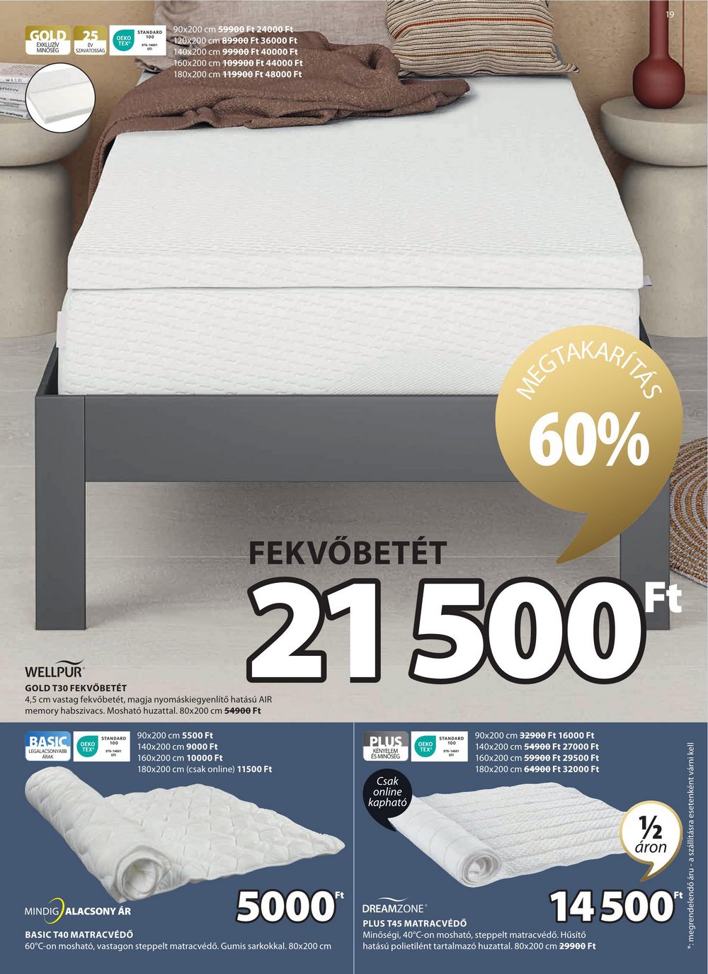 GOLD 25 EXKLUZÍV MINOSEG SZAVATOSSÁG OEKO STANDARD 90×200 cm 59900 Ft 24000 Ft 120×200 cm 89900 Ft 36000 Ft 140×200 cm 99900 Ft 40000 Ft 160×200 cm 109900 Ft 44000 Ft 180×200 cm 419900 Ft 48000 Ft FEKVŐBETÉT MEGTAKARITAS 60% Ft 21500** WELLPUR GOLD T30 FEKVŐBETÉT 4,5 cm vastag fekvőbetét, magja nyomáskiegyenlítő hatású AIR memory habszivacs. Mosható huzattal. 80×200 cm 54900 Ft LEGALACSONYABB BASIC KO STANDARD 90×200 cm 5500 Ft 100 TEX 140×200 cm 9000 Ft 160×200 cm 10000 Ft 180×200 cm (csak online) 11500 Ft PLUS KÉNYELEM ÉS MINŐSÉG Csak online kapható OEKO TEX STANDARD 26-14001 90×200 cm 32900 Ft 16000 Ft 140×200 cm 54900 Ft 27000 Ft 160×200 cm 59900 Ft 29500 Ft 180×200 cm 64900 Ft 32000 Ft 1/2 áron MINDIG ALACSONY ÁR BASIC T40 MATRACVÉDŐ 5000** 60°C-on mosható, vastagon steppelt matracvédő. Gumis sarkokkal. 80×200 cm DREAMZONE PLUS T45 MATRACVÉDŐ 14.500** Minőségi, 40°C-on mosható, steppelt matracvédő. Hűsítő hatású polietilént tartalmazó huzattal. 80×200 cm 29900 Ft megrendelendő áru – a szállításra esetenként várni kell 19