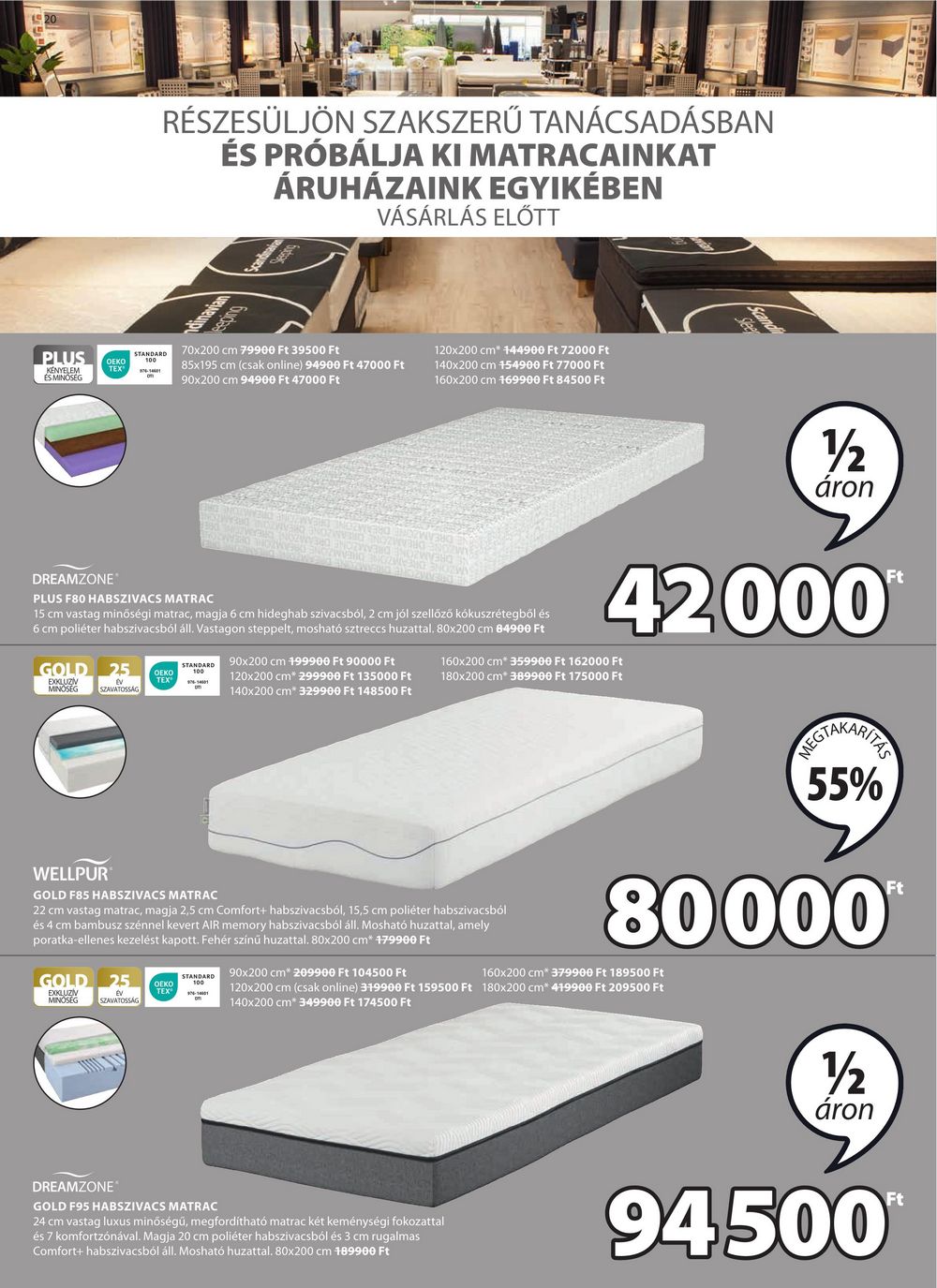 20 PLUS KENYELEM ÉS MINŐSÉG STANDARD OEKO RÉSZESÜLJÖN SZAKSZERŰ TANÁCSADÁSBAN ÉS PRÓBÁLJA KI MATRACAINKAT ÁRUHÁZAINK EGYIKÉBEN VÁSÁRLÁS ELŐTT dinavian 70×200 cm 79900 Ft 39500 Ft 85×195 cm (csak online) 94900 Ft 47000 Ft 90×200 cm 94900 Ft 47000 Ft 120×200 cm* 144900 Ft 72000 Ft 140×200 cm +54900 Ft 77000 Ft 160×200 cm 169900 Ft 84500 Ft Standi DREAMZONE PLUS F80 HABSZIVACS MATRAC 15 cm vastag minőségi matrac, magja 6 cm hideghab szivacsból, 2 cm jól szellőző kókuszrétegből és 6 cm poliéter habszivacsból áll. Vastagon steppelt, mosható sztreccs huzattal. 80×200 cm 84900 Ft GOLD 25 OEKO EXKLUZÍV MINOSEG TEX SZAVATOSSÁG WELLPUR STANDARD GOLD F85 HABSZIVACS MATRAC 90×200 cm 199900 Ft 90000 Ft 120×200 cm* 299900 Ft 135000 Ft 140×200 cm* 329900 Ft 148500 Ft 1/2 áron 42,000** 160×200 cm* 359900 Ft 162000 Ft 180×200 cm* 389900 Ft 175000 Ft 22 cm vastag matrac, magja 2,5 cm Comfort+ habszivacsból, 15,5 cm poliéter habszivacsból és 4 cm bambusz szénnel kevert AIR memory habszivacsból áll. Mosható huzattal, amely poratka-ellenes kezelést kapott. Fehér színű huzattal. 80×200 cm* 479900 Ft GOLD 25 OEKO STANDARD EXKLUZÍV MINŐSÉG Ev SZAVATOSSÁG DREAMZONE GOLD F95 HABSZIVACS MATRAC 90×200 cm* 209900 Ft 104500 Ft EGTAKARITEE 55% Ft 80000* 160×200 cm* 379900 Ft 189500 Ft 120×200 cm (csak online) 319900 Ft 159500 Ft 180×200 cm* 419900 Ft 209500 Ft 140×200 cm* 349900 Ft 174500 Ft 24 cm vastag luxus minőségű, megfordítható matrac két keménységi fokozattal és 7 komfortzónával. Magja 20 cm poliéter habszivacsból és 3 cm rugalmas Comfort+ habszivacsból áll. Mosható huzattal. 80×200 cm 189900 Ft 12 áron 94500 Ft