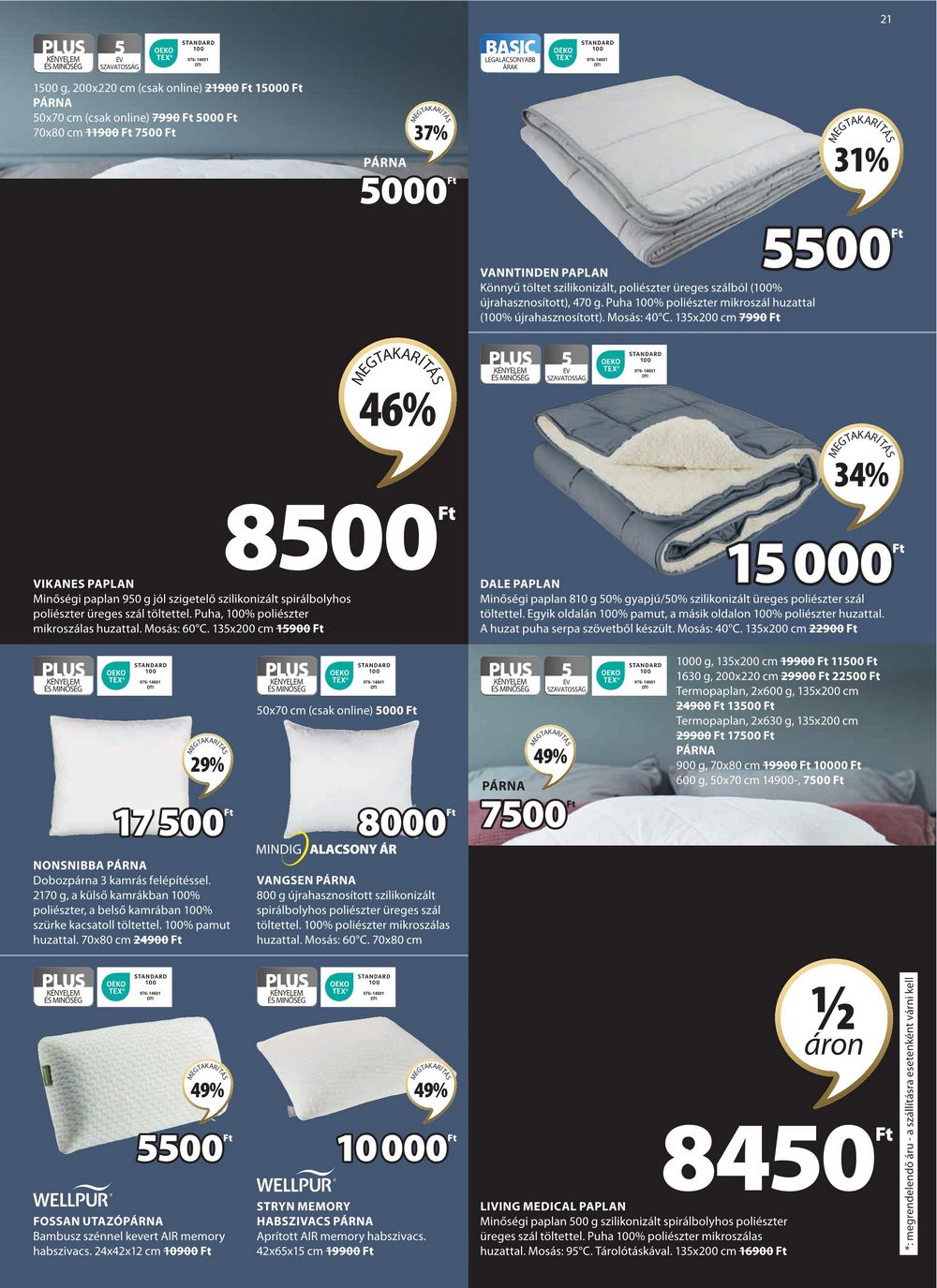PLUS KÉNYELEM ÉS MINŐSÉG 5 STANDARD OEKO TEX SZAVATOSSÁG 1500 g, 200×220 cm (csak online) 21900 Ft 15000 Ft PÁRNA 50×70 cm (csak online) 7990 Ft 5000 Ft 70×80 cm 11900 Ft 7500 Ft BASIC OEKO TEX LEGALACSONYABB ARAK STANDARD 21 PÁRNA EGTAKARITE 37% 5000″ REGTAKARITES 46% VANNTINDEN PAPLAN REGTAKARITZTE 31% 5500™ Könnyű töltet szilikonizált, poliészter üreges szálból (100% újrahasznosított), 470 g. Puha 100% poliészter mikroszál huzattal (100% újrahasznosított). Mosás: 40°C. 135×200 cm 7990 Ft PLUS KÉNYELEM ÉS MINOSEG STANDARD ev SZAVATOSSAG OEKO TEX REGTAKARITHE 34% VIKANES PAPLAN 8500″ Minőségi paplan 950 g jól szigetelő szilikonizált spirálbolyhos poliészter üreges szál töltettel. Puha, 100% poliészter mikroszálas huzattal. Mosás: 60°C. 135×200 cm 15900 Ft PLUS STANDARD ОЕКО TEX KÉNYELEM ÉS MINŐSÉG REGTAKARIZE 29% 17/500″ NONSNIBBA PÁRNA Dobozpárna 3 kamrás felépítéssel. 2170 g, a külső kamrákban 100% poliészter, a belső kamrában 100% szürke kacsatoll töltettel. 100% pamut huzattal. 70×80 cm 24900 Ft PLUS KÉNYELEM ÉS MINŐSÉG STANDARD OEKO TEX 100 PLUS STANDARD OEKO TEX KÉNYELEM ÉS MINŐSÉG 50×70 cm (csak online) 5000 Ft DALE PAPLAN 15 000 Minőségi paplan 810 g 50% gyapjú/50% szilikonizált üreges poliészter szál töltettel. Egyik oldalán 100% pamut, a másik oldalon 100% poliészter huzattal. A huzat puha serpa szövetből készült. Mosás: 40°C. 135×200 cm 22900 Ft PLUS 5 OEKO KÉNYELEM TEX® ÉS MINŐSÉG SZAVATOSSÁG PÁRNA SEGTAKARITIE 49% 8000 7500 MINDIG ALACSONY ÁR VANGSEN PÁRNA 800 g újrahasznosított szilikonizált spirálbolyhos poliészter üreges szál töltettel. 100% poliészter mikroszálas huzattal. Mosás: 60°C. 70×80 cm PLUS STANDARD OEKO TEX® 100 KÉNYELEM ÉS MINŐSÉG STANDARD 1000 g, 135×200 cm 19900 Ft 11500 Ft 1630 g, 200×220 cm 29900 Ft 22500 Ft Termopaplan, 2×600 g, 135×200 cm 24900 Ft 13500 Ft Termopaplan, 2×630 g, 135×200 cm 29900 Ft 17500 Ft PÁRNA 900 g, 70×80 cm 49900 Ft 10000 Ft 600 g, 50×70 cm 14900-, 7500 Ft 1/2 áron megrendelendő áru – a szállításra esetenként várni kell WELLPUR REGTAKARITE 49% 5500 FOSSAN UTAZÓPÁRNA Bambusz szénnel kevert AIR memory habszivacs. 24x42x12 cm 10900 Ft WELLPUR REGTAKARITE 49% 10000** STRYN MEMORY HABSZIVACS PÁRNA Aprított AIR memory habszivacs. 42x65x15 cm 19900 Ft LIVING MEDICAL PAPLAN 8450 Minőségi paplan 500 g szilikonizált spirálbolyhos poliészter üreges szál töltettel. Puha 100% poliészter mikroszálas huzattal. Mosás: 95°C. Tárolótáskával. 135×200 cm 16900 Ft Ft Ft
