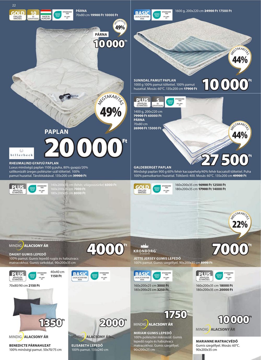 22 GOLD 10 EXKLUZIV MINOSEG STANDARD OEKO 100 εν MADE IN TEX SZAVATOSSÁG HUNGARY PÁRNA 70×80 cm 19900 Ft 10000 Ft PÁRNA 49% 10000″ BASIC DEKO STANDARD 1600 g, 200×220 cm 24900 Ft 17500 Ft LEGALACSONYABB TEX ARAK GTAKARITHE 44% PAPLAN REGTAKARITHE 49% 20000™ SUNNDAL PAMUT PAPLAN 1000 g 100% pamut töltettel. 100% pamut huzattal. Mosás: 60°C. 135×200 cm 17900 Ft PLUS KÉNYELEM ÉS MINŐSÉG ev SZAVATOSSAG 1400 g, 200×220 cm 79900 Ft 60000 Ft PÁRNA 70×80 cm 26900 Ft 15000 Ft STANDARD OEKO TEX 10000** 44% 27 500* billerbeck RHEUMALIND GYAPJÚ PAPLAN Luxus minőségű paplan 1100 g puha, 80% gyapjú/20% szilikonizált üreges poliészter szál töltettel. 100% pamut huzattal. Tárolótáskával. 135×200 cm 39900 Ft PLUS KÉNYELEM ÉS MINŐSÉG STANDARD ОЕКО TEX 140x200x35 cm (fehér, világosszürke) 6000 Ft 160x200x35 cm 7000 Ft 180x200x35 cm 8000 Ft GALDEBERGET PAPLAN Minőségi paplan 900 g 60% fehér kacsapehely/40% fehér kacsatoll töltettel. Puha 100% pamutkarton huzattal. Töltőerő: 400. Mosás: 60°C. 135×200 cm 49900 Ft GOLD OEKO TEX STANDARD 100 160x200x35 cm 16900 Ft 12500 Ft 180x200x35 cm 17900 Ft 14000 Ft EXKLUZÍV MINŐSÉG MEGTAKARITE 22% MINDIG ALACSONY ÁR DAGNY GUMIS LEPEDŐ 100% pamut. Gumis lepedő rugós és habszivacs matracokhoz. Gumis sarkokkal. 90x200x35 cm PLUS KÉNYELEM ÉS MINŐSÉG 4000* OEKO TEX STANDARD 100 40×40 cm 1150 Ft BASIC DEKO STANDARD TEX® 70×80/90 cm 2150 Ft LEGALACSONYABB KRONBORG OF DENMARK JETTE JERSEY GUMIS LEPEDŐ 100% pamut. Gumis szegéllyel. 90x200x35 cm 8990 Ft BASIC STANDARD OEKO 100 7000** PLUS STANDARD OEKO TEX® 100 LEGALACSONYABB TEX ARAK 160x200x25 cm 3000 Ft 180x200x25 cm 3250 Ft KÉNYELEM ÉS MINŐSÉG 160x200x35 cm 18000 Ft 180x200x35 cm 20000 Ft 1350″ MINDIG ALACSONY ÁR BENEDICTE PÁRNAHUZAT 100% minőségi pamut. 50×70/75 cm 2000* MINDIG ALACSONY ÁR ELISABETH LEPEDŐ 100% pamut. 135×240 cm 1750 MINDIG ALACSONY ÁR MIRIAM GUMIS LEPEDŐ 100% poliészter mikroszál. Gumis lepedő rugós és habszivacs matracokhoz. Gumis szegéllyel. 90x200x25 cm 10000″ MINDIG ALACSONY ÁR MARIANNE MATRACVÉDŐ Gumis szegéllyel. Mosás: 60°C. 90x200x35 cm
