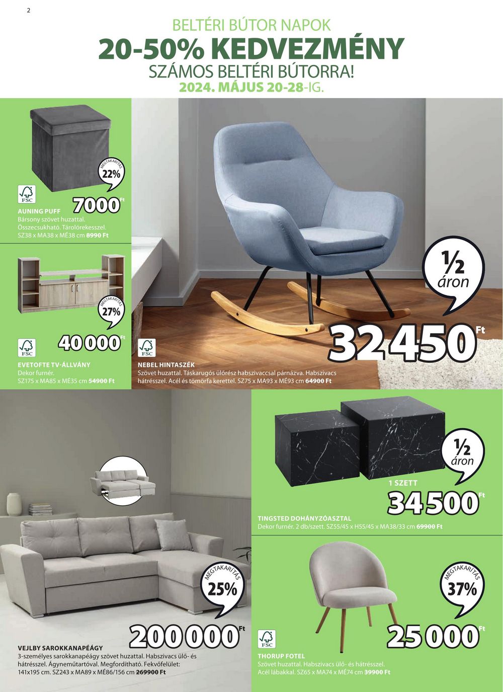 2 BELTÉRI BÚTOR NAPOK 20-50% KEDVEZMÉNY SZÁMOS BELTÉRI BÚTORRA! 2024. MÁJUS 20-28-IG. FSC AUNING PUFF 22% 7000 Bársony szövet huzattal. Összecsukható. Tárolórekesszel. SZ38 x MA38 x MÉ38 cm 8990 Ft FSC TAKAR 27% 40000 EVETOFTE TV-ÁLLVÁNY Dekor furnér. SZ175 x MA85 x ME35 cm 54900 Ft FSC NEBEL HINTASZÉK Szövet huzattal. Táskarugós ülőrész habszivaccsal párnázva. Habszivacs hátrésszel. Acél és tömörfa kerettel. SZ75 x MA93 x MÉ93 cm 64900 Ft 12 áron 32450 Ft 12 áron TINGSTED DOHÁNYZÓASZTAL SZETT 34500 Dekor furnér. 2 db/szett. SZ55/45 x H55/45 x MA38/33 cm 69900 Ft VEJLBY SAROKKANAPÉÁGY EGTAKARITZA 25% 200000*4 3-személyes sarokkanapéágy szövet huzattal. Habszivacs ülő- és hátrésszel. Ágyneműtartóval. Megfordítható. Fekvőfelület: 141×195 cm. SZ243 x MA89 x MÉ86/156 cm 269900 Ft THORUP FOTEL Szövet huzattal. Habszivacs ülő- és hátrésszel. Acél lábakkal. SZ65 x MA74 x MÉ74 cm 39900 Ft EGTAKARITE 37% 25000