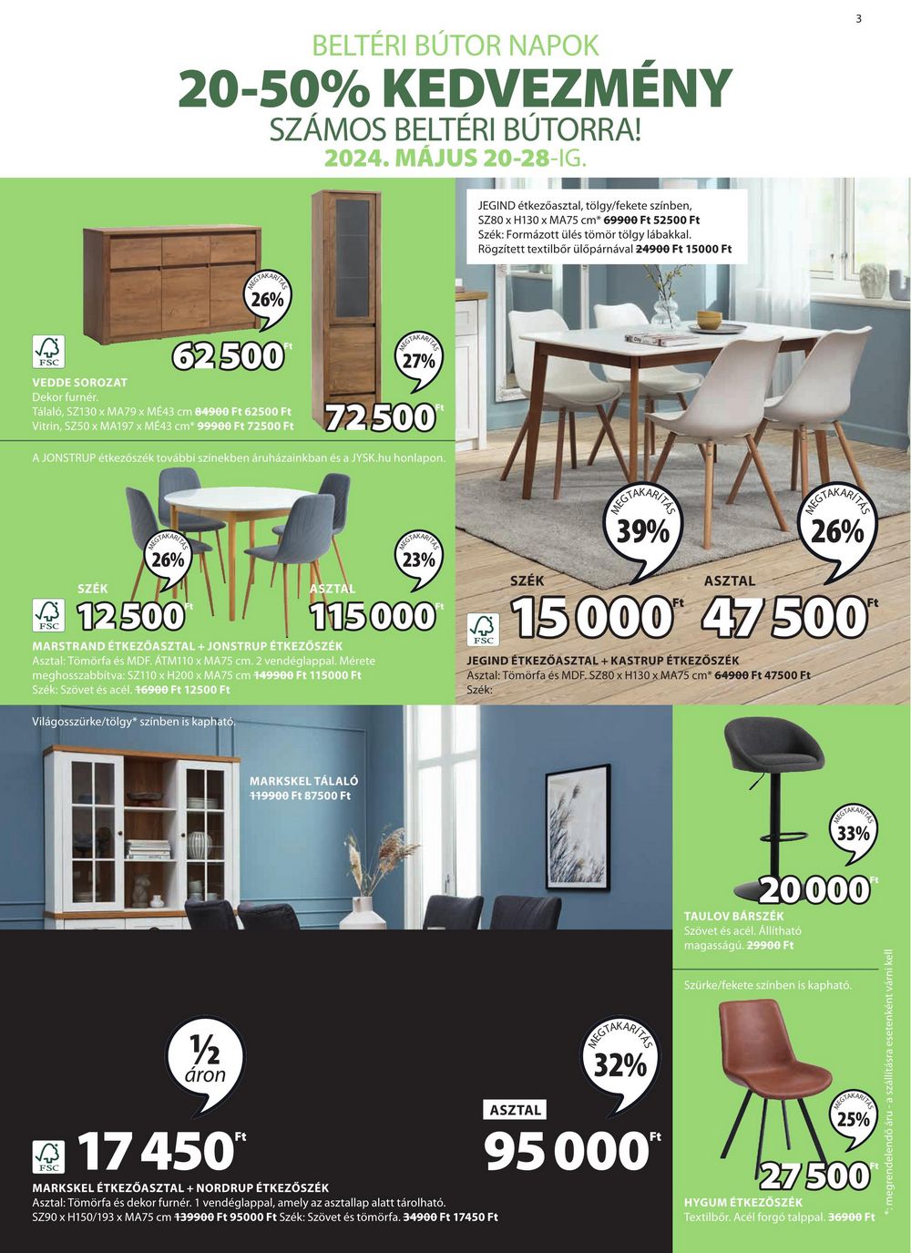 BELTÉRI BÚTOR NAPOK 20-50% KEDVEZMÉNY SZÁMOS BELTÉRI BÚTORRA! 2024. MÁJUS 20-28-IG. JEGIND étkezőasztal, tölgy/fekete színben, SZ80 x H130 x MA75 cm* 69900 Ft 52500 Ft Szék: Formázott ülés tömör tölgy lábakkal. Rögzített textilbőr ülőpárnával 24900 Ft 15000 Ft TAKAR AKARITAS 26% 62.500 FSC VEDDE SOROZAT Dekor furnér. Tálaló, SZ130 x MA79 x MÉ43 cm 84900 Ft 62500 Ft Vitrin, SZ50 x MA197 x ME43 cm* 99900 Ft 72500 Ft 27% 72.500 A JONSTRUP étkezőszék további színekben áruházainkban és a JYSK.hu honlapon. 3 FSC 26% SZÉK 12.500 ASZTAL GTAKAR XARITAS 23% SZÉK 115000 MARSTRAND ÉTKEZŐASZTAL + JONSTRUP ÉTKEZŐSZÉK Asztal: Tömörfa és MDF. ÁTM110 x MA75 cm. 2 vendéglappal. Mérete meghosszabbítva: SZ110 x H200 x MA75 cm 149900 Ft 115000 Ft Szék: Szövet és acél. 16900 Ft 12500 Ft Világosszürke/tölgy* színben is kapható. FSC EGTAKARITA 39% ASZTAL EGTAKARIF 26% 15000 47/500** JEGIND ÉTKEZŐASZTAL + KASTRUP ÉTKEZŐSZÉK Asztal: Tömörfa és MDF. SZ80 x H130 x MA75 cm* 64900 Ft 47500 Ft Szék: 1/2 áron MARKSKEL TÁLALÓ 119900 Ft 87500 Ft ASZTAL REGTAKARITE 32% 95 000** 33% 20000 TAULOV BÁRSZÉK Szövet és acél. Állítható magasságú. 29900 Ft Szürke/fekete színben is kapható. M 25% 27500 HYGUM ÉTKEZŐSZÉK Textilbőr. Acél forgó talppal. 36900 Ft FSC 17 450** MARKSKEL ÉTKEZŐASZTAL + NORDRUP ÉTKEZŐSZÉK Asztal: Tömörfa és dekor furnér. 1 vendéglappal, amely az asztallap alatt tárolható. SZ90 x H150/193 x MA75 cm 139900 Ft 95000 Ft Szék: Szövet és tömörfa. 34900 Ft 17450 Ft
