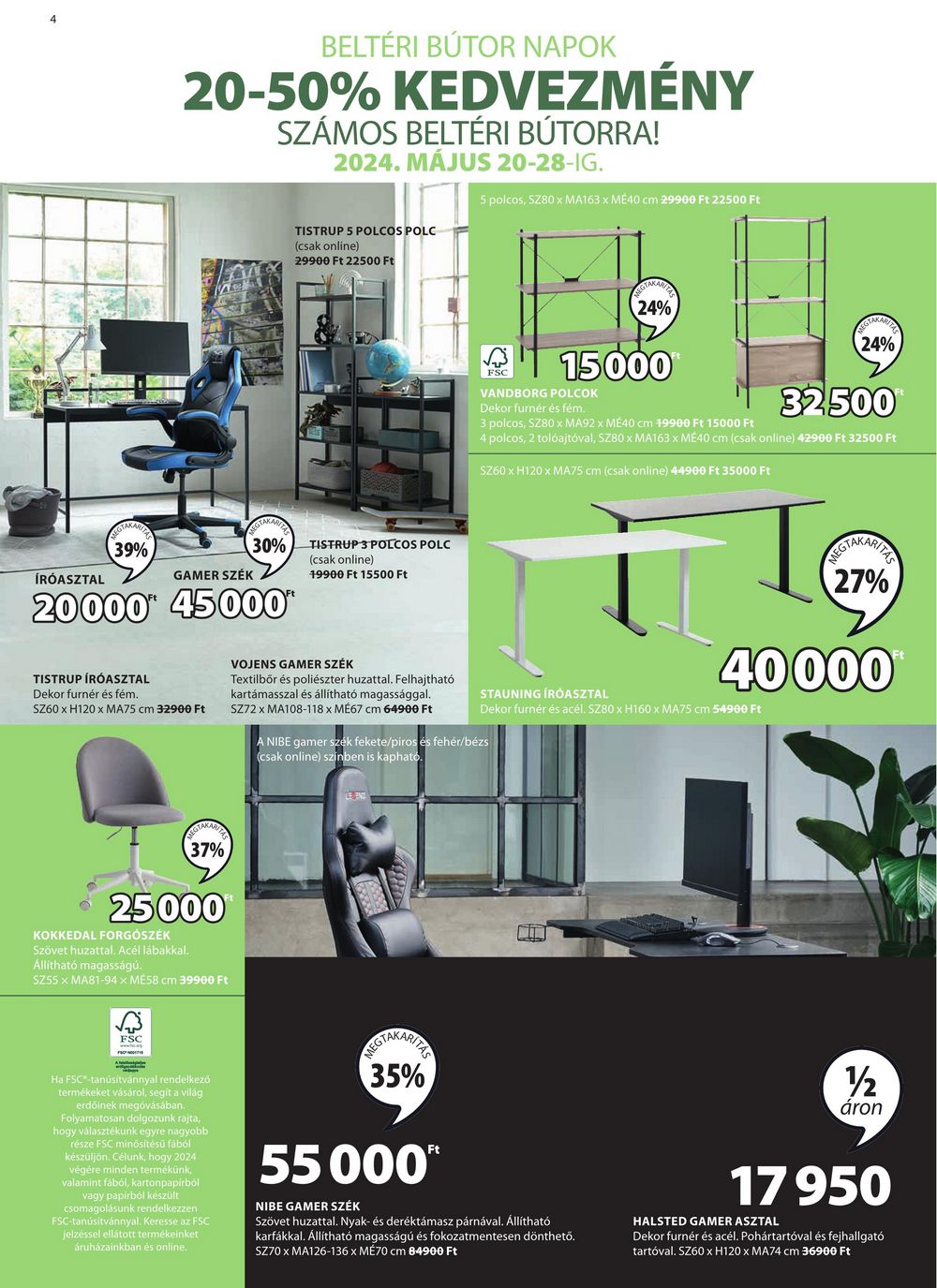 BELTÉRI BÚTOR NAPOK 20-50% KEDVEZMÉNY SZÁMOS BELTÉRI BÚTORRA! 2024. MÁJUS 20-28-IG. TISTRUP 5 POLCOS POLC (csak online) 29900 Ft 22500 Ft 5 polcos, SZ80 x MA163 x ME40 cm 29900 Ft 22500 Ft 39% GAMER SZÉK 30% TISTRUP 3 POLCOS POLC (csak online) 19900 Ft 15500 Ft ÍRÓASZTAL 20000 45000 TISTRUP ÍRÓASZTAL Dekor furnér és fém. SZ60 x H120 x MA75 cm 32900 Ft 37% 25000 KOKKEDAL FORGÓSZÉK Szövet huzattal. Acél lábakkal. Állítható magasságú. Ft SZ55 X MA81-94 × ME58 cm 39900 Ft 24% 415000 FSC VANDBORG POLCOK Dekor furnér és fém. 3 polcos, SZ80 x MA92 x ME40 cm 19900 Ft 15000 Ft 24% 32500 4 polcos, 2 tolóajtóval, SZ80 x MA163 x MÉ40 cm (csak online) 42900 Ft 32500 Ft SZ60 x H120 x MA75 cm (csak online) 44900 Ft 35000 Ft 27% VOJENS GAMER SZÉK Textilbőr és poliészter huzattal. Felhajtható kartámasszal és állítható magassággal. SZ72 x MA108-118 x MÉ67 cm 64900 Ft STAUNING ÍRÓASZTAL 40000 Dekor furnér és acél. SZ80 x H160 x MA75 cm 54900 Ft A NIBE gamer szék fekete/piros és fehér/bézs (csak online) színben is kapható. LE END FSC Ha FSC-tanúsítvánnyal rendelkező termékeket vásárol, segit a világ erdōinek megóvásában. Folyamatosan dolgozunk rajta, hogy választékunk egyre nagyobb része FSC minősítésű fából készüljön. Célunk, hogy 2024 végére minden termékünk, valamint fából, kartonpapírból vagy papírból készült csomagolásunk rendelkezzen FSC-tanúsítvánnyal. Keresse az FSC jelzéssel ellátott termékeinket áruházainkban és online. EGTAKARITZE 35% 55000″ NIBE GAMER SZÉK Szövet huzattal. Nyak- és deréktámasz párnával. Állítható karfákkal. Állítható magasságú és fokozatmentesen dönthető. SZ70 x MA126-136 x MÉ70 cm 84900 Ft 12 áron 17 950 HALSTED GAMER ASZTAL Dekor furnér és acél. Pohártartóval és fejhallgató tartóval. SZ60 x H120 x MA74 cm 36900 Ft