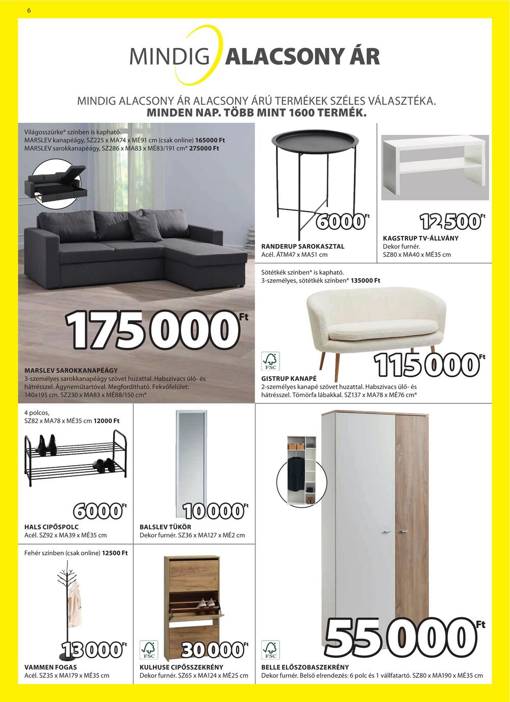6 MINDIG ALACSONY ÁR MINDIG ALACSONY ÁR ALACSONY ÁRÚ TERMÉKEK SZÉLES VÁLASZTÉKA. MINDEN NAP. TÖBB MINT 1600 TERMÉK. Világosszürke* színben is kapható. MARSLEV kanapéágy, SZ225 x MA74 x MÉ91 cm (csak online) 165000 Ft MARSLEV sarokkanapéágy, SZ286 x MA83 x MÉ83/191 cm* 275000 Ft 175000 Ft 6000* RANDERUP SAROKASZTAL Acél. ÁTM47 x MA51 cm Sötétkék színben is kapható. 3-személyes, sötétkék színben* 135000 Ft 12.500* KAGSTRUP TV-ÁLLVÁNY Dekor furnér. SZ80 x MA40 x MÉ35 cm MARSLEV SAROKKANAPÉÁGY 3-személyes sarokkanapéágy szövet huzattal. Habszivacs ülő- és hátrésszel. Ágyneműtartóval. Megfordítható. Fekvőfelület: 140×195 cm. SZ230 x MA83 x MÉ88/150 cm* 4 polcos, SZ82 x MA78 x MÉ35 cm 12000 Ft FSC GISTRUP KANAPÉ 115000* 2-személyes kanapé szövet huzattal. Habszivacs ülő- és hátrésszel. Tömörfa lábakkal. SZ137 x MA78 x MÉ76 cm* 6000** HALS CIPŐSPOLC Acél. SZ92 x MA39 x MÉ35 cm Fehér színben (csak online) 12500 Ft 10000* BALSLEV TÜKÖR Dekor furnér. SZ36 x MA127 x MÉ2 cm 130004 VAMMEN FOGAS Acél. SZ35 x MA179 x MÉ35 cm FSC 30000 KULHUSE CIPŐSSZEKRÉNY Dekor furnér. SZ65 x MA124 x MÉ25 cm FSC 55000* BELLE ELŐSZOBASZEKRÉNY Dekor furnér. Belső elrendezés: 6 polc és 1 vállfatartó. SZ80 x MA190 x MÉ35 cm