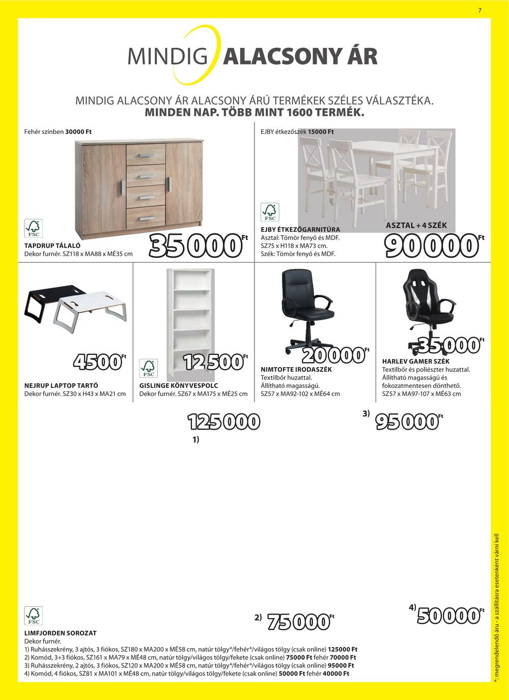 MINDIG ALACSONY ÁR MINDIG ALACSONY ÁR ALACSONY ÁRÚ TERMÉKEK SZÉLES VÁLASZTÉKA. MINDEN NAP. TÖBB MINT 1600 TERMÉK. EJBY étkezőszék 15000 Ft Fehér színben 30000 Ft FSC TAPDRUP TÁLALÓ Dekor furnér. SZ118 x MA88 x MÉ35 cm 35000** FSC EJBY ÉTKEZŐGARNITÚRA Asztal: Tömör fenyő és MDF. SZ75 x H118 x MA73 cm. Szék: Tömör fenyő és MDF. ASZTAL +4 SZÉK 90000** 4500″ NEJRUP LAPTOP TARTÓ Dekor furnér. SZ30 x H43 x MA21 cm FSC 12500 GISLINGE KÖNYVESPOLC Dekor furnér. SZ67 x MA175 x MÉ25 cm 125000 20000* NIMTOFTE IRODASZÉK Textilbőr huzattal. Állítható magasságú. SZ57 x MA92-102 x MÉ64 cm 3) +35,000* HARLEV GAMER SZÉK Textilbőr és poliészter huzattal. Állítható magasságú és fokozatmentesen dönthető. SZ57 x MA97-107 x MÉ63 cm 95000″ 1) FSC LIMFJORDEN SOROZAT Dekor furnér. 2) ” 75000″ 1) Ruhásszekrény, 3 ajtós, 3 fiókos, SZ180 x MA200 x MÉ58 cm, natúr tölgy*/fehér/világos tölgy (csak online) 125000 Ft 2) Komód, 3+3 fiókos, SZ161 x MA79 x MÉ48 cm, natúr tölgy/világos tölgy/fekete (csak online) 75000 Ft fehér 70000 Ft 3) Ruhásszekrény, 2 ajtós, 3 fiókos, SZ120 x MA200 x MÉ58 cm, natúr tölgy*/fehér*/világos tölgy (csak online) 95000 Ft 4) Komód, 4 fiókos, SZ81 x MA101 x MÉ48 cm, natúr tölgy/világos tölgy/fekete (csak online) 50000 Ft fehér 40000 Ft *50000* *: megrendelendő áru – a szállításra esetenként várni kell 7