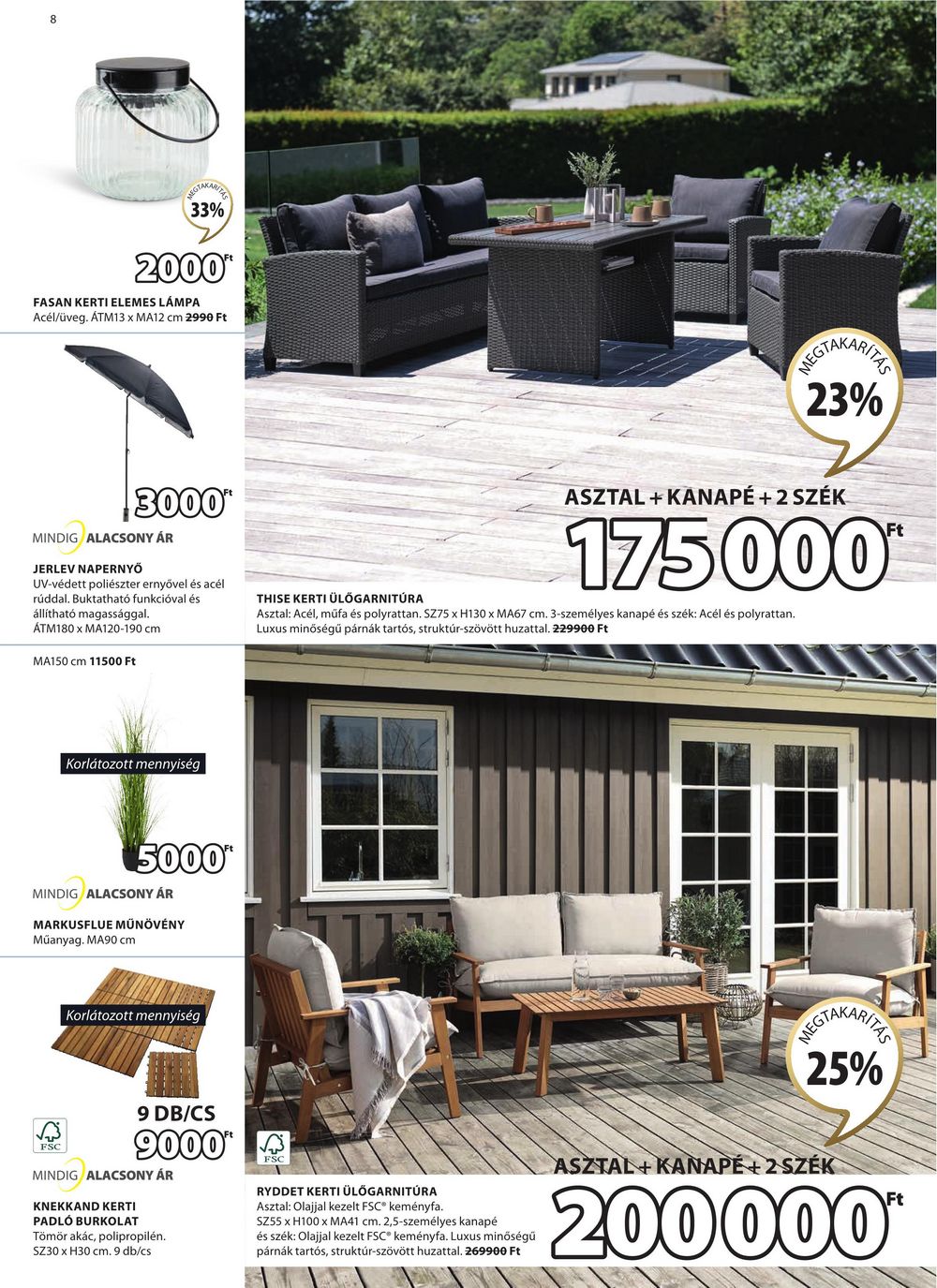 8 GTAKARITA 33% 2000** FASAN KERTI ELEMES LÁMPA Acél/üveg. ÁTM13 x MA12 cm 2990 Ft MEGTAKARITHE 23% 3000* MINDIG ALACSONY ÁR JERLEV NAPERNYŐ UV-védett poliészter ernyővel és acél rúddal. Buktatható funkcióval és állítható magassággal. ÁTM180 x MA120-190 cm. MA150 cm 11500 Ft THISE KERTI ÜLŐGARNITÚRA ASZTAL + KANAPÉ + 2 SZÉK 175000 Asztal: Acél, műfa és polyrattan. SZ75 x H130 x MA67 cm. 3-személyes kanapé és szék: Acél és polyrattan. Luxus minőségű párnák tartós, struktúr-szövött huzattal. 229900 Ft Korlátozott mennyiség *5000** MINDIG ALACSONY ÁR MARKUSFLUE MŰNÖVÉNY Műanyag. MA90 cm Korlátozott mennyiség יו FSC 9 DB/CS 9000** MINDIG ALACSONY ÁR KNEKKAND KERTI PADLÓ BURKOLAT Tömör akác, polipropilén. SZ30 x H30 cm. 9 db/cs RYDDET KERTI ÜLŐGARNITÚRA Asztal: Olajjal kezelt FSC keményfa. SZ55 x H100 x MA41 cm. 2,5-személyes kanapé és szék: Olajjal kezelt FSC keményfa. Luxus minőségű párnák tartós, struktúr-szövött huzattal. 269900 Ft. EGTAKARITS 25% ASZTAL+KANAPÉ + 2 SZÉK 200000 Ft Ft