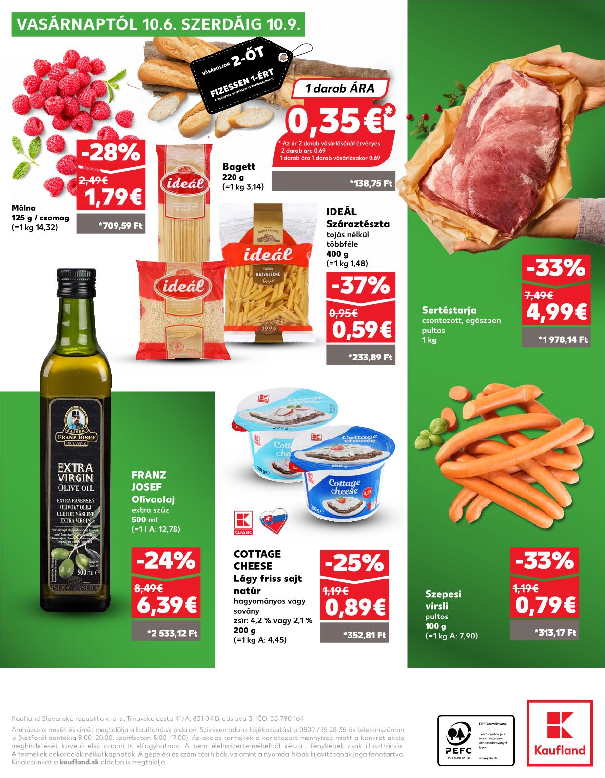 VASÁRNAPTÓL 10.6. SZERDÁIG 10.9. Málna 125 g/csomag (=1 kg 14,32) -28% 2,49€ 1,79€ *709,59 Ft ideál VÁSÁROLJON 2-ŐT FIZESSEN 1-ÉRT ATYMASSAL IS KOM Bagett 220 g (=1 kg 3,14) 1 darab ÁRA 0,35€ Az ár 2 darab vásárlásánál érvényes 2 darab ára 0,69 1 darab ára 1 darab vásárlásakor 0,69 ideál ideál BEZVAJEČNÉ 1994 *138,75 Ft IDEÁL Száraztészta tojás nélkül többféle 400 g (=1 kg 1,48) -37% 0,95€ 0,59€ *233,89 Ft Sertéstarja csontozott, egészben pultos 1 kg -33% 7,49€ 4,99€ *1978,14 Ft 200 g KAISER FRANZ JOSEF EXCLUSIVE EXTRA VIRGIN OLIVE OIL EXTRA PANENSKÝ OLIVOVY OLEJ ULEI DE MASLINE EXTRA VIRGIN Sisalivovided FRANZ JOSEF Olívaolaj extra szűz 500 ml (=11 A: 12,78) CLASSIC Cott che Cottage Volum 500 ml e ISER SER -24% 8,49€ 6,39€ *2 533,12 Ft COTTAGE CHEESE Lágy friss sajt natúr hagyományos vagy sovány zsír: 4,2 % vagy 2,1% 200 g (=1 kg A: 4,45) Cottage cheese Cottage cheese -25% 1,19€ 0,89€ Szepesi virsli pultos *352,81 Ft 100 g (=1 kg A: 7,90) Kaufland Slovenská republika v. o. s., Trnavská cesta 41/A, 831 04 Bratislava 3, IČO: 35 790 164 Áruházaink nevét és címét megtalálja a kaufland.sk oldalon. Szívesen adunk tájékoztatást a 0800/15 28 35-ös telefonszámon is (hétfőtől péntekig 8:00-20:00, szombaton 8:00-17:00). Az akciós termékek a korlátozott mennyiség miatt a konkrét akció meghirdetését követő első napon is elfogyhatnak. A nem élelmiszertermékekről készült fényképek csak illusztrációk A termékek dekorációk nélkül kaphatók. A gépelési és számítási hibák, valamint a nyomdai hibák kijavításának joga fenntartva. Kinálatunkat a kaufland.sk oldalon is megtalálja. PEFC PEFC/23-31-86 PEFC certifikované Tento výrobok je z trvalo udržate obhospodarovaných lesov www.pefc.sk -33% 1,19€ 0,79€ *313,17 Ft Kaufland