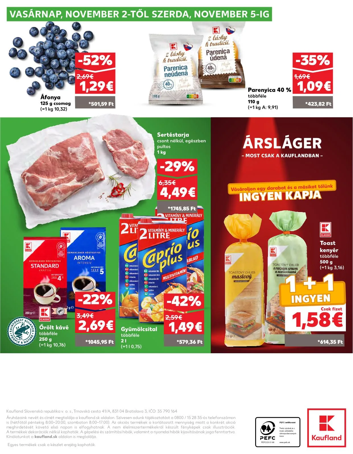 Áruházaink nevét és címét megtalálja a kaufland.sk oldalon. Szívesen adunk tájékoztatást a 0800/15 28 35 telefonszámon is (hétfőtől péntekig 8:00-20:00, szombaton 8:00-17:00). Az akciós termékek a korlátozott mennyiség miatt a konkrét akció meghirdetését követő első napon is elfogyhatnak. A nem élelmiszertermékekről készült fényképek csak illusztrációk. A termékek dekorációk nélkül kaphatók. A gépelési és számítási hibák, valamint a nyomdai hibák kijavításának joga fenntartva. Kínálatunkat a kaufland.sk oldalon is megtalálja.