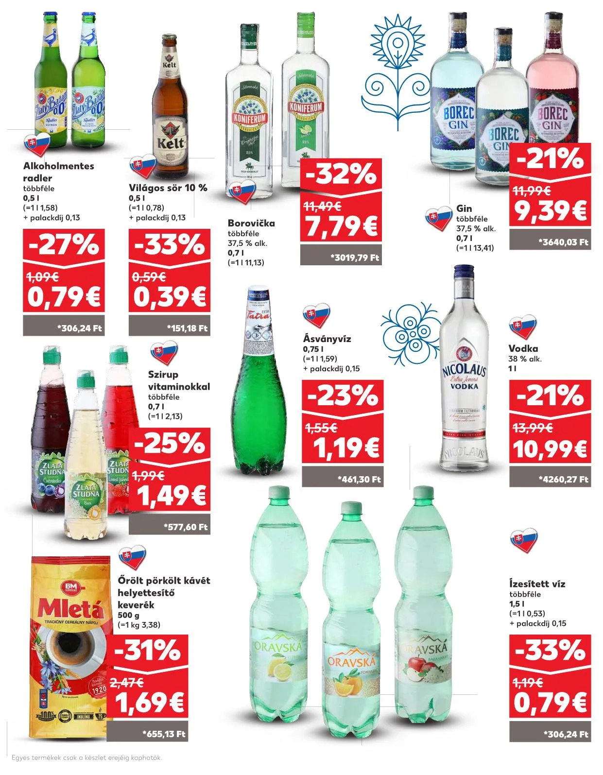 - Szeszes ital (többféle, 36-40 % alk.) – Ár: 0,71€ (1 kg = 1110,84 Ft)