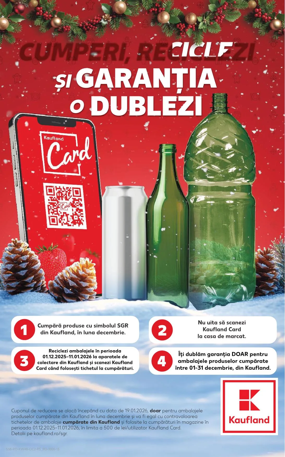Îți dublăm garanția DOAR pentru ambalajele produselor cumpărate între 01-31 decembrie, din Kaufland. Cuponul de reducere se alocă începând cu data de 19.01.2026, doar pentru ambalajele produselor cumpărate din Kaufland în luna decembrie, és va fi egal cu contravaloarea tichetelor de ambalaje cumpărate din Kaufland și folosite la cumpărături în magazine în perioada 01.12.2025-11.01.2026, în limita a 500 de lei/utilizator Kaufland Card.