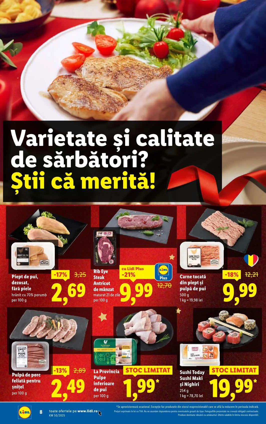 Catalogul érvényes 8.12-14.12.2025 közötti időszakra és tartalmazza az 8.12-14.12.2025 között érvényes ajánlatokat. A kedvezmények 8.12-10.12.2025, 11.12-14.12.2025, és 13.12-14.12.2025 időpontokra vonatkozóan is érvényesek.