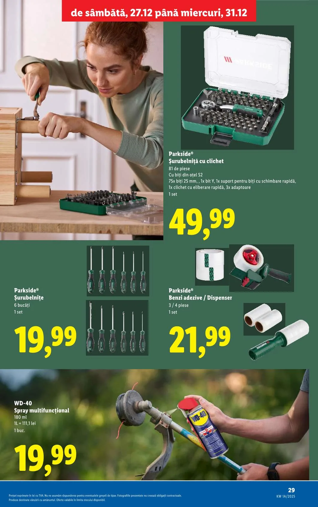 Prețuri exprimate în lei cu TVA. Nu ne asumăm răspunderea pentru eventualele greşeli de tipar. Fotografiile prezentate nu creează obligații contractuale. Produse destinate vânzării cu amănuntul. Oferte valabile în limita stocului disponibil. Ajánlat időtartama: de sâmbătă, 27.12 până miercuri, 31.12.