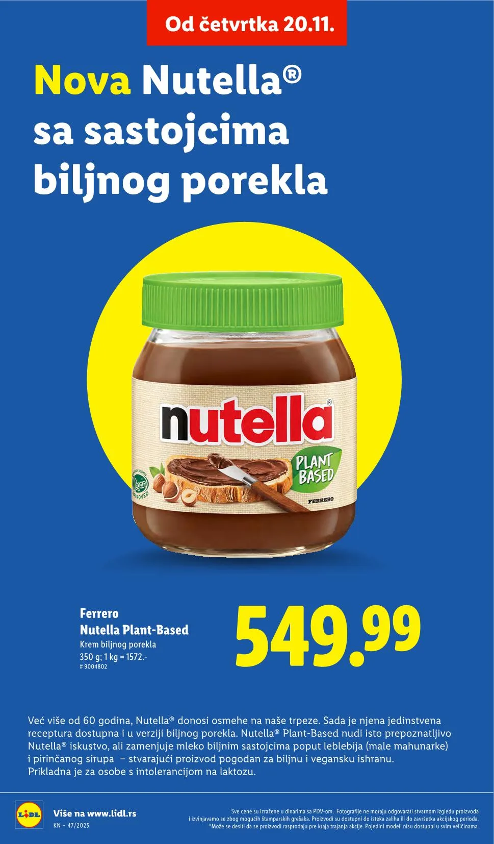 Već više od 60 godina, Nutella® donosi osmehe na naše trpeze. Sada je njena jedinstvena receptura dostupna i u verziji biljnog porekla. Nutella® Plant-Based nudi isto prepoznatljivo Nutella® iskustvo, ali zamenjuje mleko biljnim sastojcima poput leblebija (male mahunarke) i pirinčanog sirupa – stvarajući proizvod pogodan za biljnu i vegansku ishranu.