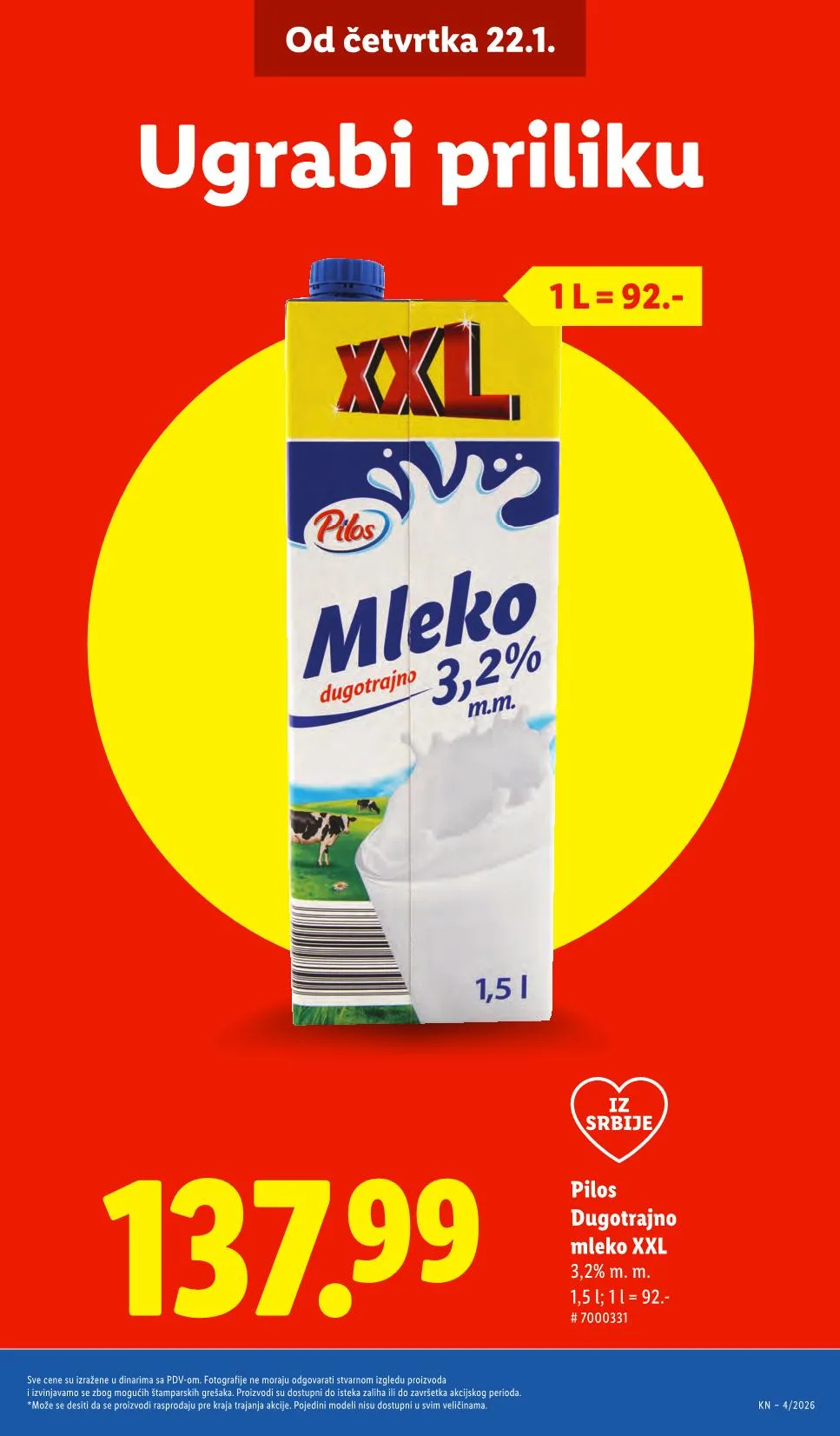 - Pilos – Dugotrajno mleko XXL: 3,2% m.m. – 1,5L = 11-92 din.