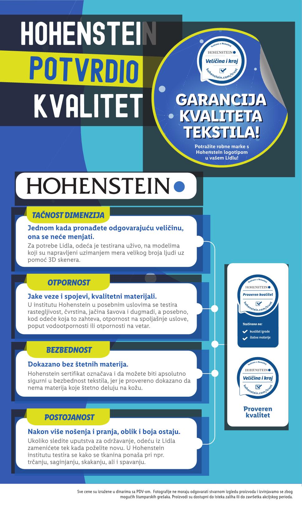 HOHENSTEIN POTVRDIO KVALITET Testirana u Nemačkal HOHENSTEIN Veličina i kroj in.com/trust hohenstein GARANCIJA • KVALITETA TEKSTILA! Potražite robne marke s Hohenstein logotipom u vašem Lidlu! HOHENSTEIN⚫ TAČNOST DIMENZIJA Jednom kada pronađete odgovarajuću veličinu, ona se neće menjati. Za potrebe Lidla, odeća je testirana uživo, na modelima koji su napravljeni uzimanjem mera velikog broja ljudi uz pomoć 3D skenera. OTPORNOST Jake veze i spojevi, kvalitetni materijali. U institutu Hohenstein u posebnim uslovima se testira rastegljivost, čvrstina, jačina šavova i dugmadi, a posebno, kod odeće koja to zahteva, otpornost na spoljašnje uslove, poput vodootpornosti ili otpornosti na vetar. Nenalka HOHENSTEIN Proveren kvalitet Testirano na: ✓ kualitet izrade štetne materije BEZBEDNOST Dokazano bez štetnih materija. Hohenstein sertifikat označava i da možete biti apsolutno sigurni u bezbednost tekstila, jer je provereno dokazano da nema materija koje štetno deluju na kožu. POSTOJANOST Nakon više nošenja i pranja, oblik i boja ostaju. Ukoliko sledite uputstva za održavanje, odeću iz Lidla zamenićete tek kada poželite novu. U Hohenstein institutu testira se kako se tkanina ponaša pri npr. trčanju, saginjanju, skakanju, ali i spavanju. HOHENSTEIN◆ Veličina i kroj henstein.com/tru Proveren kvalitet Sve cene su izražene u dinarima sa PDV-om. Fotografije ne moraju odgovarati stvarnom izgledu proizvoda i izvinjavamo se zbog mogućih štamparskih grešaka. Proizvodi su dostupni do isteka zaliha ili do završetka akcijskog perioda.