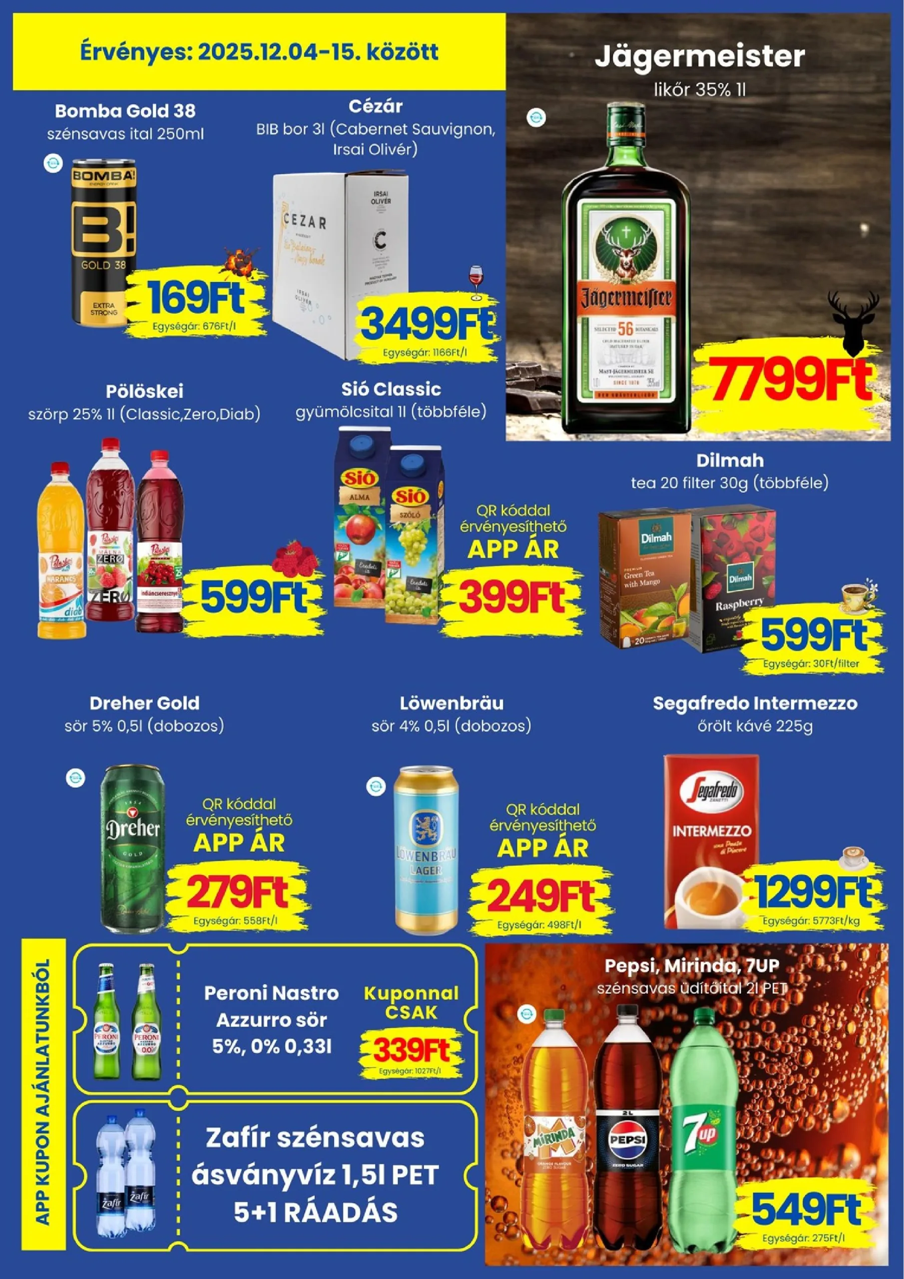 A feltüntetett ajánlatok mindkét áruházunkban 2025.12.04-15. között, illetve a készlet erejéig érvényesek! Az árak az ÁFA-t tartalmazzák és forintban értendők! Az árak csak áruházainkban helyben történő vásárláskor érvényesek! A képek illusztrációk! A 18. életévét be nem töltött személyeknek a hatályos jogszabályok szerint alkoholtartalmú és energiaitalt nem szolgálunk ki! A DRS díjas termékek jelöléseit keresse a terméken, amely +50 Ft/db!