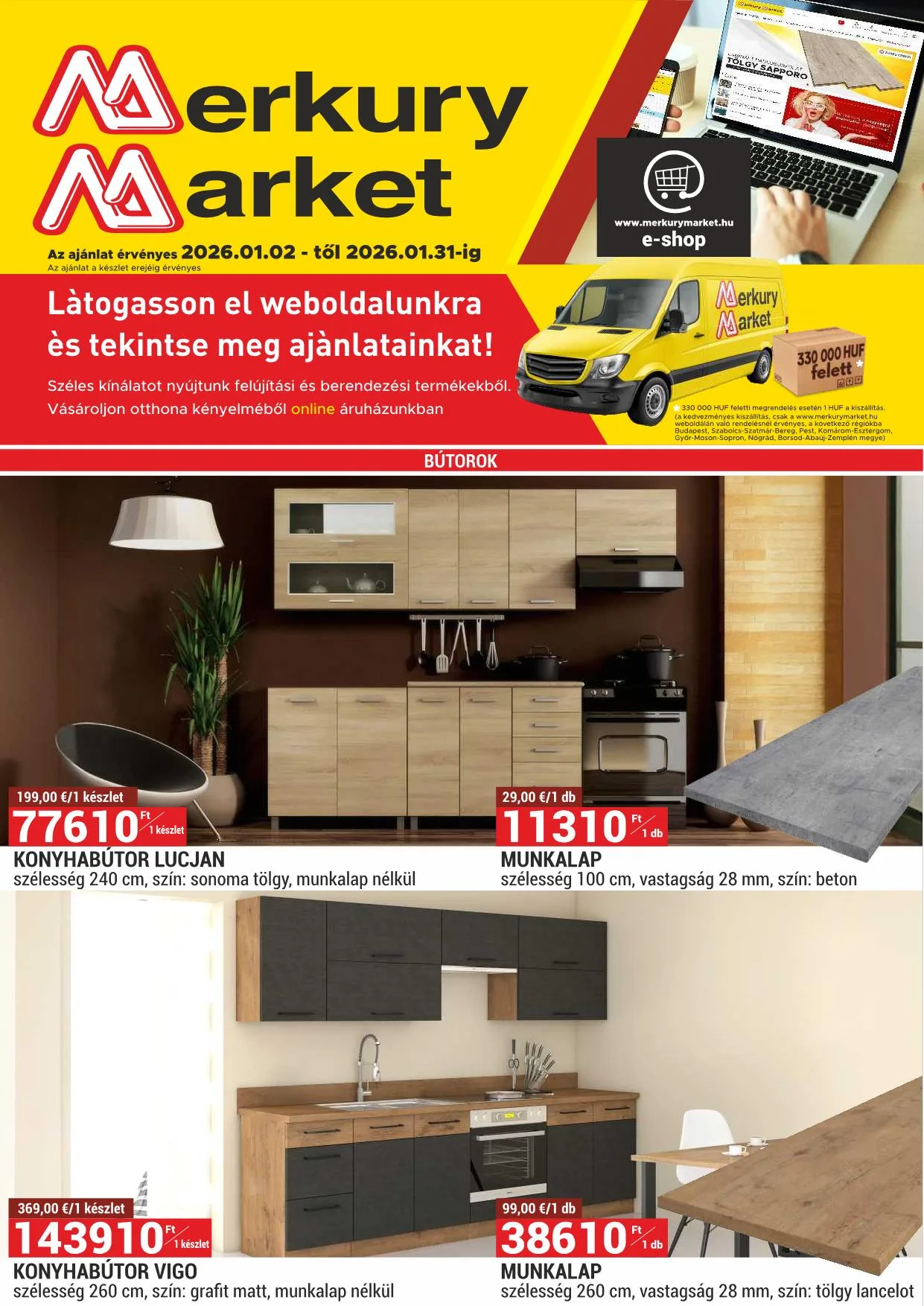Kiszállítás: 330 000 HUF feletti megrendelés esetén 1 HUF a kiszállítás. (A kényes kiszállítás csak a www.merkurymarket.hu weboldalon való rendelésnél érvényes, a következő régiókba: Budapest, Szabolcs-Szatmár-Bereg, Pest, Komárom-Esztergom, Győr-Moson-Sopron, Nógrád, Borsod-Abaúj-Zemplén megye.)