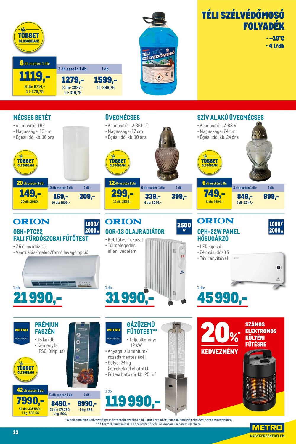 -1 TOBBET OLCSÓBBAN! 6 db esetén 1 db: 1119,- 6 db: 6714,- 11:279,75 MÉCSES BETÉT • Azonosító: TBZ • Magassága: 10 cm • Égési idő: kb. 16 óra -14 ТОВВЕТ OLCSÓBBAN! 20 db esetén 1 db: 149,- 20 db: 2980,- ORION OBH-PTC22 1 db: METRO 21.990,- PROFESSIONAL FALI FÜRDŐSZOBAI FŰTŐTEST • 7,5 órás időzítő • Ventilálás/meleg/forró levegő opció -14 TÖBBET OLCSÓBBAN! 13 3 db esetén 1 db: 1 db: 1279,- 1599,- 11:399,75 10 db esetén 1 db: 169,- 10 db: 1690,- PRÉMIUM FASZÉN 3 db: 3837,- 11:319,75 42 db: 335580,- 1 kg: 532,66 •15 kg/db • Keményfa (FSC, DINplus) 1 db: 209,- 154 1000/ 2000 ÜVEGMÉCSES Azonosító: LA 351 LT Magassága: 17 cm • Egési idő: kb. 10 óra -1 ТОВВЕТ OLCSÓBBAN! 12 db esetén 1 db: 299,- 12 db: 3588,- 1 db: TÉLI-19°C SZÉLVÉDŐMOSÓ ORION OOR-13 OLAJRADIÁTOR • Két fűtési fokozat • Túlmelegedés elleni védelem METRO 6 db esetén 1 db: 339,- 6 db: 2034,- 31990,- PROFESSIONAL GÁZÜZEMŰ FŰTŐTEST** • Teljesítmény: 12 kW 42 db esetén 1 db: 1 db: 21 db esetén 1 db: 1 db: 7990,- 8490,- 9990,- 119 990,- 21 db: 178 290,- 1 kg: 666,- 1kg: 566,- Anyaga: alumínium/ rozsdamentes acél • Súlya: 24 kg (kerekekkel ellátott) • Fűtési hatókör kb. 25 m² 1 db: 399,- www. 2500 W TÉLI SZÉLVÉDŐMOSÓ FOLYADÉK . -19°C • 41/db SZÍV ALAKÚ ÜVEGMÉCSES Azonosító: LA 83 V • Magassága: 24 cm • Égési idő: kb. 24 óra -1 ТОВВЕТ OLCSÓBBAN! 6 db esetén 1 db: 749,- 6 db: 4494,- ORION OPH-22W PANEL HŐSUGÁRZÓ • LED kijelző .24 órás időzítő • Távirányítóval 3 db esetén 1 db: 849,- 3 db: 2547,- 1 db: 45 990,- 20%* KEDVEZMÉNY *A polccímkék a kedvezményt már tartalmazzák! A cikklistát keresd áruházainkban! Más akcióval nem összevonható. ** A termék budakalászi és székesfehérvári áruházainkban nem elérhető. 1 db: 999,- % KÜLTÉRI FŰTÉSRE 1000/ 2000W SZÁMOS ELEKTROMOS www METRO NAGYKERESKEDELEM