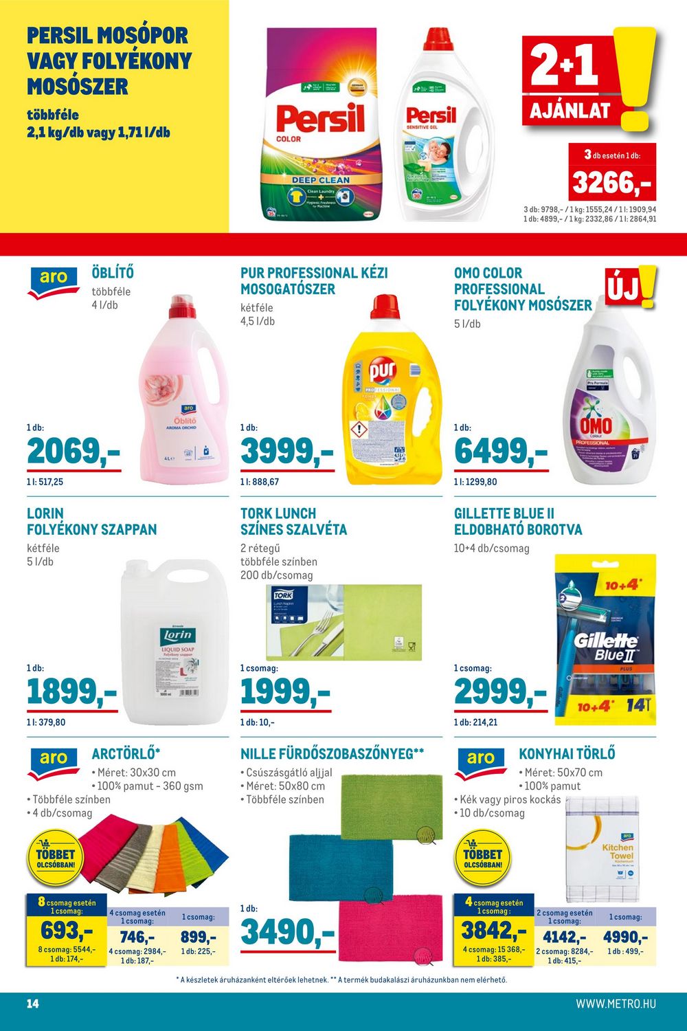PERSIL MOSÓPOR VAGY FOLYÉKONY MOSÓSZER többféle 2,1 kg/db vagy 1,71 l/db aro 1 db: 2069,- 11:517,25 LORIN FOLYÉKONY SZAPPAN kétféle 51/db 1 db: 1899,- 11: 379,80 ÖBLÍTŐ többféle 41/db aro –W ТОВВЕТ OLCSÓBBAN! • Többféle színben • 4 db/csomag 14 8 csomag esetén 1 csomag: 693,- 8 csomag: 5544,- 1 db: 174,- Oblitö AROMA ORCHO ALO ARCTÖRLŐ* • Méret: 30×30 cm 100% pamut-360 gsm Lorin LIQUID SOAP 4 csomag esetén 1 csomag: b 746,- 4 csomag: 2984,- 1 db: 187,- 1 db: Persil kétféle 4,5 l/db COLOR PUR PROFESSIONAL KÉZI MOSOGATÓSZER DEEP CLEAN 3999,- 11: 888,67 Clean Laundry ←+4 TORK LUNCH SZÍNES SZALVÉTA 1 db: 10,- 2 rétegű többféle színben 200 db/csomag 1 db: TORK 1 csomag: 1999,- ! 1 csomag: 899,- 3490,- 1db: 225,- pur 1023 MESH NILLE FÜRDŐSZOBASZŐNYEG** • Csúszásgátló aljjal • Méret: 50×80 cm • Többféle színben Persil SENSITIVE GEL 1 db: OMO COLOR PROFESSIONAL FOLYÉKONY MOSÓSZER 51/db 11:1299,80 6499,- 1 db: 214,21 2+1 AJÁNLAT 1 csomag: 2999,- aro 3 db esetén 1 db: 3266,- 3 db: 9798,-/1 kg: 1555,24/11: 1909,94 1 db: 4899,-/1 kg: 2332,86/11: 2864,91 GILLETTE BLUE II ELDOBHATÓ BOROTVA 10+4 db/csomag — TÖBBET OLCSÓBBAN! • Kék vagy piros kockás • 10 db/csomag 4 csomag esetén 1 csomag: *A készletek áruházanként eltérőek lehetnek. A termék budakalászi áruházunkban nem elérhető. B OMO UJ PROFESSIONAL 10+4 Gillette BlueII KONYHAI TÖRLŐ • Méret: 50×70 cm • 100% pamut 4 csomag: 15 368,- 2 csomag: 8284,- 1 db: 385,- 1 db: 415,- 10+4 14T – Kitchen Towel 2 csomag esetén 1 csomag: 1 csomag: 3842,- 4142,- 4990,- 1 db: 499,- WWW.METRO.HU