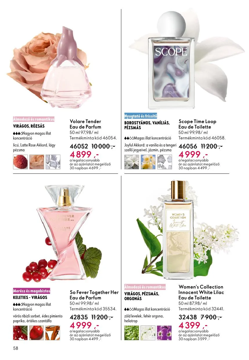 - Magas illatkoncentráció: barack, fehér frézia, pézsma