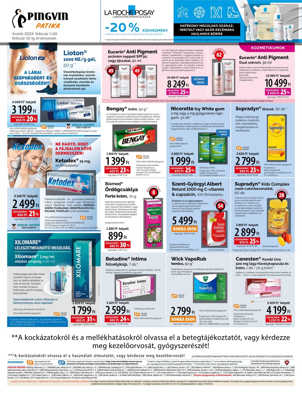 PINGVIN PATIKA Áraink 2024. február 1-töl február 15-ig érvényesek. Lioton gel A LÁBAI SZÉPSÉGÉÉRT ÉS EGÉSZSÉGÉÉRT! 4 009 Ft helyett 3 199 Ft 3 149 Ft’ helyett 2 499 Ft M KEDVEZMÉNY 650 Ft legységár: 124.95 Ft/db) €21% KEDVEZMÉNY 20% 810 Ft legységár: 63.98 Ft/g) EP. BERLIN-CHEMIE M MENARINI Vény nélkül kapható gyógyszer Hatóanyag heparin-natrium Forgalmazo BERLIN-CHEMIE/AMENARINI K 0087 Budapest, Hung ria krt 30/A)-HU-OTC-03-2023-V01-ad-#36612 Lezárás datuma 20230512 Ketodex BERLIN-CHEMIE MENARINI KAPHATÓ Hatóanyaga perceken belül szünteti meg az orrdugu- lást, és hatása általában 12 lastes nasa órán át fennáll. Tartósitó- szer-mentes orrspray. Felbontás után 6 hónapig használható! Hatóanyag: xilometazolin-hidroklorid Veny nélkül kapható gyógyszer Lioton® 1000 NE/g gél, 50 g** Visszérbetegség tünetei- nek enyhítésére, szövőd- mények kezelésére illetve véraláfutás, zúzódás és duzzanat kezelésére alkalmazható gél. Lioton 1000 NE Al Lioton 1000 NE NE HAGYD, HOGY A FÁJDALOM KÖVÉ DERMESSZEN! Xilomare® 1 mg/ml oldatos orrspray, 1-10 ml” Ketodex® 25 mg. 20 filmtabletta” Ketodex Fájdalomcsillapitó és gyulladáscsökkentó hatású gyógyszer enyhe vagy közepesen súlyos fájdalmak, mint például MOZGÁS- SZERVI FÁJDALMAK, MENSTRUÁCIÓS FÁJ- DALMAK, FOGFÁJÁS tüneti kezelésére. XILOMAREⓇ LÉLEGZETMEGINDÍTÓ MEGOLDÁS. Veny nélkül kapható gyógyszer Hatóanyag dexketoprofen EP. Forgalmazó BERLIN-CHEMIE/AMENARINI K 0067 Budapest, Hungária krt. 30/A HU-OTC-03-2023-V01-ad-#36612. Lezárás dituma 2023 05.12 My King HORAIRA Gyermekeknek szánt változata is kedvezményes áron kapható! EP. Forgalmazo Richter Gedeon Nyrt. 1203 Budapest Gyout 19-21. Melekhatás bejelentes +36 1 505 7032 medinfognichter hu 62/2024/OTC LZD-20231213 KAPHATÓ XILOMARE Ing KAPHAT KEDVEZMENY LA ROCHE POSAY LABORATOIRE DERMATOLOGIQUE 810 Ft 31% legységar 179.90 Ft/ml -20% KEDVEZMÉNY LIPIKAR VACY CICAPLAST BORÁPOLO VÁSÁRLÁSAKORT *** Az akció 2004. január 15-16 2004 februar 29-ig ényes minden La Roche-Posay Caplates Lipikar temere a Partnerek Maksutom Eucerin Anti Pigment maztatott Thiamidol tartalmának köszön arckrém nappali SPF30, vagy éjszakai, 50 ml hetben csökkentheti a meglévó foltokat az arcbórón Ahozzáadott UVA, UVB szúrók va- lamint 30-as fényvédó faktor hatékony vé delmet nyújtanak a hiperpigmentációt kivál to napsugárzás ellen Az éjszakai arckrém szintén csökkentheti a sötét foltokat és se githeti az éjszakai sejtmegújulást is BONUS 49 buceri facerin BONUS 49 1819 Ft’ helyett 1399 Ft Bengay® krém. 50 g” Az izületek és izmok mérsékett fájdalmainak és merev ségének atmeneti csökkentésére felnótteknek. Mentol tartalmának köszönhetően húsitó érzetet biztosit me- til-szalicilát tartalma révén fájdalomcsillapító hatású HINGAY BENGAY KEDVEZMÉNY 23% 420 Ft legységár: 27.98 Ft/g) Biomed® Ördögcsáklya Forte krém, 70 g forin Helyi bemasszírozásra ajánlott elhúzódó mozgásszervi problé mák kopások időszakában, sajgo testrészeken alkalmazva borápo lasi cella Megnövelt hatóanyag tartalommal, hozzáadott kajeput és eukaliptusz illóolajokkal Gyógynövényes krém 1289 Ft helyett 899 Ft KEDVEZMÉNY 30% 390 Ft egységár 12.84 FU/g) 7a 2 609 Ft helyett 3 429 Ft helyett 1799 Ft 2599 Ft Betadine® Intima hüvelykúp, 7 db” EP. KAPHAT Veny nélkül kapható gyógyszer Hatóanyag met-szalic mentol Forgalmazza UNTL Consumer Health Hungary Kft 1112 Budapest Balatoni út 2/a feceris Betadine Intima ki – Alkalmas bakteriális és gombás hüvelyi fertőzés. Tricho- monas vaginalis kezelésére egyaránt KEDVEZMÉNY 25 3 500 Ft legységár 349.97 Ft/m A kozmetikai akcios kinat patikankent elbed lehet kérjük tájékozodjon az érintett gyógyszertárban az adott termek elerhetosegérd A kozmetikai ajánlat a készlet erejéig érvényes! Supradyn® drazsé, 30 db** Magas hatóanyag tartalmú multivita- 8 Ⓒomed inpicesian Anim- DUNE EGIS Hatóanyag povidon-jod EP KAPHATO KEDVEZMENY 24% Vinynek kapható gyógyszer 830 Ft legységar 371.29 Ft/dbl HATÉKONY MEGOLDÁS SZÁRAZ, IRRITÁLT VAGY AKÁR EKCÉMÁRA HAJLAMOS BÖRRE 10 999 Ft helyett 8 249 Ft KEDVEZMÉNY 2750 Ft 25 legység 35498 Ft/m AZONOS ARON EP. KAPAK Veny nekül kaphato gyógyszerek 2 669 Ft helyett 1999 Ft Nicorette Icy White gum 2 mg vagy 4 mg gyógyszeres rágó- gumi, 30 db” A megvonás tüneteit csökkentve segíti a dohányzásról való leszokást. Alkalmazható a dohányzás átmeneti fel- függesztésére vagy csökkentésére is AZONOS ARON nicore nicorette Erősitsen rá az egészségére! C-vitaminnal a vitalitásert, kapszaicin- net az egészséges testsúlyért Hosszan tartó hatású étrend- kiegészitó filmtabletta 5 499 Ft BOMBA ÁRON legységár: 54.99 Ft/db) progn vigogu Gyartja es forgalmazza Goodwill Pharma Nyrt. 6724 Szeged, Cserzy Mihaly u 32 IXI A EP. promocos kamber (7) sem kk KEDVEZMÉNY 670 Ft 25% Forgalmazza INTL Consumer legységár: 66.63 Ft/db Health (Hungaryl Kft 1112 Budapest, Balatoni út 2/a. Szent-Györgyi Albert Retard 1000 mg C-vitamin & capsaicin, 100 filmtabletta Wick VapoRub kenőcs, 50 g” KAPHA E0 62 Excers WICK plodyszer vikaboum WICK VapoRub Eucerin HUSZPON 54 O Meghüléses panaszok enyhítésére ajánlott bedörzsö lésre vagy inhalálásra használható kenőcs 1000 Étrend-kiegészit Szent- Györgyi Albert CAPSAICIN Leve 2799 Ft Forgalmazza: P&G Hungary Kkt. BOMBA ÁRON 1082 Budapest, Kisfaludy utca 38. +36-1-451-1250 legysegar: 55.98 Ft/gl MAT-HU-UNBRANDED-23-000006 Veny nélkapható gyógyszer KOZMETIKUMOK Eucerin Anti Pigment Dual szérum, 30 ml Kettos hatás szérum thiamidollal és hialuronsavval Hatékonyan csökkenti a sötét foltokat és megakada- yozza ujboli kiala- kulásukat 13 999 Ft helyett Ujávarazsolja a bor megjeleneset 10 499 Ft min vitaminhiány megelőzésére és kezelésére. ■ 22.COM E