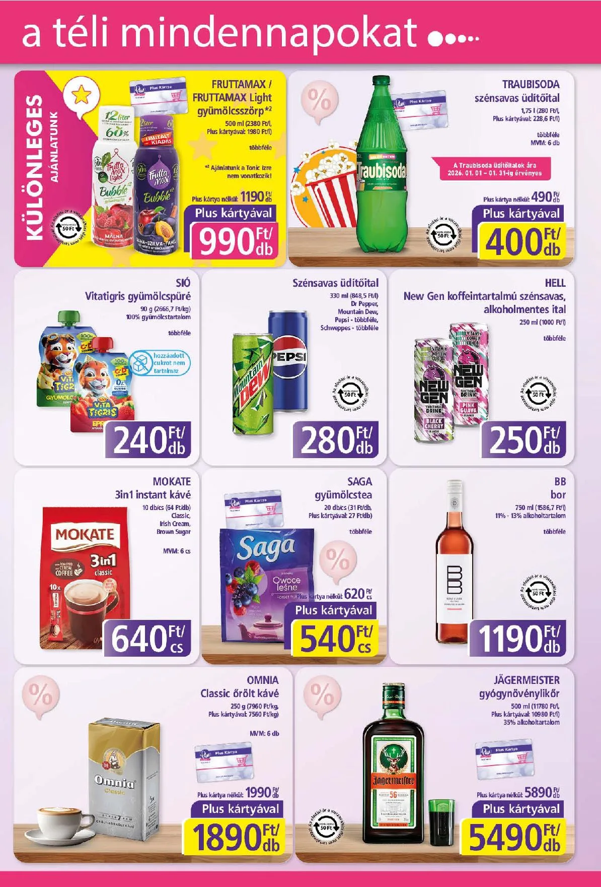 Fogyás termékek már a szórólap érvényességi idejének első napján elfogyhatnak! MVM = Maximálisan Vásárolható Mennyiség vásárló / nap. A lila színnel jelölt üzleteinkben non-food termékek nem kaphatók. A kedvezmények nem összevonhatóak, így a Plus kártyával olcsóbban vásárolt termékek után nem gyűjthető további pont.