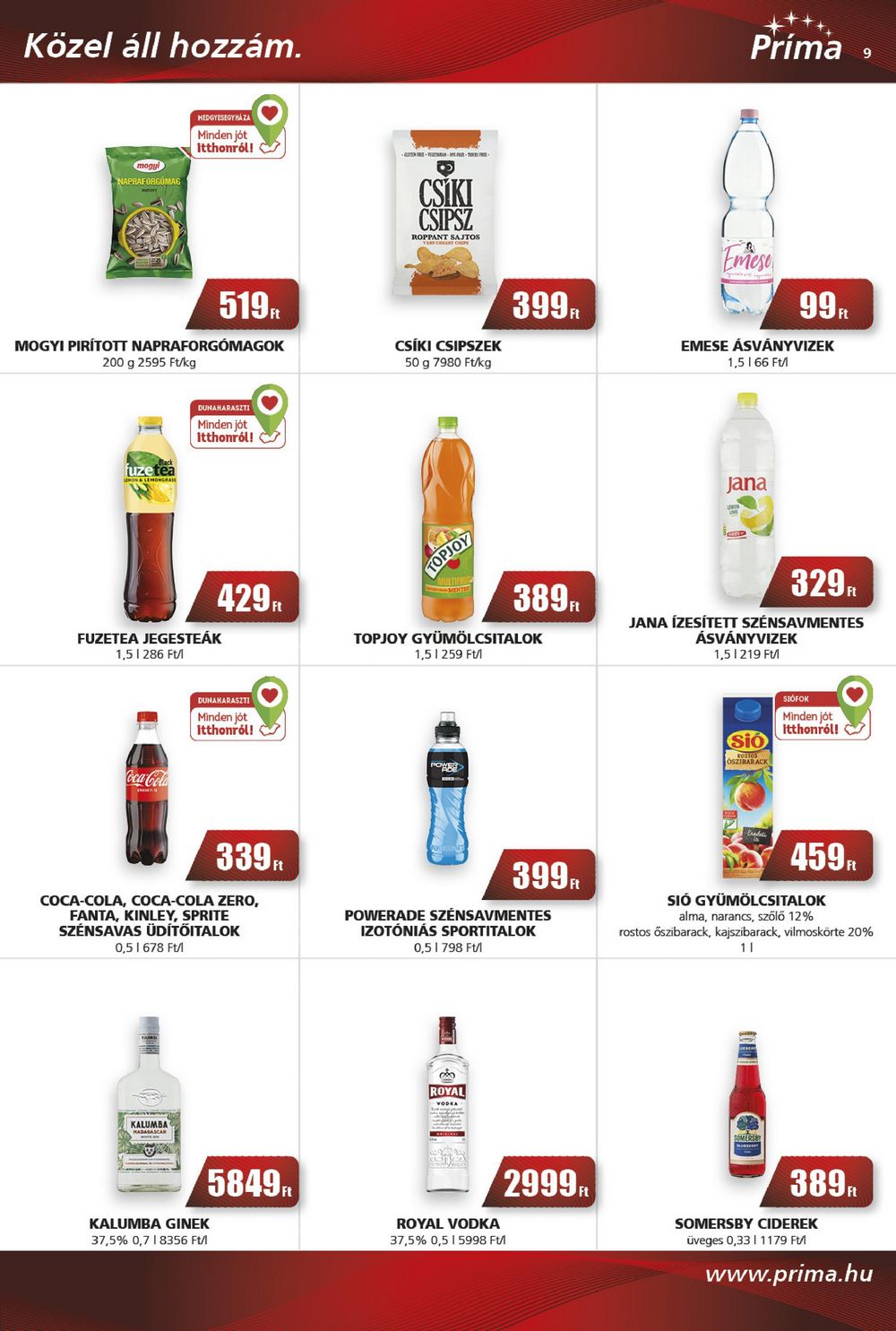 Közel áll hozzám. NAPRAFORGÓMAG PERY 519 MOGYI PIRÍTOTT NAPRAFORGÓMAGOK 200 g 2595 Ft/kg fuzetea Coca-Cola HEDGYESEGYHÁZA Minden jót Itthonról! FUZETEA JEGESTEÁK 1,51 286 Ft/l KALUMBA MADAGASCAR DUNAHARASZTI Minden jót Itthonról! AN 429 Ft DUNAHARASZTI Minden jót Itthonról! COCA-COLA, COCA-COLA ZERO, FANTA, KINLEY, SPRITE SZÉNSAVAS ÜDÍTŐITALOK 0,5 1 678 Ft/ 339Ft KALUMBA GINEK 37,5% 0,718356 Ft/l 5849Ft -GT-EN-FRE CSIKI CSIPSZ ROPPANT SAJTOS CSÍKI CSIPSZEK 50 g 7980 Ft/kg KA TOPJOY POWIE TOPJOY GYÜMÖLCSITALOK 1,51 259 Ft/ 1772 399 Ft do ROYAL 389 Ft POWERADE SZÉNSAVMENTES IZOTÓNIÁS SPORTITALOK 0,5 1 798 Ft/l ROYAL VODKA 37,5% 0,5 1 5998 Ft/ 399 Ft 2999Ft Príma 9 Emeso EMESE ÁSVÁNYVIZEK 1,51 66 Ft/ Jana iamp 99Ft 329 JANA ÍZESÍTETT SZÉNSAVMENTES ÁSVÁNYVIZEK 1,5 1219 Ft/l Sió OSZIBARACK SIÓFOK Minden jót Itthonról! 459ft SIÓ GYÜMÖLCSITALOK alma, narancs, szőlő 12% rostos őszibarack, kajszibarack, vilmoskörte 20% 11 389ft SOMERSBY CIDEREK üveges 0,331 1179 Ft/ www.prima.hu