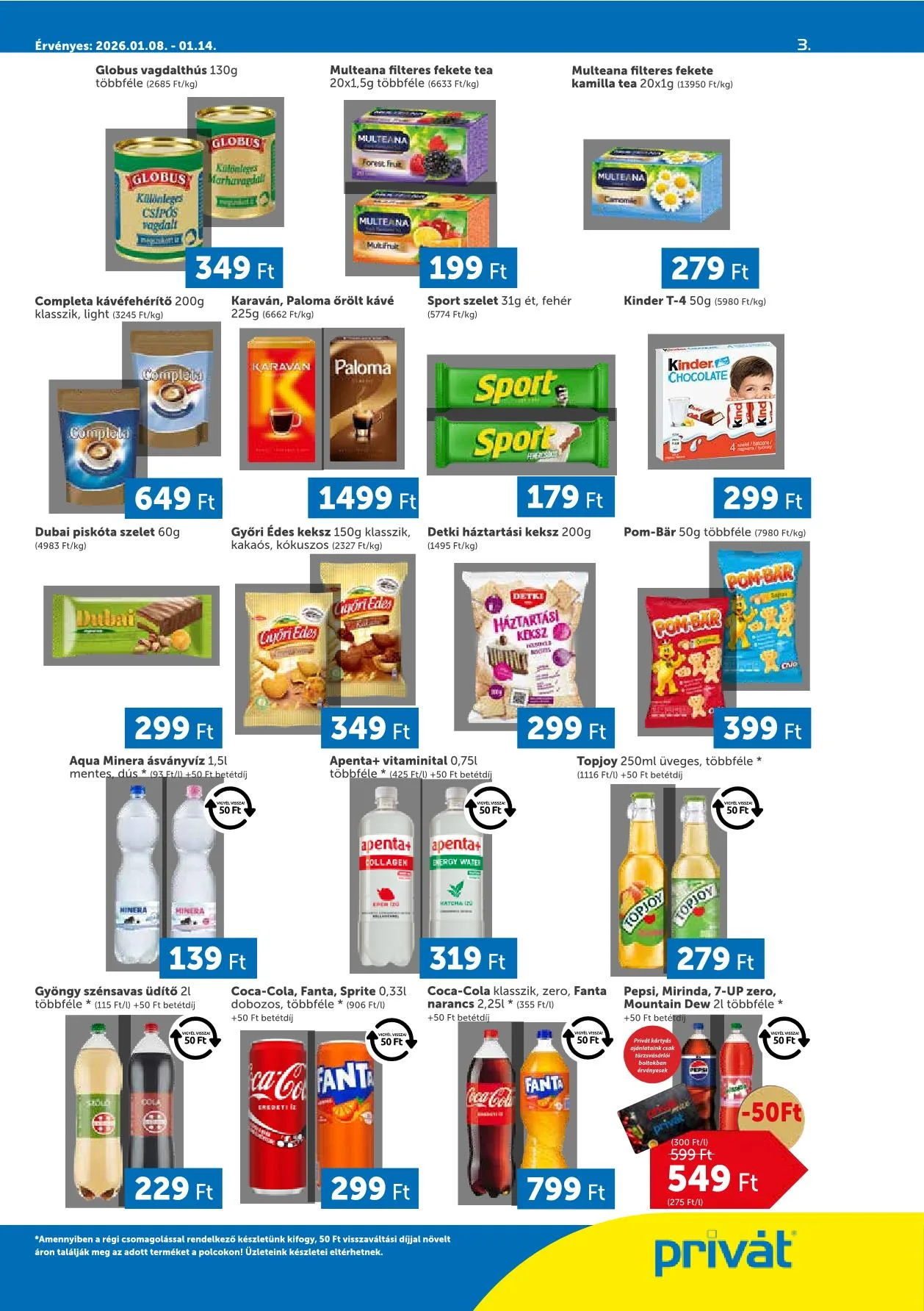 – Amennyiben a régi csomagolással rendelkező készletünk kifogy, 50 Ft visszaváltási díjjal növelt áron találják meg az adott terméket a polcokon! Üzleteink készletei eltérhetnek.