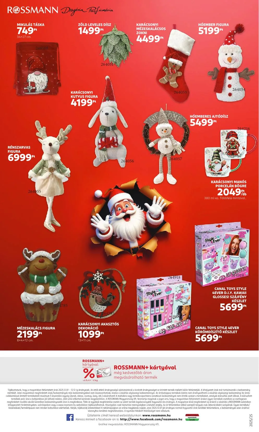 Tájékoztatunk, hogy a magazinban feltüntetett árak 2025.12.01-12.12-ig érvényesek. Az ettől eltérő érvényességű ajánlatainknál a konkrét érvényességet az érintett termék mellett külön feltüntetjük. A kihelyezett árak már tartalmazzák a kedvezmény mértékét. Jelen magazinban meghirdetett árak/kedvezmények más kedvezményekkel nem összevonhatóak, kivéve a vásárlás végösszegi kedvezménnyel. Az árrésstoppos termékek körére nem érvényesíthető a vásárlás végösszegi kedvezmény. Az árrés-csökkentéssel érintett termékekből maximum 5 kiszerelési egység (darab, doboz, csomag, üveg stb.) vásárolható. A márkákra vagy termékcsoportokra vonatkozó kedvezmények nem érintik azokat a termékeket, amelyek kiárusítás alatt állnak. A kiárusított termékek polci árai a boltjainkban jól látható módon, zöld színű etikettel kerülnek megjelenítésre. A ROSSMANN Magyarország Kft. fenntartja magának a jogot arra, hogy a magazinban feltüntetett árakat egyes termékek esetében az esetlegesen meghirdetett további akciók keretében kedvezményesebb áron is meghirdesse. Több ár egyidejű meghirdetése esetén az adott termék legalacsonyabb fogyasztói ára érvényes. A magazinon kívül meghirdetett új árakról a vásárlók a ROSSMANN üzleteiben kifüggesztett hirdetményeken, szórólapokon vagy a www.rossmann.hu weboldalon tájékozódhatnak. Kiszolgálás csak háztartási mennyiségben a készlet erejéig. Az ár feltüntetése nélkül szereplő tárgyak csak dekorációként szolgálnak. Egyes termékek/kiszerelések/terméktípusok nem minden boltunkban elérhetőek. Kérjük, tájékozódj üzleteinkben! A reklámújságban az online megjelenés napján, azaz 2025.12.01-jén érvényes normál fogyasztói árak kerültek feltüntetésre, a kedvezmények ezen árakhoz viszonyítva kerültek meghatározásra. A nyomdai hibákért felelősséget nem vállalunk.