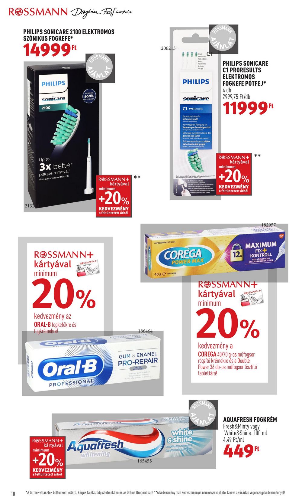 ROSSMANN Drogéria Parfüméria PHILIPS SONICARE 2100 ELEKTROMOS SZÓNIKUS FOGKEFE* 14999Ft 10 2132 PHILIPS GEO sonicare 2100 Up to 3x better plaque removal’ than a manual toothbrush sonic technology ROSSMANN+ kártyával minimum REPPANN+ 20% kedvezmény az ORAL-B fogkefékre és fogkrémekre! Oral-B PROFESSSS ROSSMANN + kártyával Oral-B PROFESSIONAL minimum +20% KEDVEZMÉNY a feltüntetett árból AuctieS * ROSSMANN+ kártyával Aquafresh +20% minimum whitening KEDVEZMÉNY a feltüntetett árból 186464 GUM & ENAMEL PRO-REPAIR Redules guminitation Clinically proven technology 165455 206213 MÜFOCSORRÖGZÍTŐKREM 40ge MENTES 4 int 4 PHILIPS fease sonicare C1 ProResults Exceptional clean for better gum health Hervorragende Reinigung zur Verbesserung der Zahnfleischgesundheit Handbu white & Shine Nettoyage exceptionnel pour des gencives plus saines une brà dents Puliza eccezionale per un migliore stato di salute delle gengive Celfyhtsbetal Cou 2005 COREGA POWER MAX PHILIPS SONICARE C1 PRORESULTS ELEKTROMOS FOGKEFE PÓTFEJ* 4 db 2999,75 Ft/db 11999Ft ROSSMANN + kártyával minimum +20% KEDVEZMÉNY a feltüntetett árból 12h ** MAXIMUM FIX+ KONTROLL VÉD A BESZORULÓ ÉTELMARADÉKOK ELLEN ROSSMANN+ kártyával minimum 182957 ROSSMANN + Keppn 20% kedvezmény a COREGA 40/70 g-os műfogsor rögzítő krémekre és a Double Power 36 db-os műfogsor tisztító tablettára! AQUAFRESH FOGKRÉM Fresh&Minty vagy White&Shine. 100 ml 4,49 Ft/ml 449 Ft *A termékválaszték boltonként eltérő, kérjük tájékozódj üzleteinkben és az Online Drogériában! **A kedvezmény más kedvezménnyel nem összevonható, kivéve a vásárlás végösszegi kedvezménnyel!