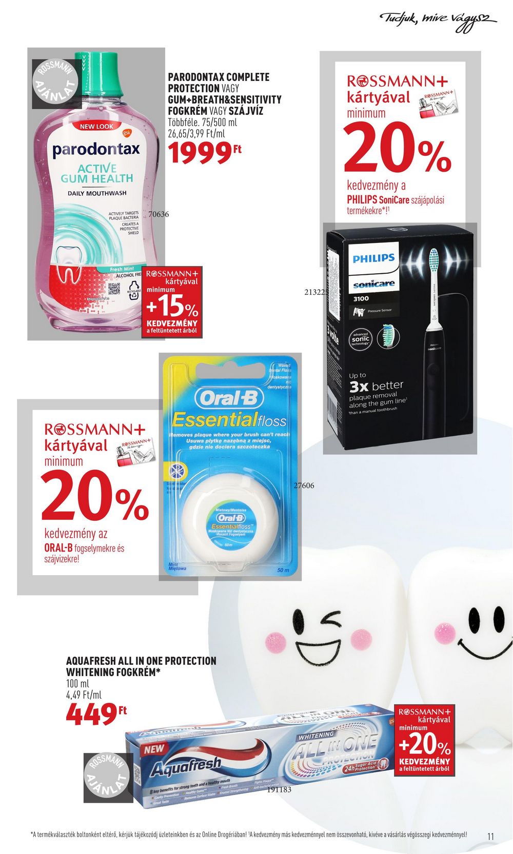 NEW LOOK parodontax 1999Ft ACTIVE GUM HEALTH DAILY MOUTHWASH ACTIVELY TARGETS PLAQUE BACTERIA CREATES A PROTECTIVE SHIELD to Fresh Mint ALCOHOL FRE ROSSMANN + kártyával ROSSMANN+ kártyával minimum H 70636 ROSSMANN+ PARODONTAX COMPLETE PROTECTION VAGY GUM+BREATH&SENSITIVITY FOGKRÉM VAGY SZÁJVÍZ Többféle. 75/500 ml 26,65/3,99 Ft/ml minimum +15% KEDVEZMÉNY a feltüntetett árból 20% kedvezmény az ORAL-B fogselymekre és szájvizekre! 100 ml 4,49 Ft/ml 449Ft NEW Oral-B Essentialfloss temoves plaque where your brush can’t reach Usuwa plytkę nazębną z miejsc, gdzie nie dociera szczoteczka Mint Miętowa AQUAFRESH ALL IN ONE PROTECTION WHITENING FOGKRÉM* ANDTERIAL Mietowy/Manteles Oral-B Essentialfloss Woskowane Nic dentystyczna 50m Waxed antal Floss Moskowan dentystyczna Aquafresh 8 key benefits for strong teeth and a healthy mouth Cavity Prevention at Tante 50 m Surface Sta Eumer String And Backen 191183 21322 27606 ROSSMANN+ kártyával minimum Tudjuk, mive vágysz 20% kedvezmény a PHILIPS SoniCare szájápolási termékekre*!¹ PHILIPS sonicare 3100 AW Pressure Sensor sonic ROSSMANN+ Up to 3x better plaque removal along the gum line” than a manual toothbrush ROSSMANN+ kártyával minimum WHITENING ALL IN ONE +20% 24h Protection KEDVEZMÉNY a feltüntetett árból *A termékválaszték boltonként eltérő, kérjük tájékozódj üzleteinkben és az Online Drogériában! ‘A kedvezmény más kedvezménnyel nem összevonható, kivéve a vásárlás végösszegi kedvezménnyel! 11