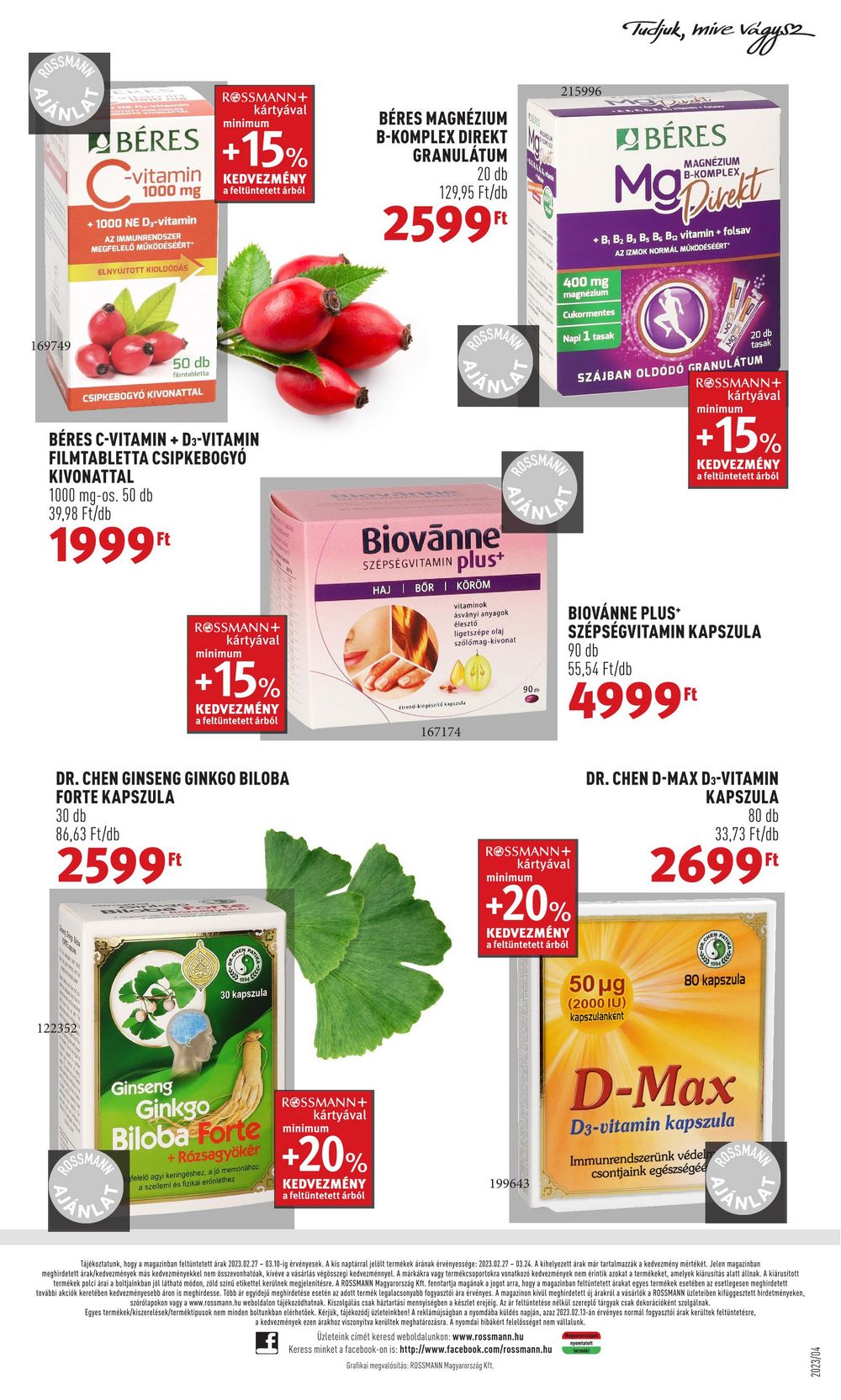 169749 ROSSMANN+ kártyával minimum BÉRES +15% C -vitamin 1000 mg KEDVEZMÉNY a feltüntetett árból +1000 NE D-vitamin AZ IMMUNRENDSZER MEGFELELŐ MŰKÖDÉSÉÉRT ELNYÚJTOTT KIOLDÓDÁS 25 50 db filmtabletta BÉRES C-VITAMIN + D3-VITAMIN FILMTABLETTA CSIPKEBOGYÓ KIVONATTAL 1000 mg-os. 50 db 39,98 Ft/db 1999Ft 122352 CSIPKEBOGYÓ KIVONATTAL ROSSMANN+ kártyával DR. CHEN GINSENG GINKGO BILOBA FORTE KAPSZULA 30 db 86,63 Ft/db 2599 Ft minimum +15% KEDVEZMÉNY a feltüntetett árból NIVE F 30 kapszula Ginseng Ginkgo Biloba Forte + Rózsagyökér felelő agyi keringéshez, a jó memóriához. a szellemi és fizikai erőnléthez ROSSMANN+ kártyával BÉRES MAGNÉZIUM B-KOMPLEX DIREKT GRANULÁTUM minimum +20% KEDVEZMÉNY a feltüntetett árból 20 db 129,95 Ft/db 2599Ft Biovanne SZÉPSÉGVITAMIN plus+ HAJI BOR I KÖRÖM ROSSMANN vitaminok ásványi anyagok élesztő ligetszépe olaj szőlőmag-kivonat etrend-kiegészitá kapszula 167174 90 215996 199643 400 mg magnézium Cukormentes Napi 1 tasak ROSSMANN+ kártyával Üzleteink címét keresd weboldalunkon: www.rossmann.hu Keress minket a facebook-on is: http://www.facebook.com/rossmann.hu Grafikai megvalósítás: ROSSMANN Magyarország Kft. Tudjuk, mive vágysz minimum +20% KEDVEZMÉNY a feltüntetett árból Sve BÉRES + B₁ B₂ B₂ B B B vitamin + folsav AZ IZMOK NORMÁL MŰKÖDÉSÉÉRT MAGNÉZIUM B-KOMPLEX SZÁJBAN OLDÓDÓ GRANULÁTUM 50 μg (2000 IU) kapszulánként BIOVÁNNE PLUS* SZÉPSÉGVITAMIN KAPSZULA 90 db 55,54 Ft/db 4999Ft 20 db tasak ROSSMANN+ kártyával minimum +15% KEDVEZMÉNY a feltüntetett árból DR. CHEN D-MAX D3-VITAMIN KAPSZULA 80 db 33,73 Ft/db 2699Ft 80 kapszula D-Max D3-vitamin kapszula Immunrendszerünk védel ROSSMANN csontjaink egészségéé Tájékoztatunk, hogy a magazinban feltüntetett árak 2023.02.27 – 03.10-ig érvényesek. A kis naptárral jelölt termékek árának érvényessége: 2023.02.27 – 03.24. A kihelyezett árak már tartalmazzák a kedvezmény mértékét. Jelen magazinban meghirdetett árak/kedvezmények más kedvezményekkel nem összevonhatóak, kivéve a vásárlás végösszegi kedvezménnyel. A márkákra vagy termékcsoportokra vonatkozó kedvezmények nem érintik azokat a termékeket, amelyek kiárusítás alatt állnak. A kiárusított termékek polci árai a boltjainkban jól látható módon, zöld színű etikettel kerülnek megjelenítésre. A ROSSMANN Magyarország Kft. fenntartja magának a jogot arra, hogy a magazinban feltüntetett árakat egyes termékek esetében az esetlegesen meghirdetett további akciók keretében kedvezményesebb áron is meghirdesse. Több ár egyidejű meghirdetése esetén az adott termék legalacsonyabb fogyasztói ára érvényes. A magazinon kívül meghirdetett új árakról a vásárlók a ROSSMANN üzleteiben kifüggesztett hirdetményeken, szórólapokon vagy a www.rossmann.hu weboldalon tájékozódhatnak. Kiszolgálás csak háztartási mennyiségben a készlet erejéig. Az ár feltüntetése nélkül szereplő tárgyak csak dekorációként szolgálnak. Egyes termékek/kiszerelések/terméktípusok nem minden boltunkban elérhetõek. Kérjük, tájékozódj üzleteinkben! A reklámújságban a nyomdába küldés napján, azaz 2023.02.13-án érvényes normál fogyasztói árak kerültek feltüntetésre, a kedvezmények ezen árakhoz viszonyitva kerültek meghatározásra. A nyomdai hibákért felelősséget nem vállalunk. 70/EZOZ