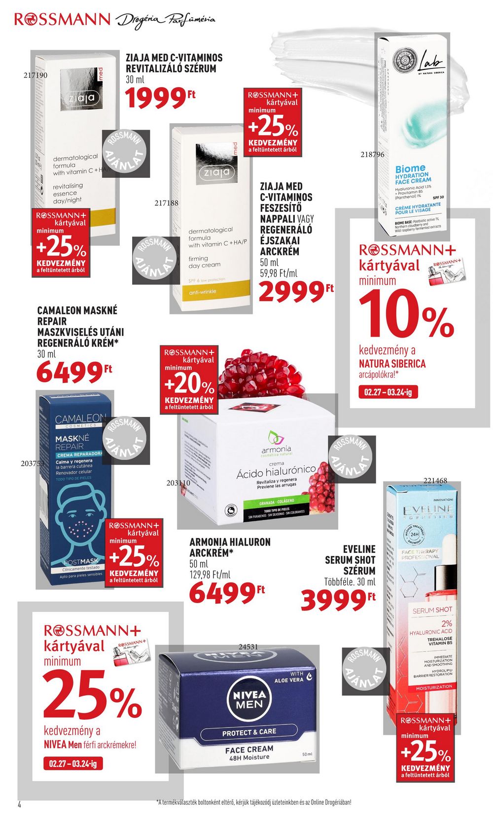 Rouge Velvet Ink 16857 220375 ROSSMANN+ kártyával minimum kedvezmény a BOURJOIS dekorkozmetikai termékekre¹!³ ROSSMANN+ kártyával minimum MAX FACTORX MIRACLE PURE SKIN-IMPROVING FOUNDATION 24H HVNGATIONI MAX FACTOR FACEFINITY COMPACT 15% kedvezmény a ESSIE körömlakkokra¹!2 HYALURONIC VITAMIN C SPF30 PA+++ AR 75 GOLDEN RN+1 ROSSMANN+ kártyával minimum ROSSMANN+ H ROSSMANN+ 215319 25% kedvezmény a MAX FACTOR Miracle Pure alapozókra és a Facefinity Compact púderekre¹! WERKING VÝLMATE AKUPRIN CHERCH essie vemis à ongle 1 2 3 220599 minimum L’ORÉAL PRO XXL SZEMPILLASPIRÁL¹ Többféle. 5299 Ft ROSSMANN + kártyával L’ORÉAL COLOR RICHE SLIM AJAKRÚZS¹ Többféle. 4499Ft Kétféle. +15% KEDVEZMÉNY a feltüntetett árból 02.27-03.24-ig L’ORÉAL BROW ARTIST SKINNY DEFINER SZEMÖLDÖK CERUZA¹ Kétféle. 02.27-03.24-ig 4199Ft MAYBELLINE 184840 02.27-03.24-ig MATTE INK SUPER STAY 22004 the COLOSSAL (CURL Tudjuk, mive vágysz 213911 2 MAYBELLINE THE COLOSSAL CURL BOUNCE SZEMPILLASPIRÁL¹ BOUNCE 02.27-03.24-ig 02.27-03.24-ig 3 MAYBELLINE ULTRA SLIM SZEMÖLDÖKCERUZA¹ Többféle. [VOLUME] 02.27-03.24-ig 3 ROSSMANN+ kártyával minimum +10% KEDVEZMÉNY a feltüntetett árból FOLYÉKONY AJAKRÚZS¹ Többféle. MAYBELLINE SUPER STAY MATTE INK 2899db PRE DEEP BROWN BROW ULTRA SLIM 194134 197136 2999 1699Ft ‘A termékválaszték boltonként eltérő, kérjük tájékozódj üzleteinkben és az Online Drogériában! A kedvezmény más kedvezménnyel nem összevonható, kivéve a vásárlás végösszegi kedvezménnyel! A kedvezmény nem vonatkozik az Essie Gel Couture és U Wish kollekciókra, a körömápolókra és az Essie Kit termékekre! A kedvezmény más kedvezménnyel nem összevonható, kivéve a vásárlás végösszegi kedvezménnyel! 3